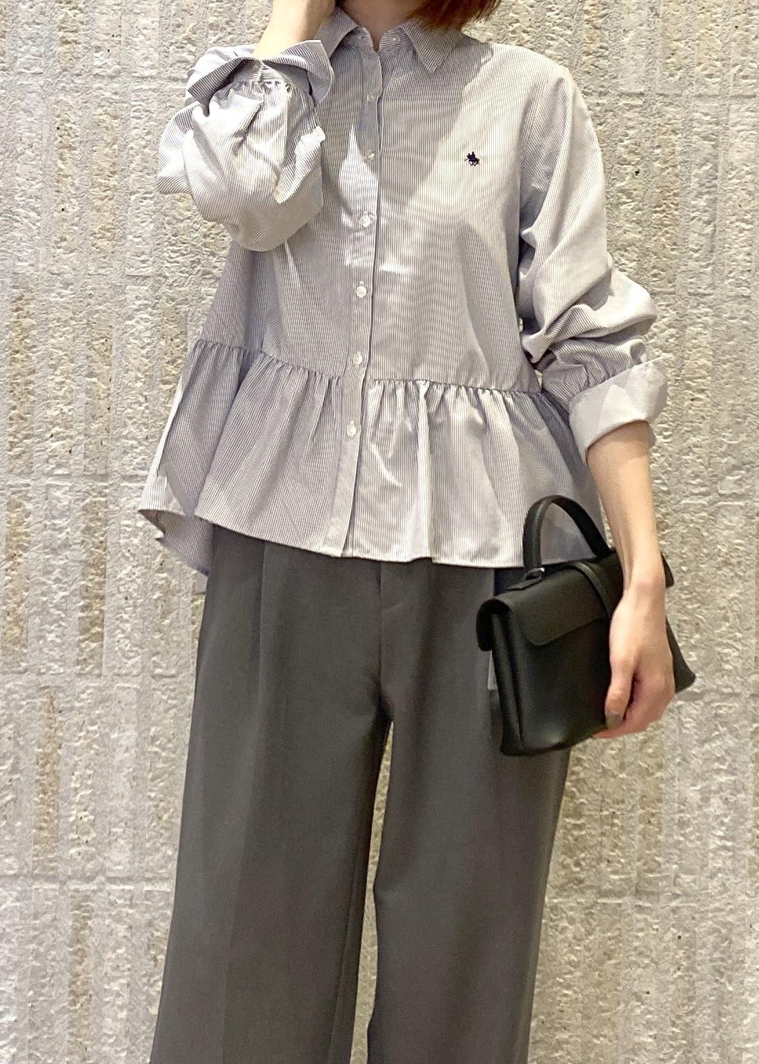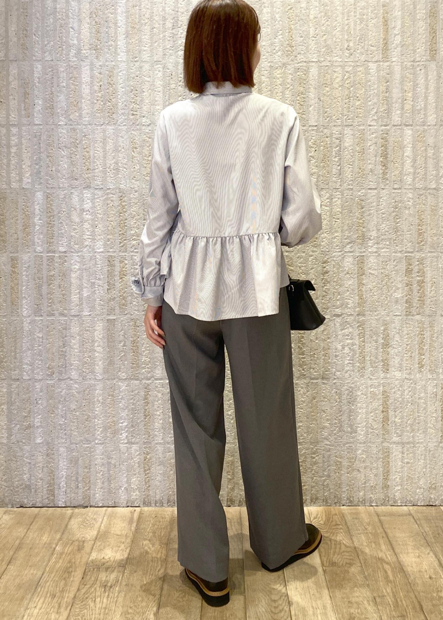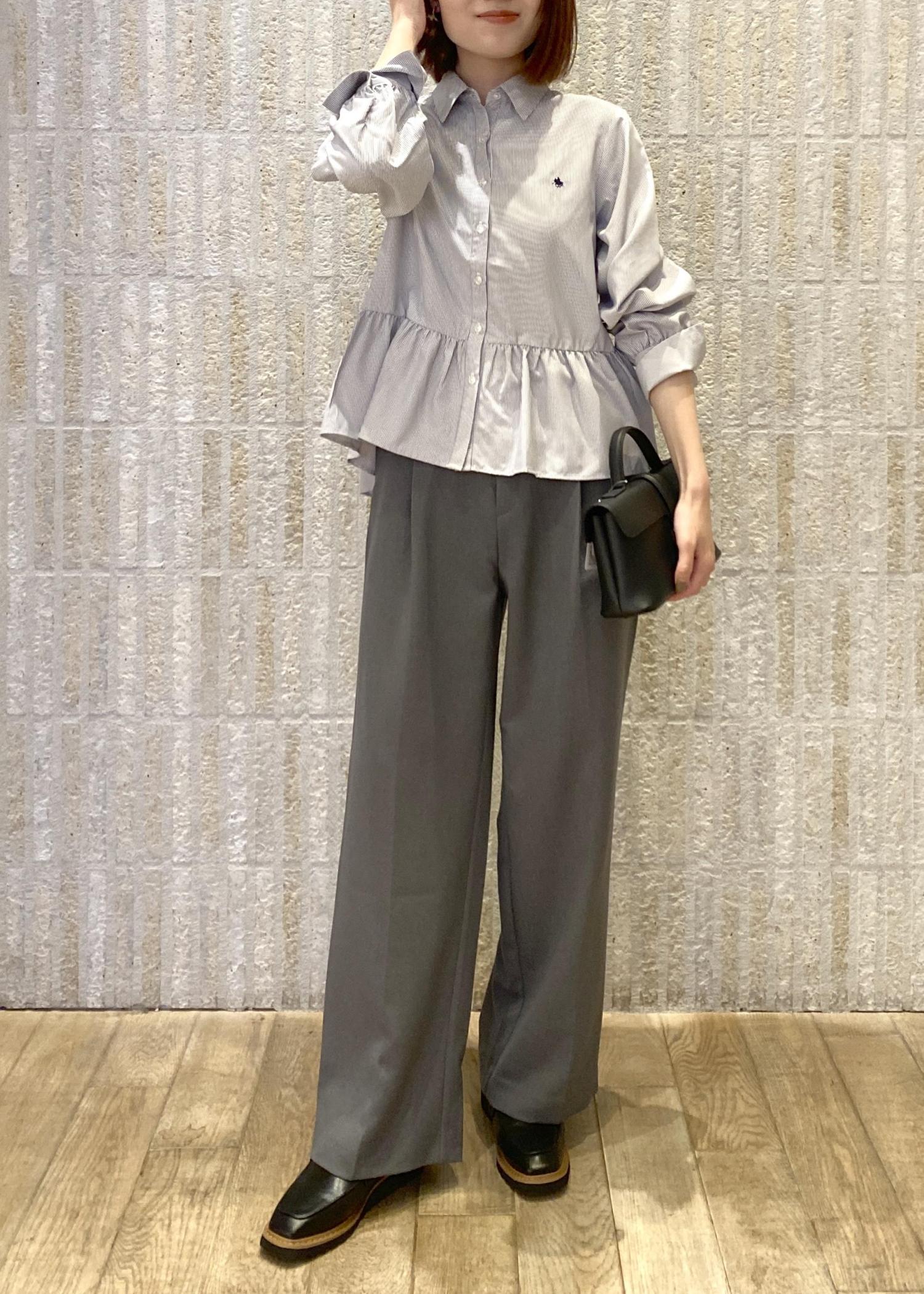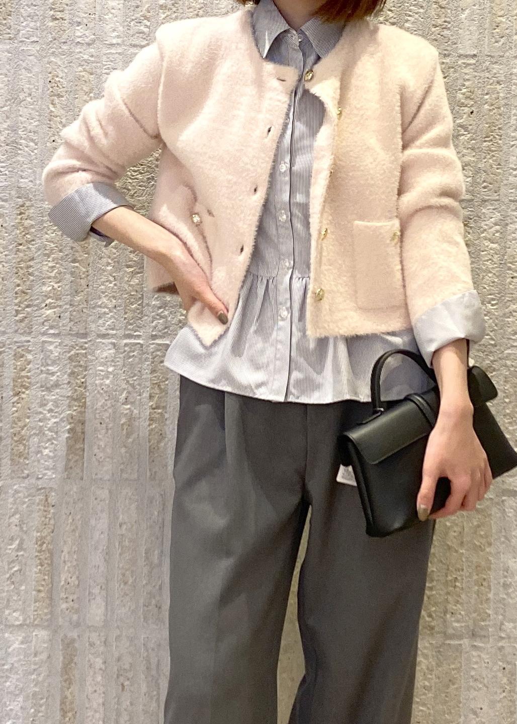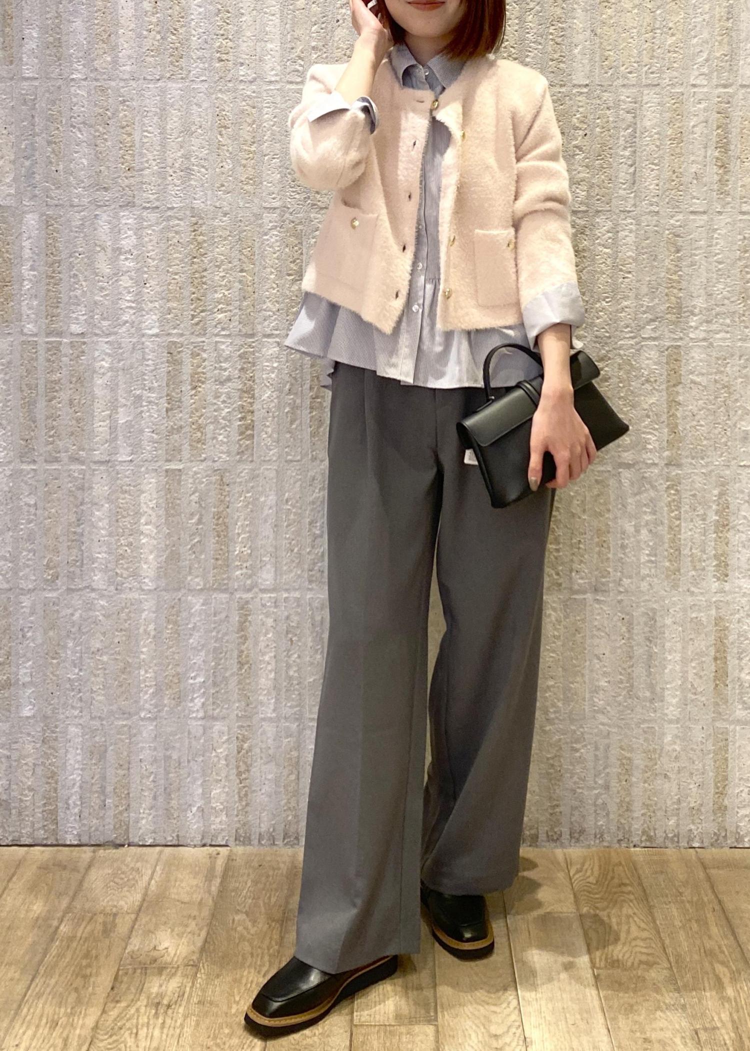 ペプラムシルエットのシャツにコンパクトな丈感のメタルボタンカーディガンを合わせたレイヤードスタイルです!
