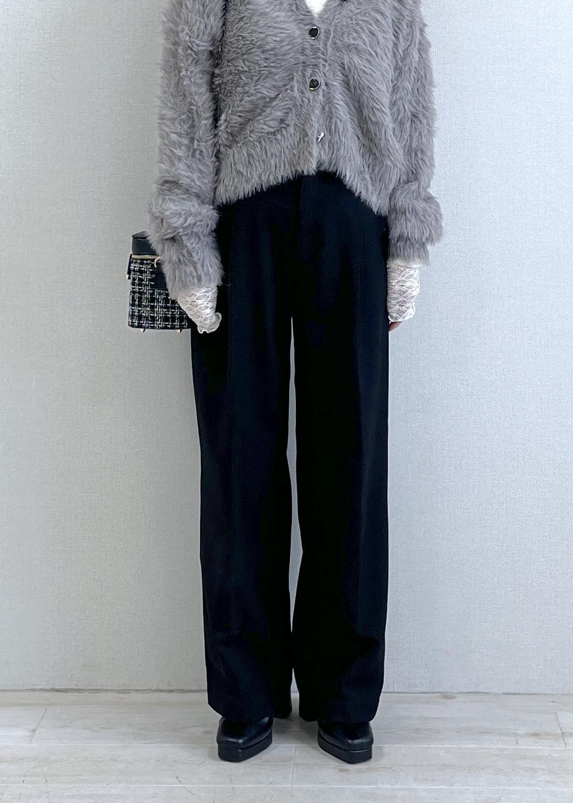 ボトムはブラックのワイドパンツで全体を引き締め、甘すぎない大人の印象に仕上げました。
