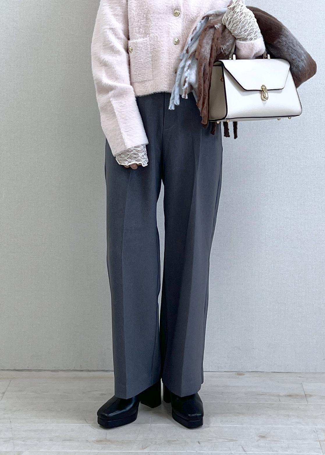 ボトムはグレーの落ち感あるワイドパンツで、可愛さの中にも大人っぽさをプラス。