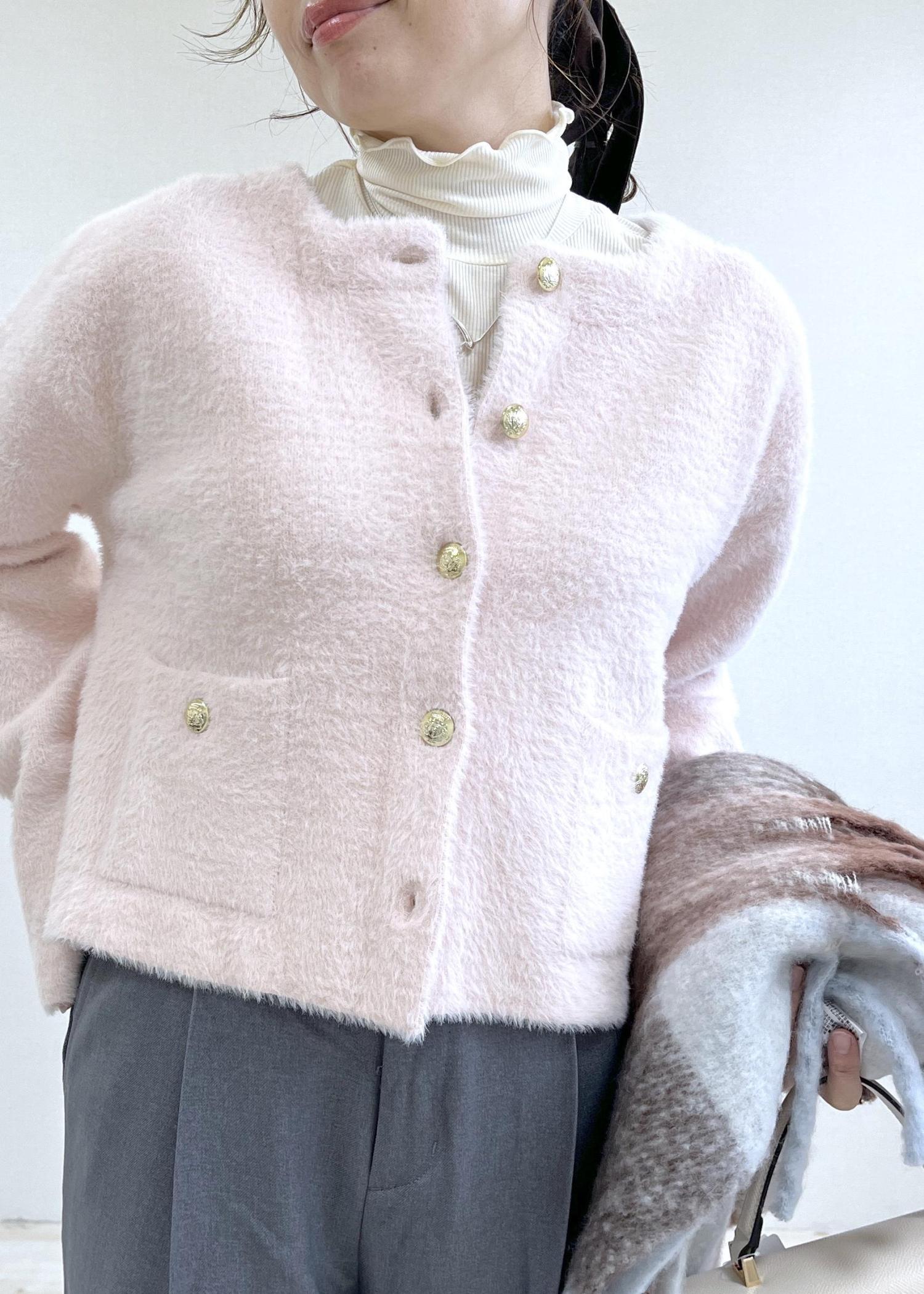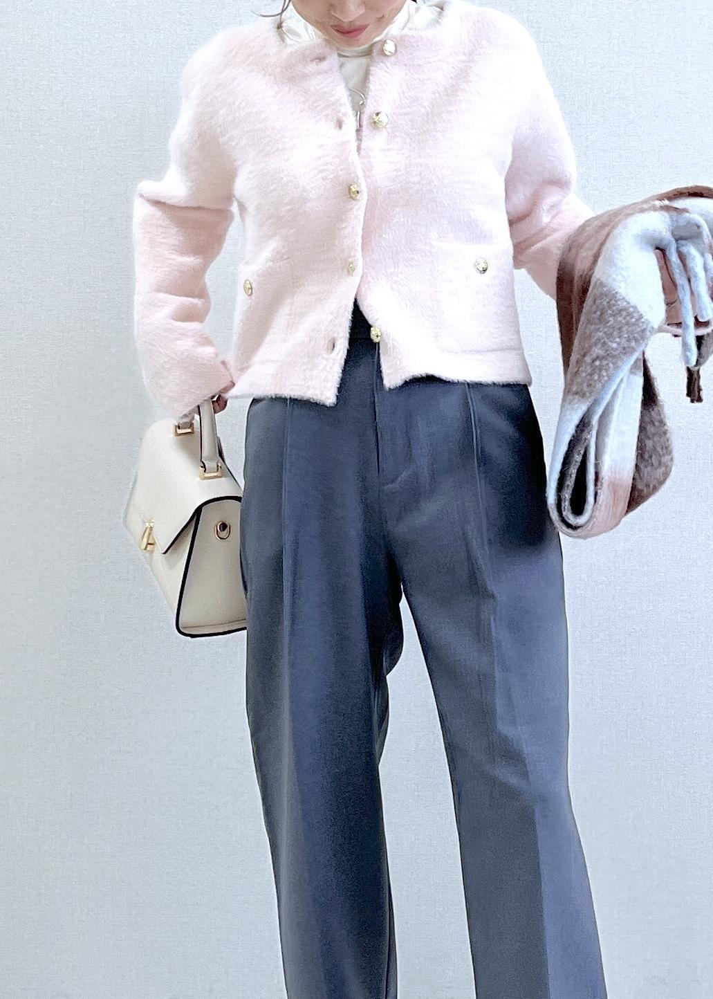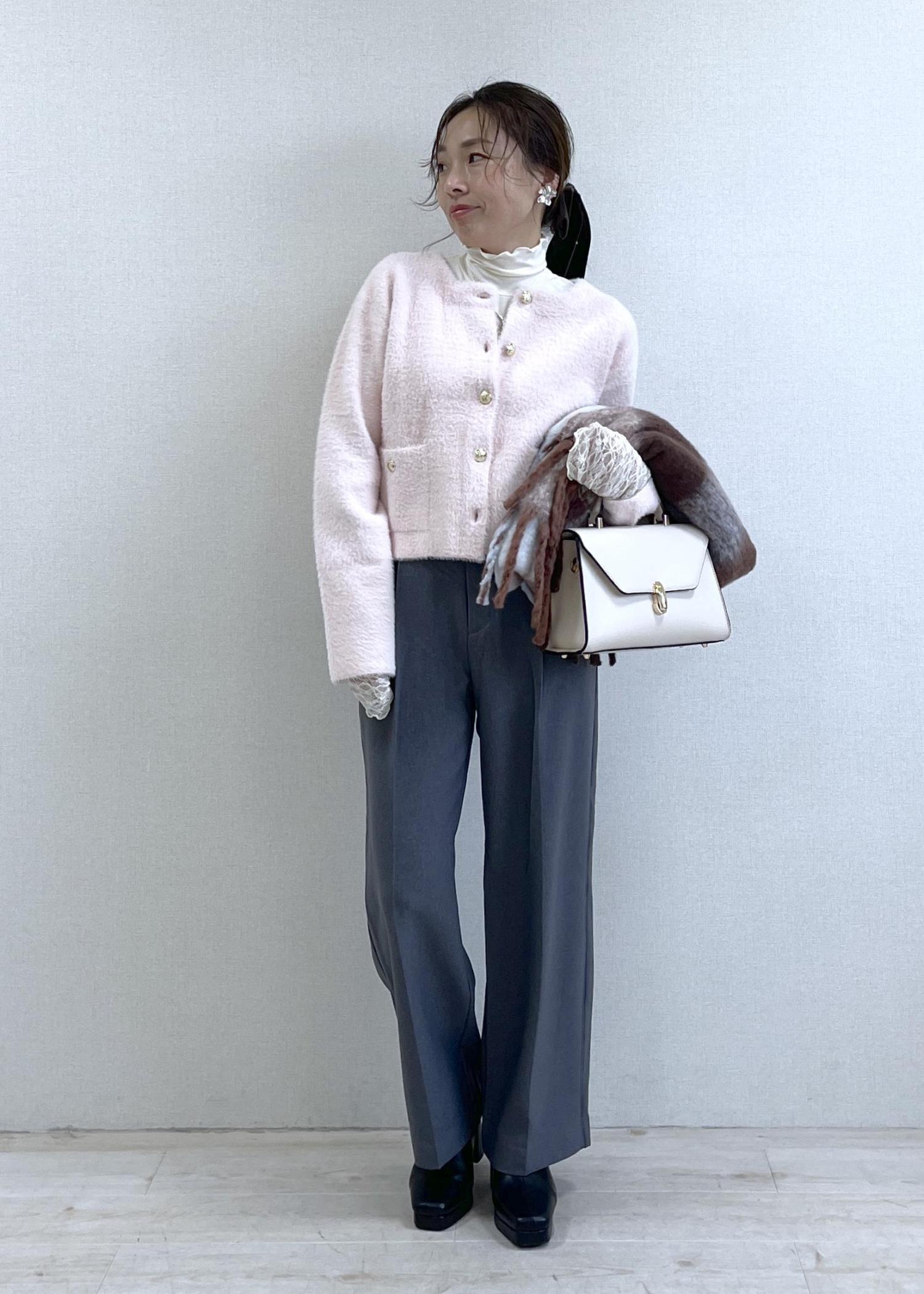 ふんわりしたピンクのツィード風カーディガンが主役の淡色コーデ。