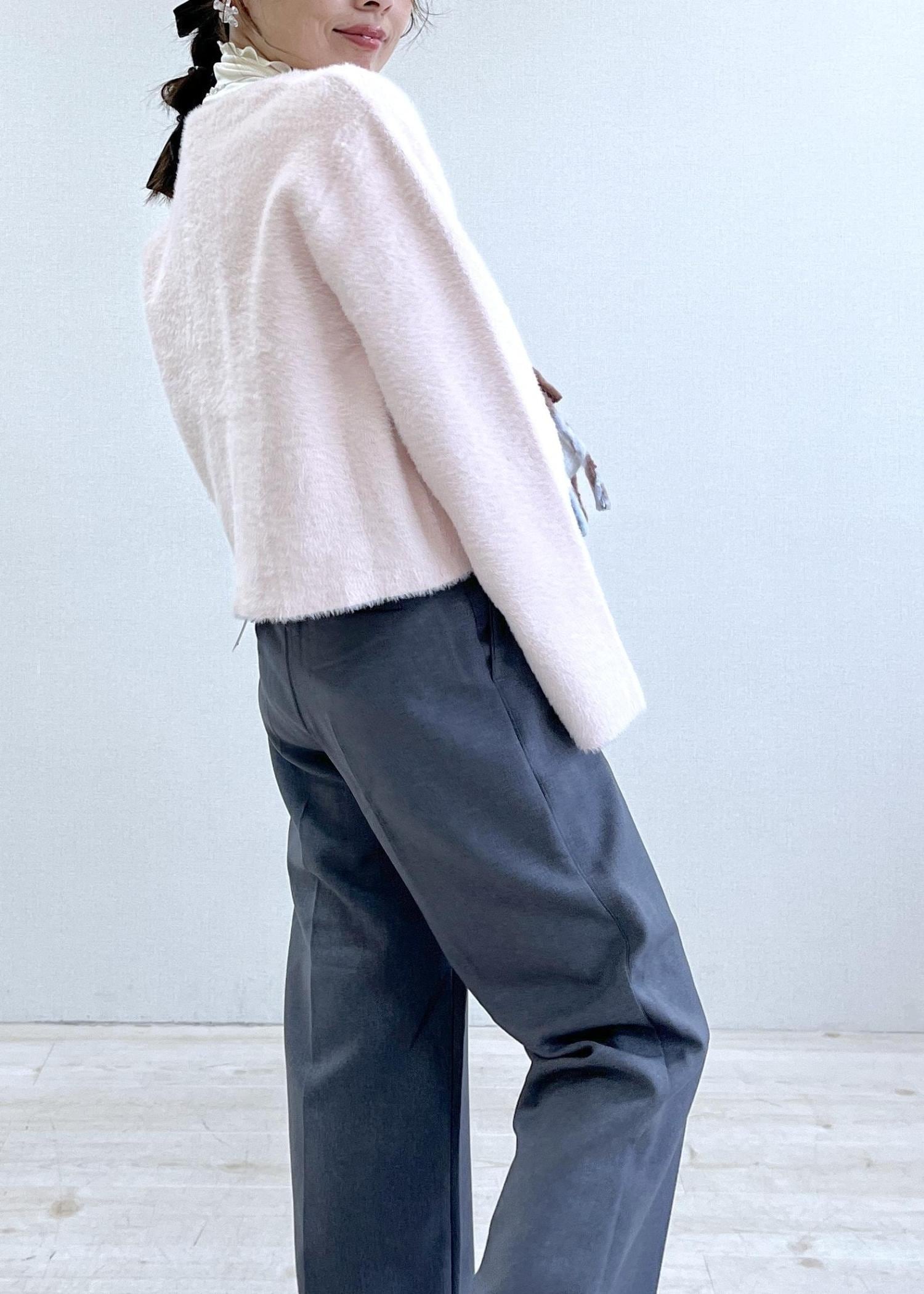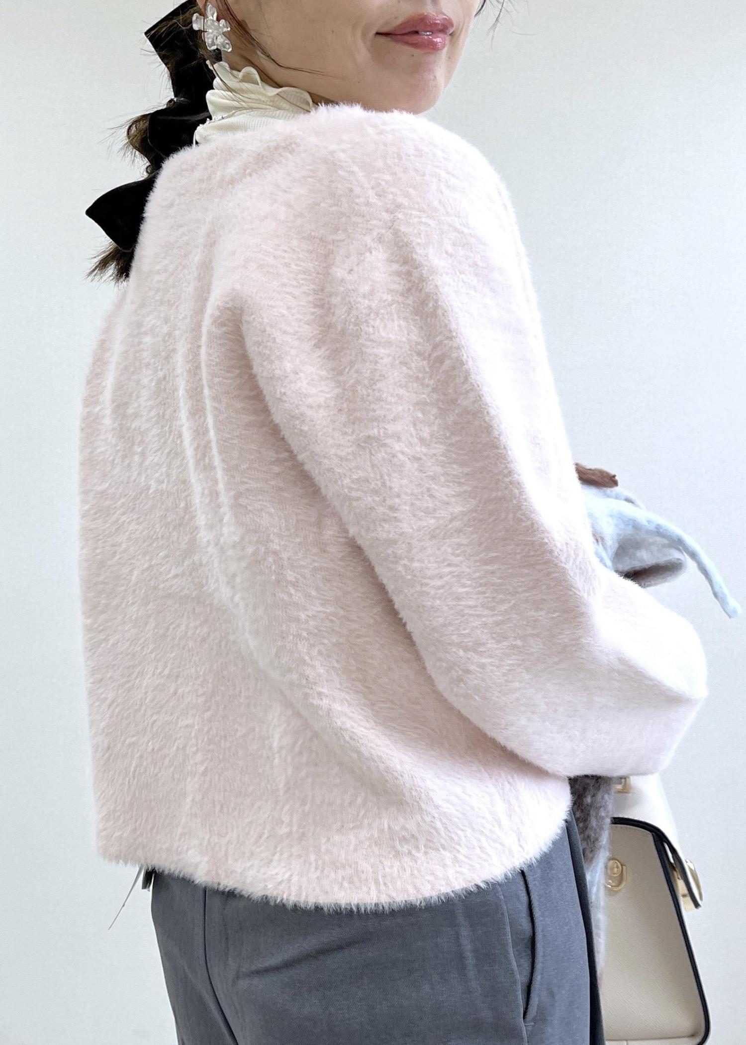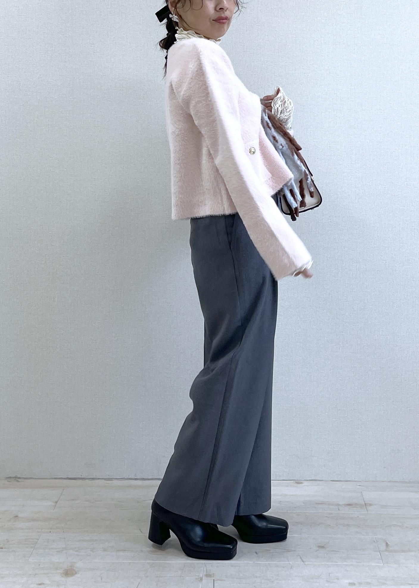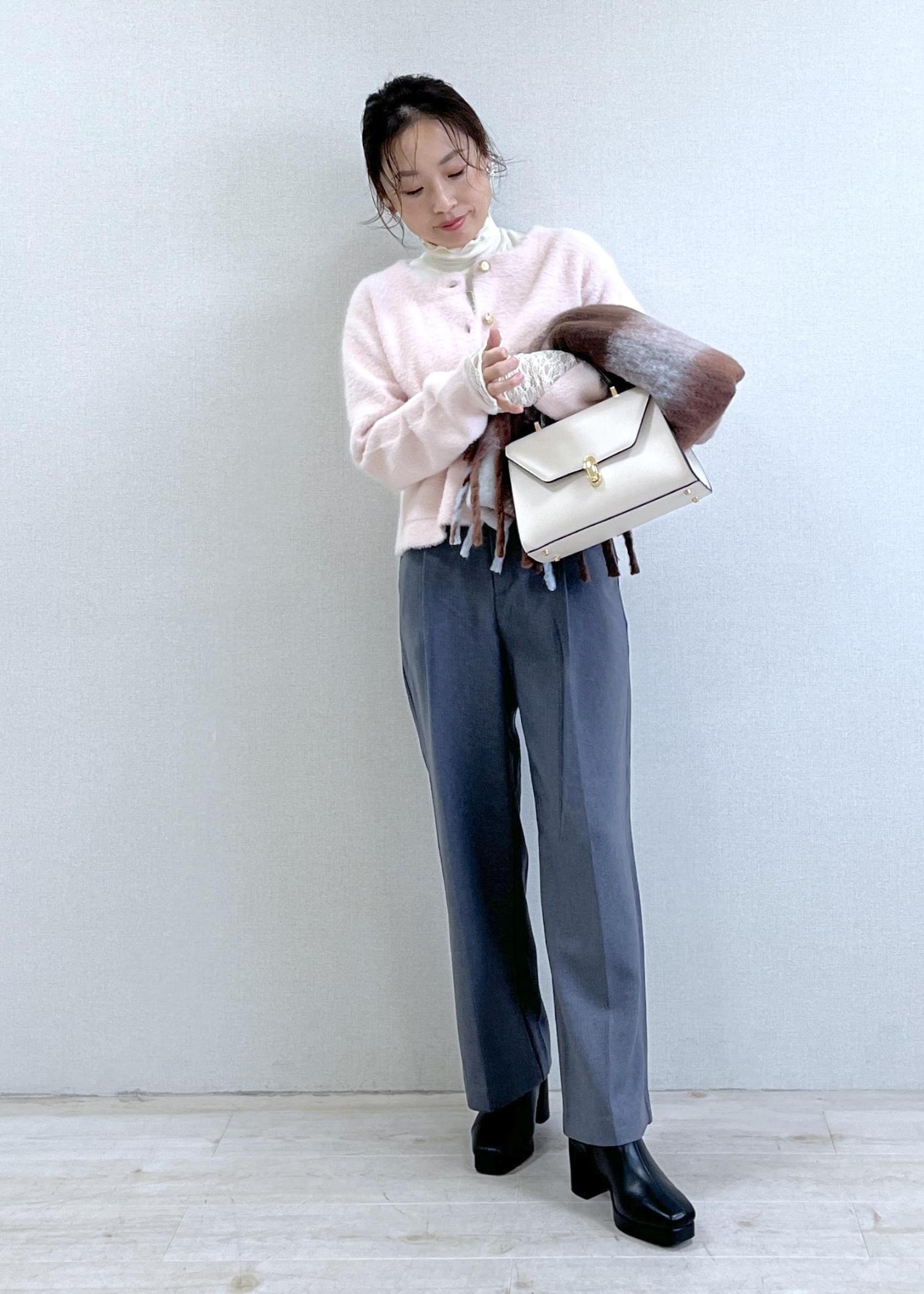 ふんわりしたピンクのツィード風カーディガンが主役の淡色コーデ。