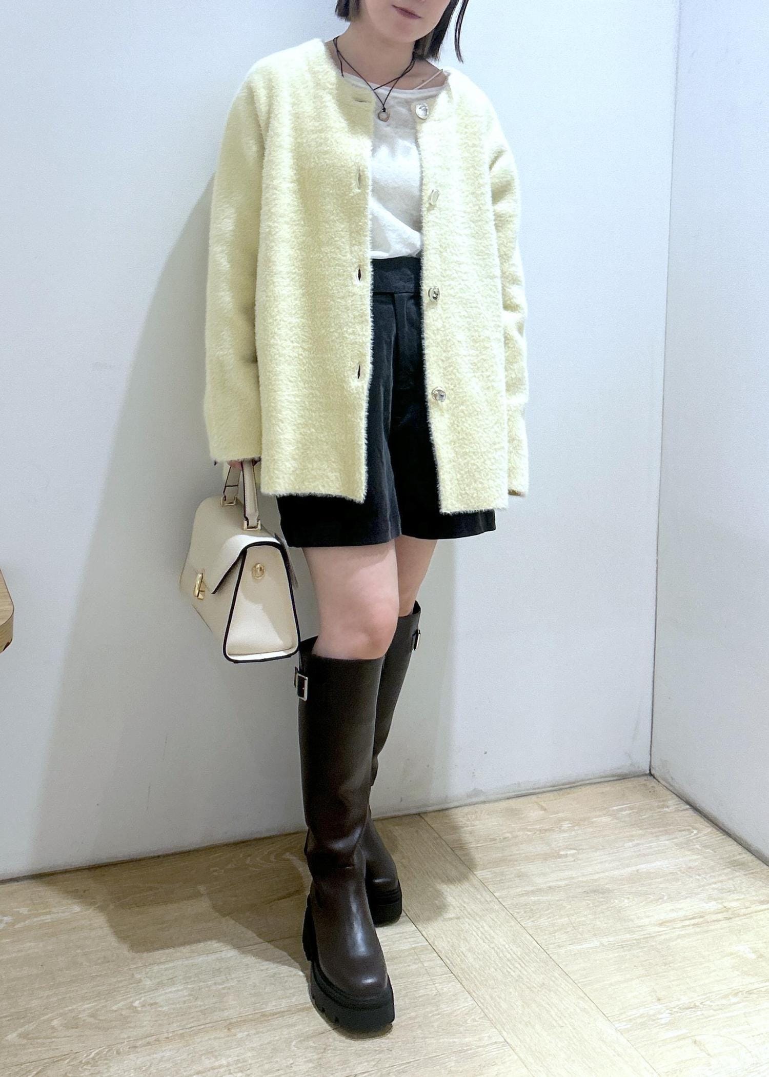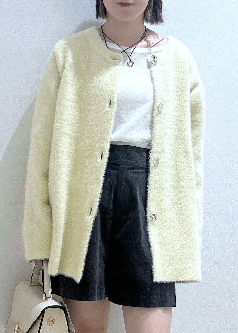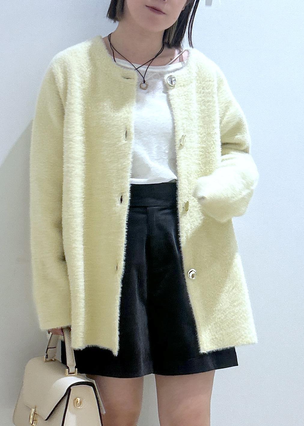 VIS接結メタルボタンミニフェザーニットコートイエロー / F¥7,999レビューふわふわな手触りでチクチクしません。アームもゆったりめで中に着込めるサイズです。