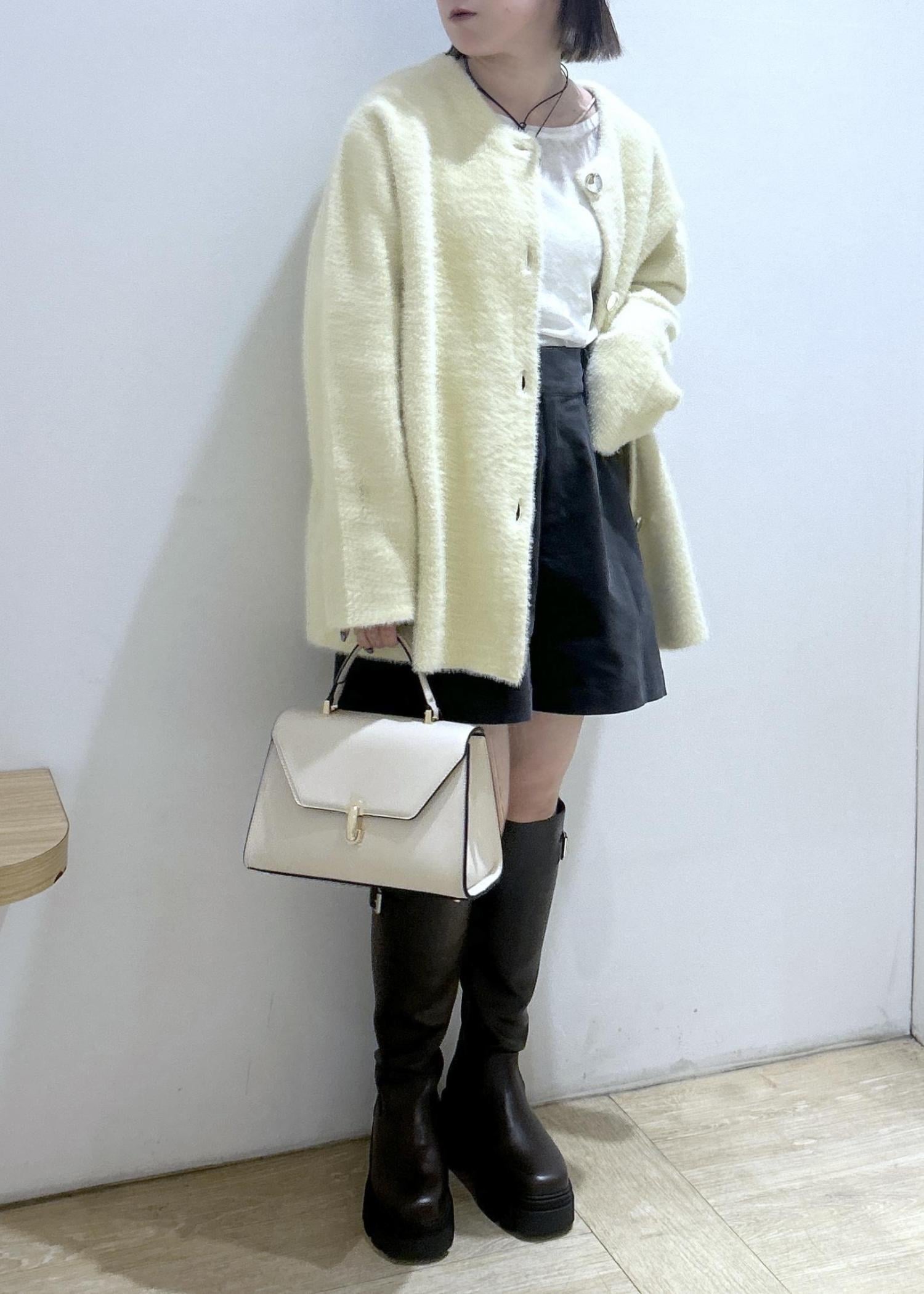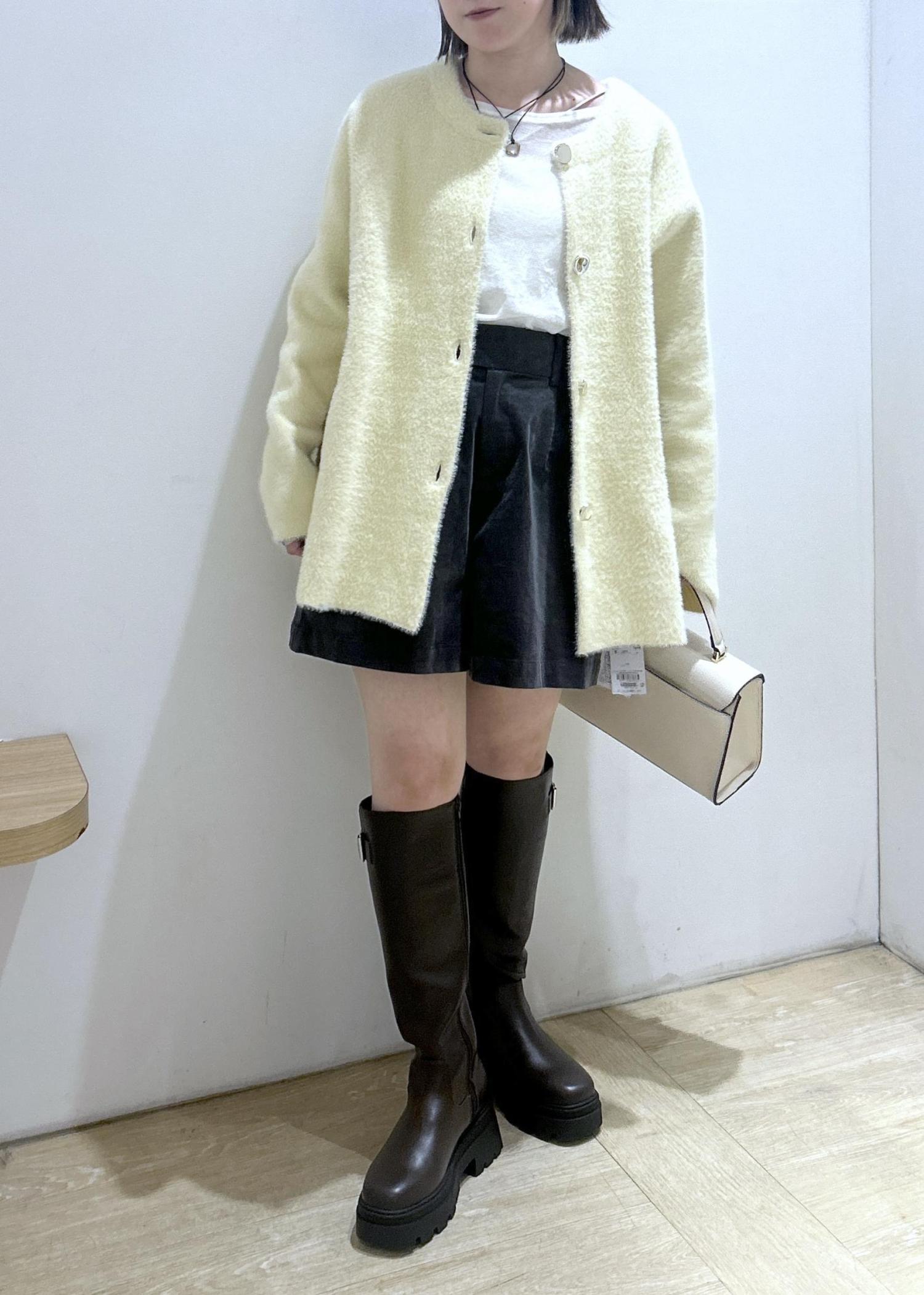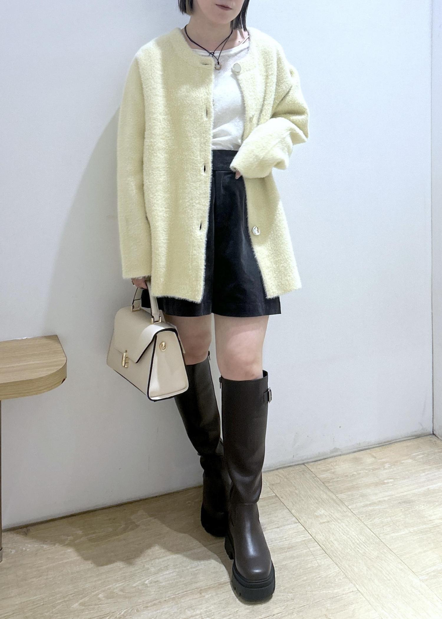 VIS接結メタルボタンミニフェザーニットコートイエロー / F¥7,999レビューふわふわな手触りでチクチクしません。アームもゆったりめで中に着込めるサイズです。