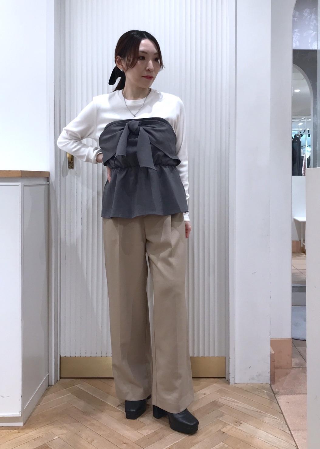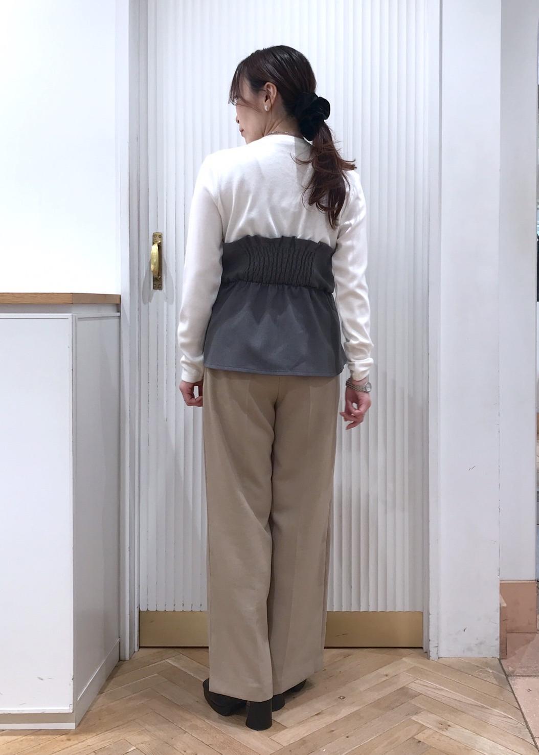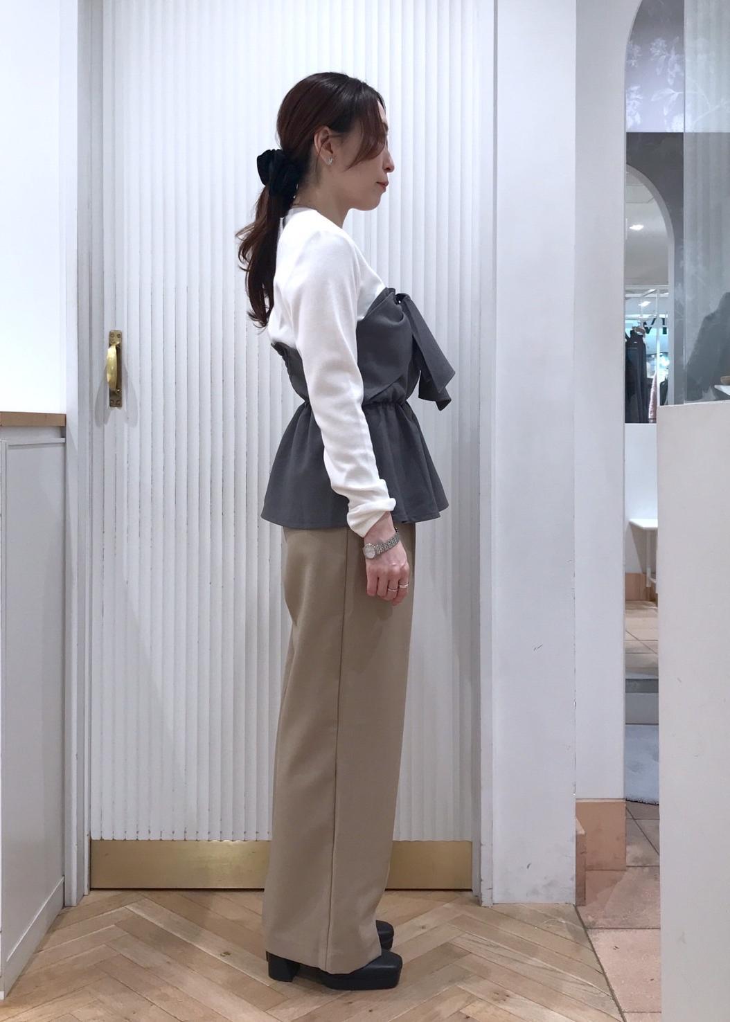 グレーのビスチェに同素材のベージュのパンツを合わせて優しげに。