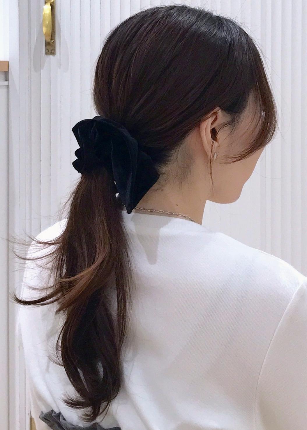 VISスクエアベロアシュシュブラック / F¥1,969レビュー胸辺りまでのロングヘアですが、ポニーテールもお団子もしっかり留まります。