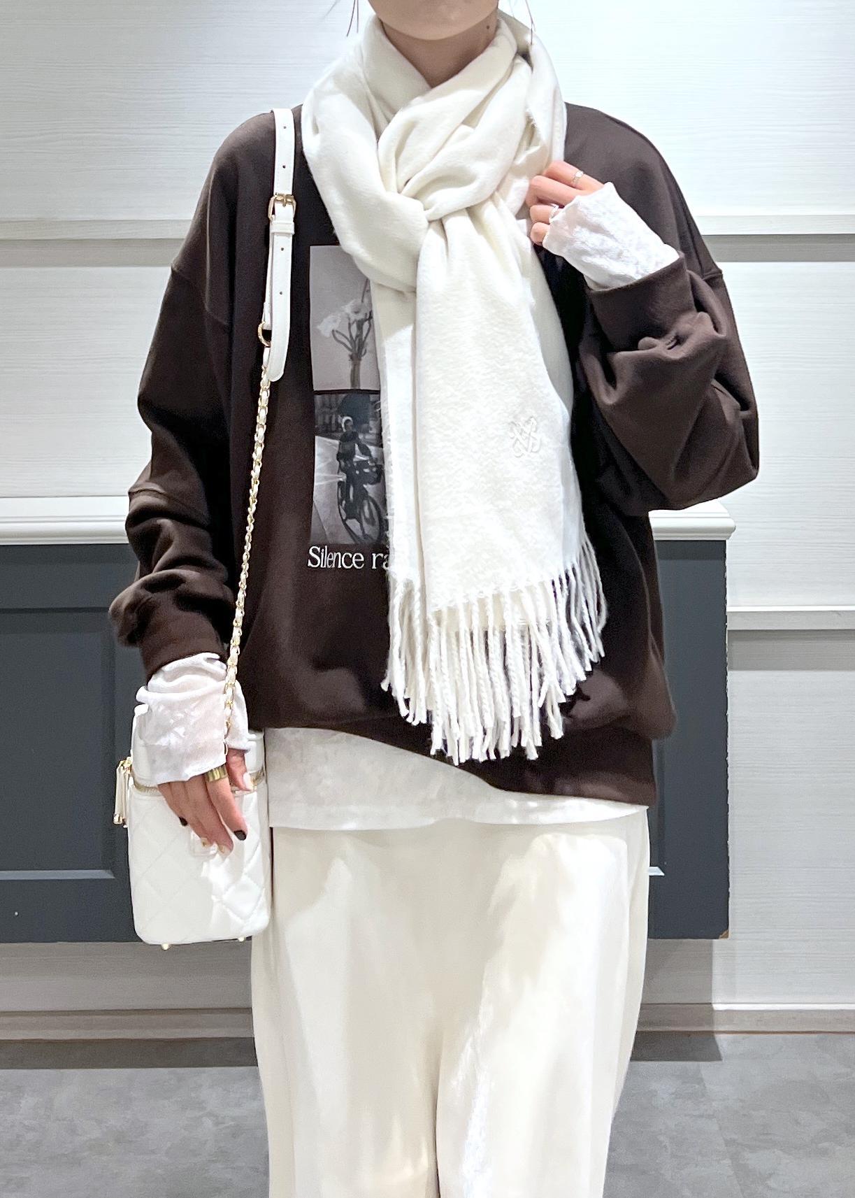 VISなめらかタッチ刺繍入りストールオフホワイト / F¥3,289レビュー柔らかく、大判でもボリュームが出すぎないマフラーです。