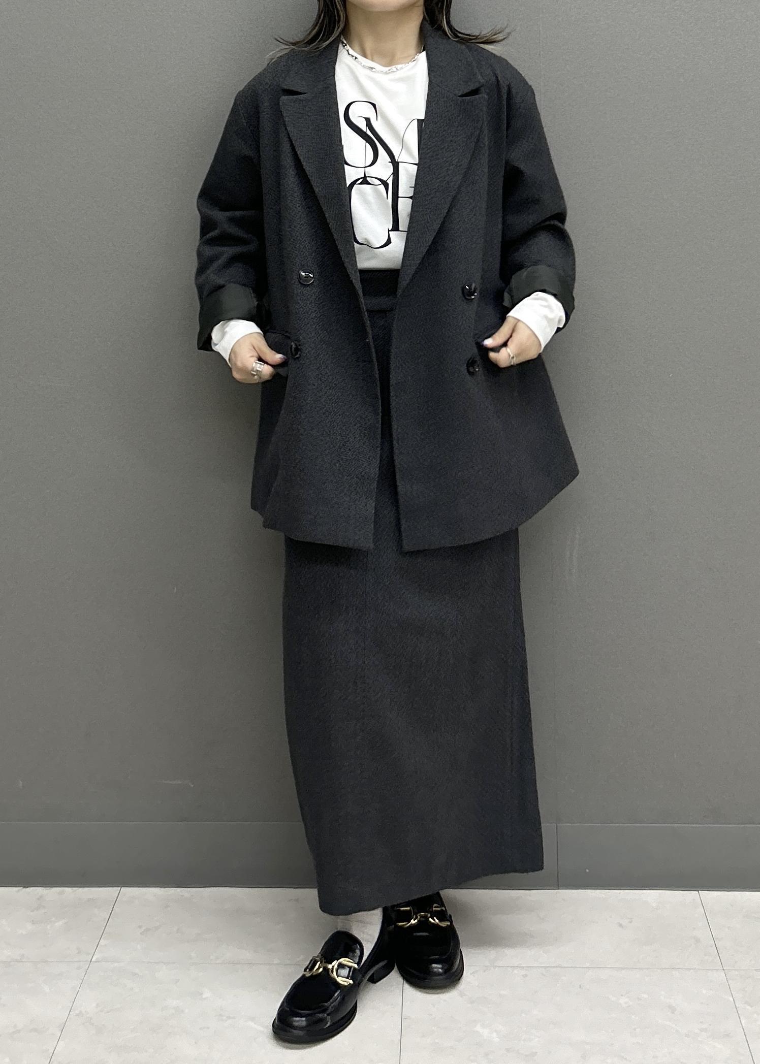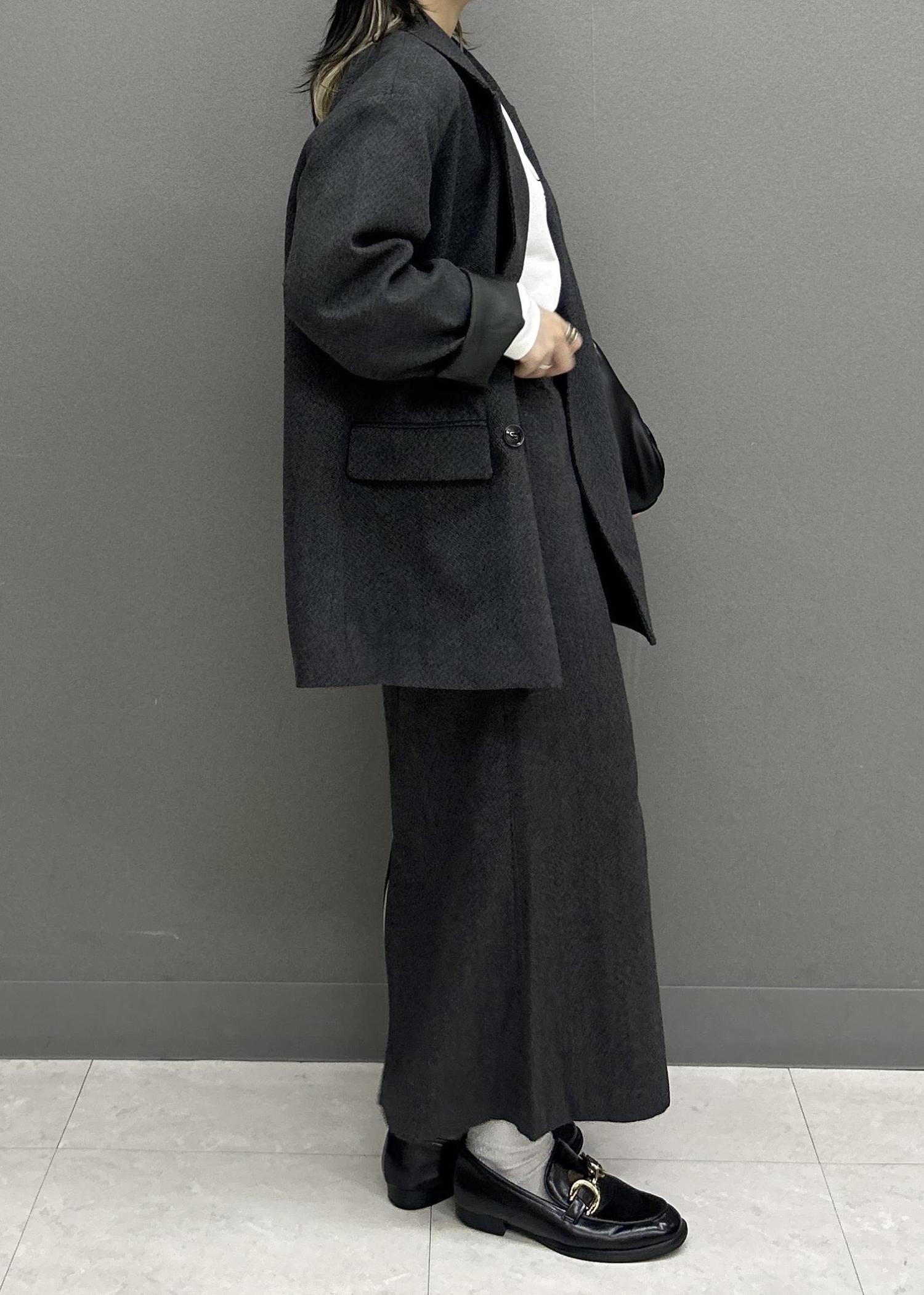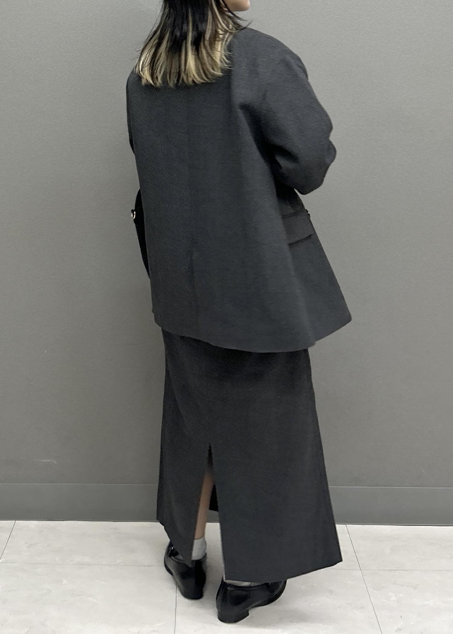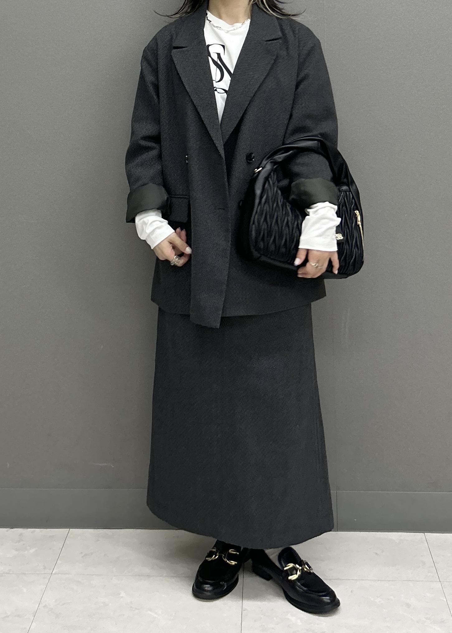 オーバーサイズのジャケットとIラインのスッキリシルエットスカートのバランスがちょうど良い◎セットアップスタイリングです。