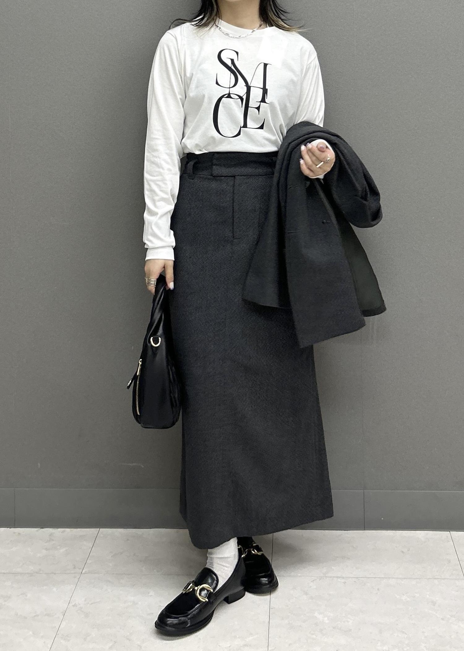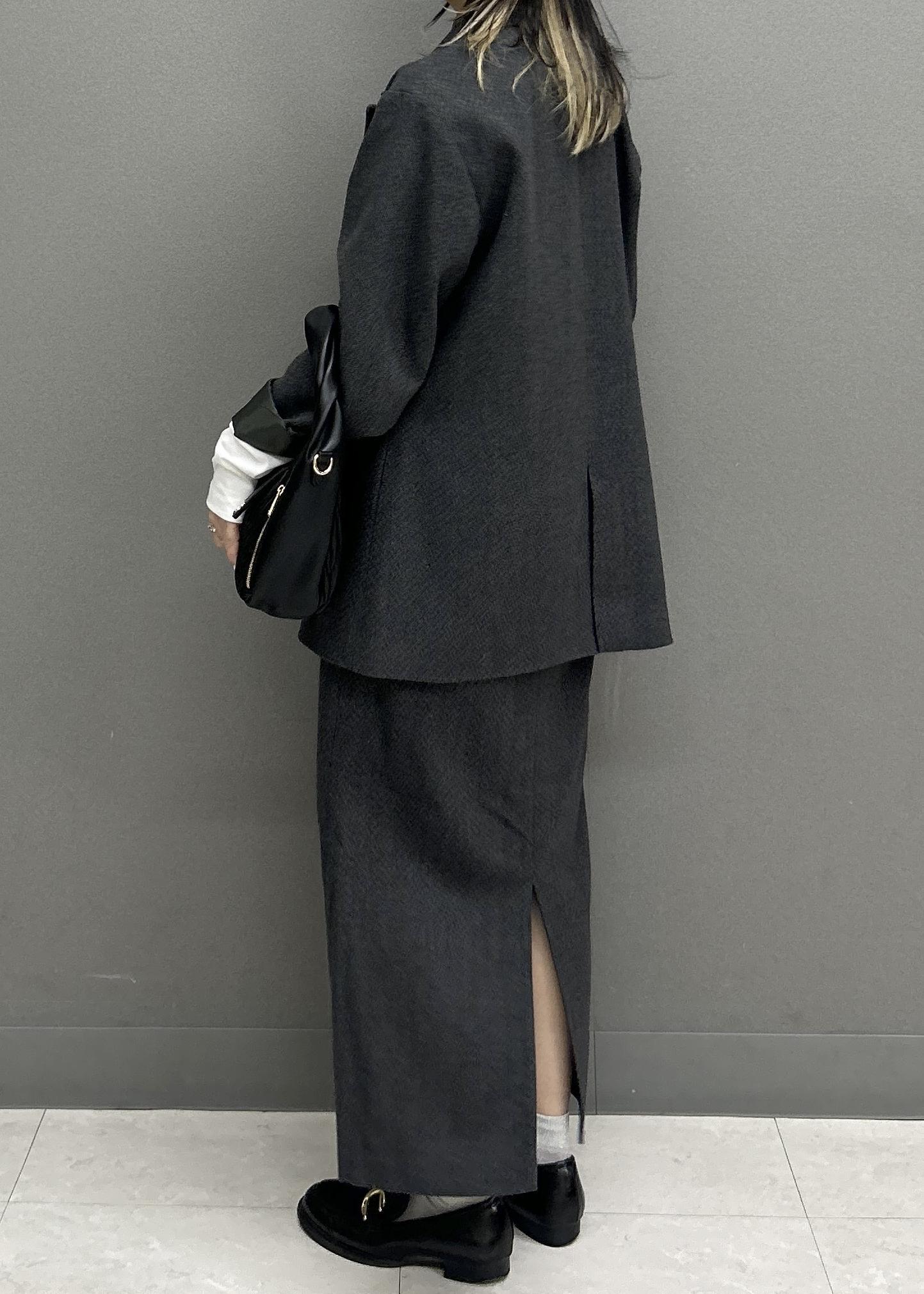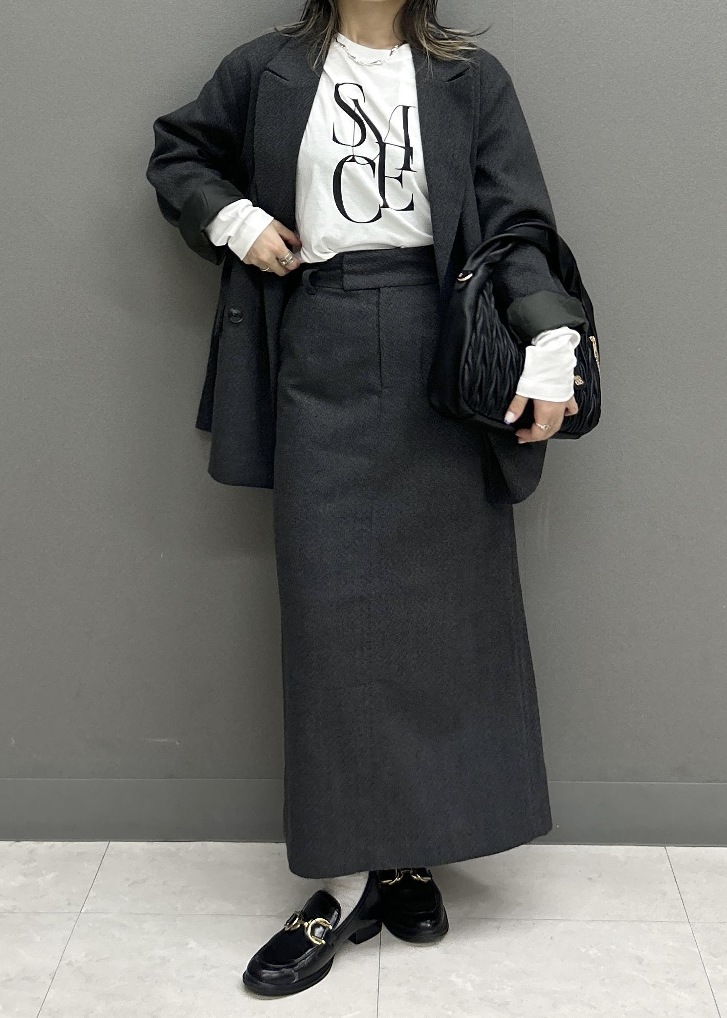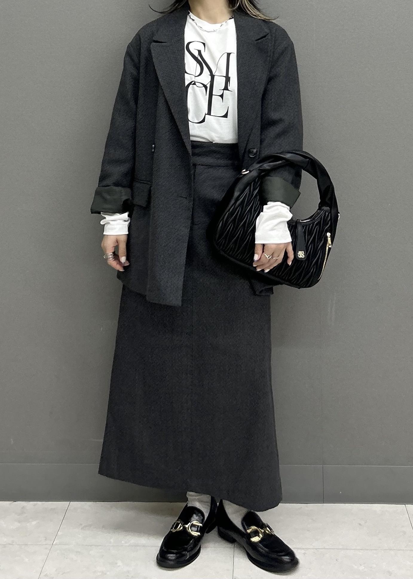 オーバーサイズのジャケットとIラインのスッキリシルエットスカートのバランスがちょうど良い◎セットアップスタイリングです。