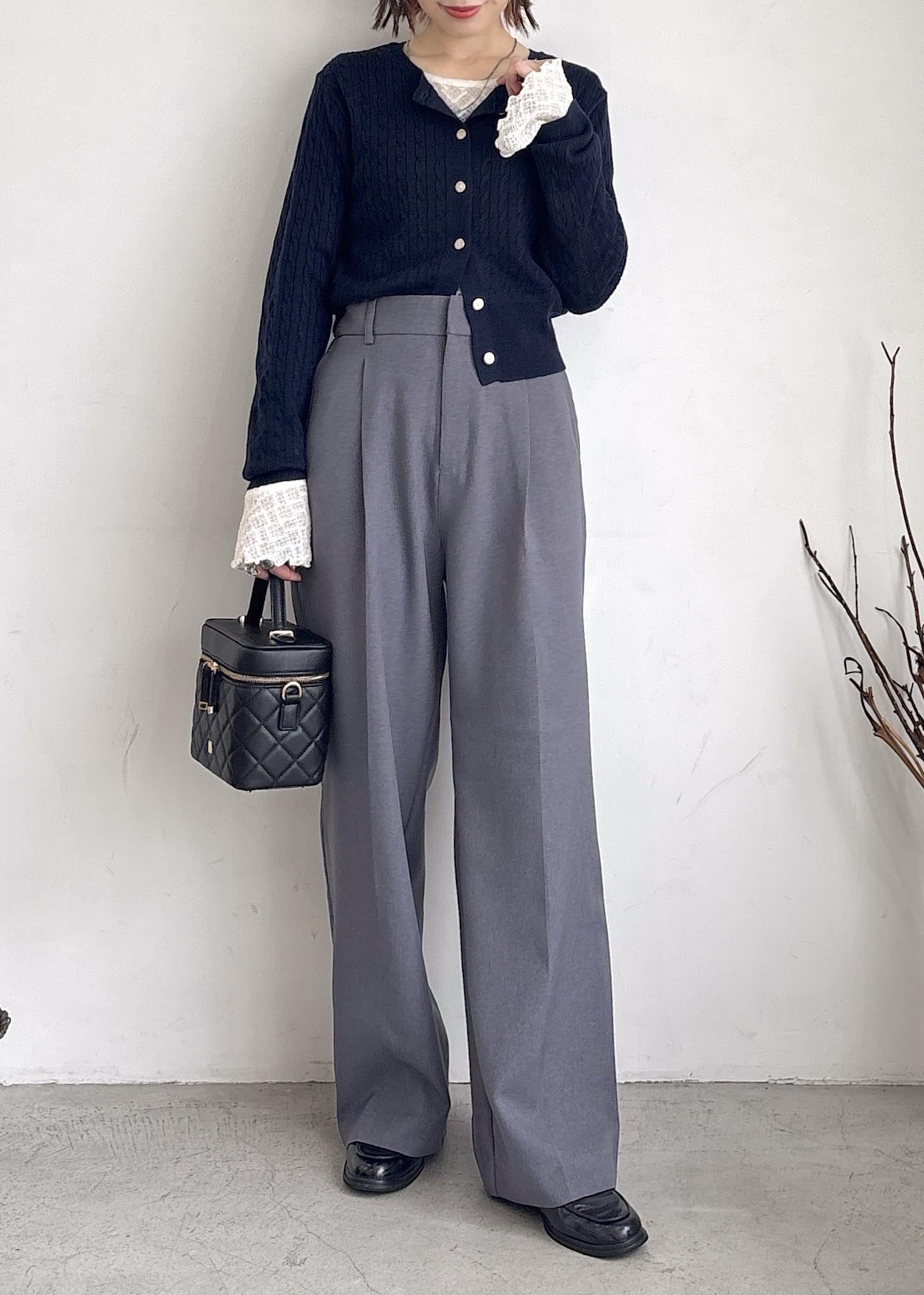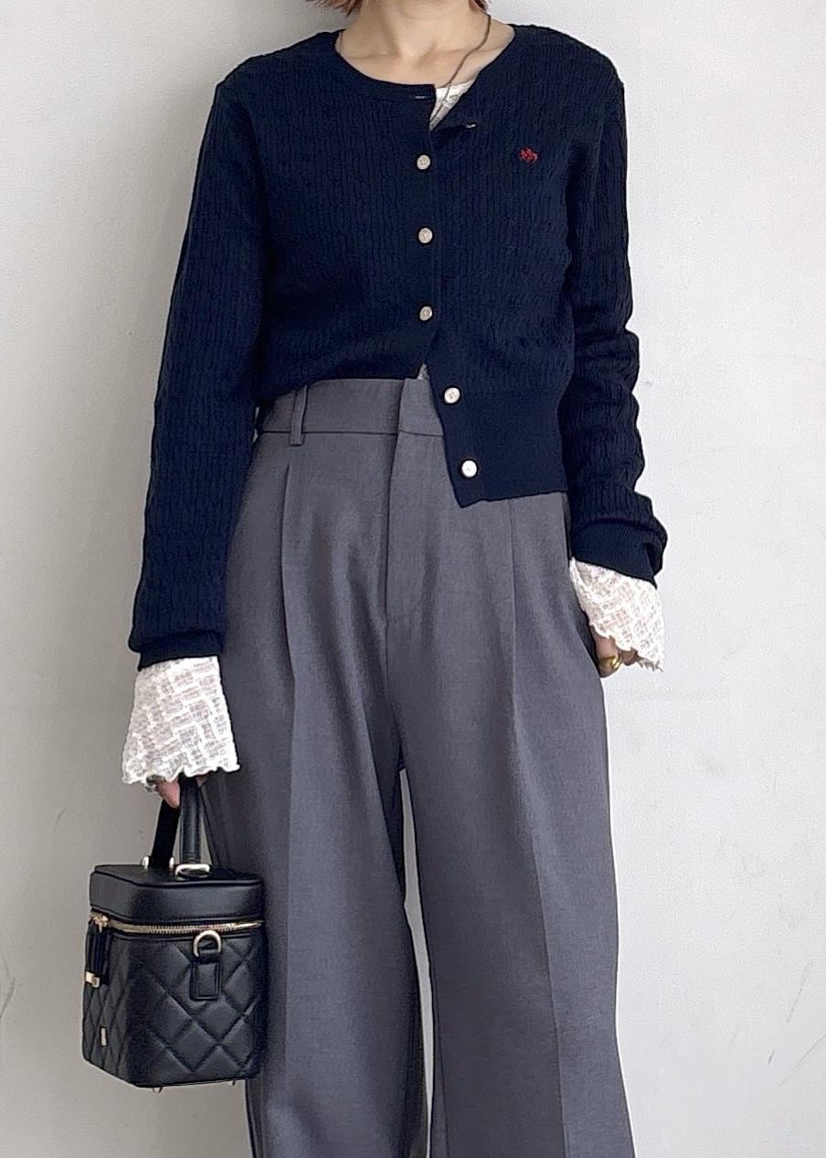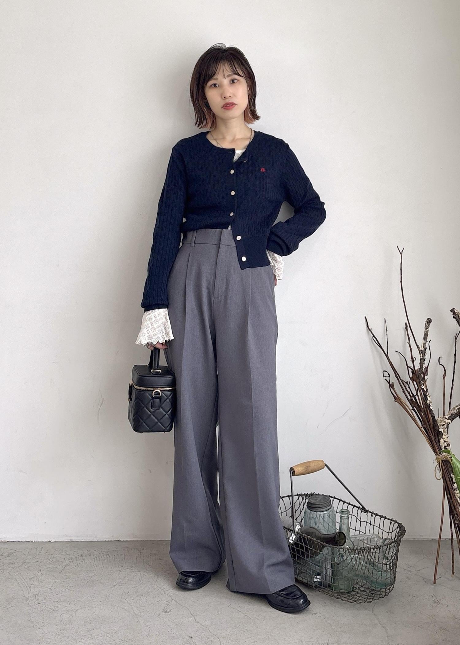 大人気のPOLO BCS | VIS別注カーディガンをポイントに、レーストップスをレイヤード、グレーのパンツでスッキリ合わせたシンプルスタイル♪レーストップスは袖がフレアになっているのでコンパクトなカーディガンからちらっと動きができるようポイント使い。ローファーとバニティバックはブラックでスッキリとした印象見えするようまとめました◎秋オススメの大人カジュアルコーデ。
