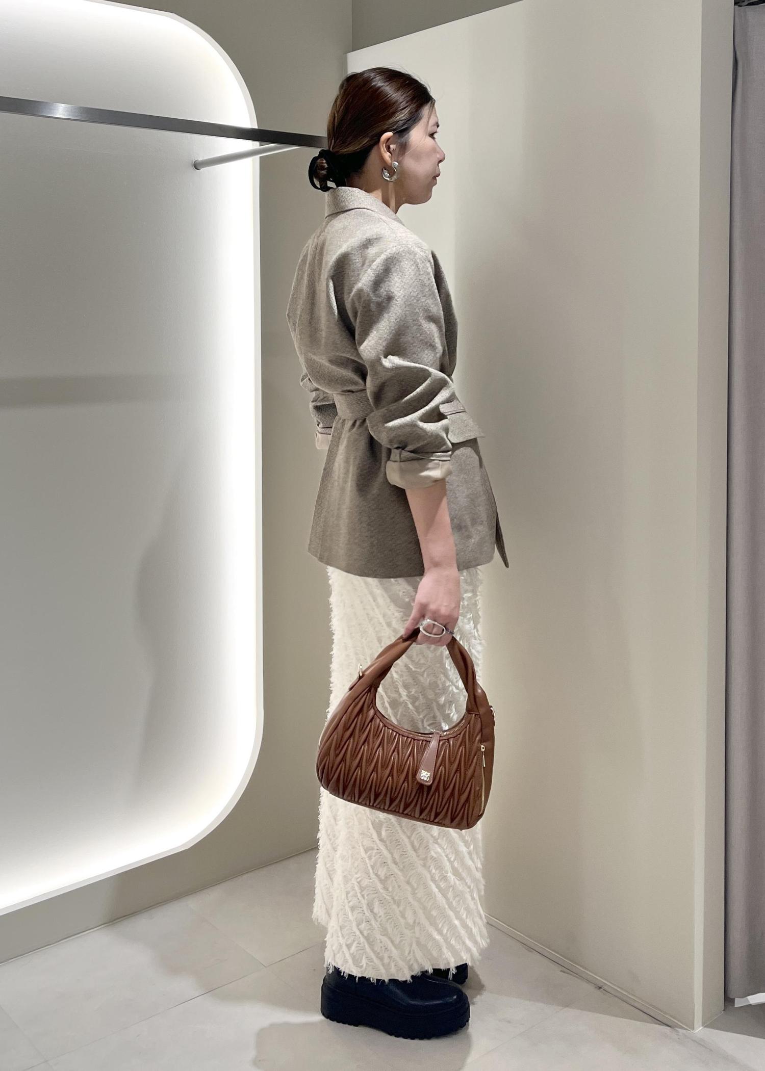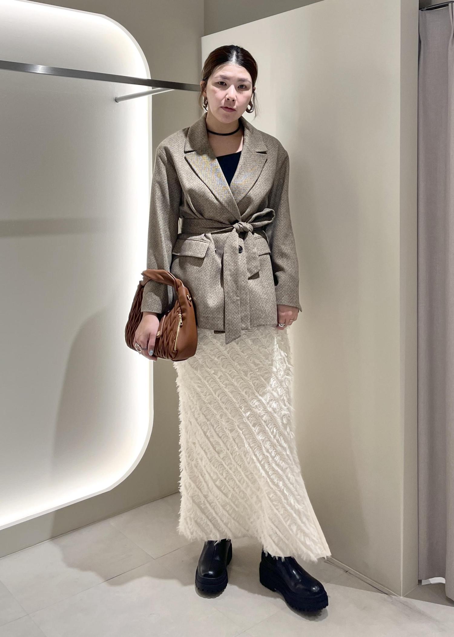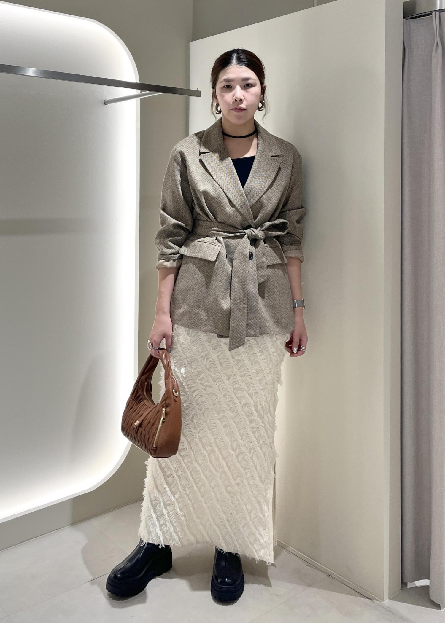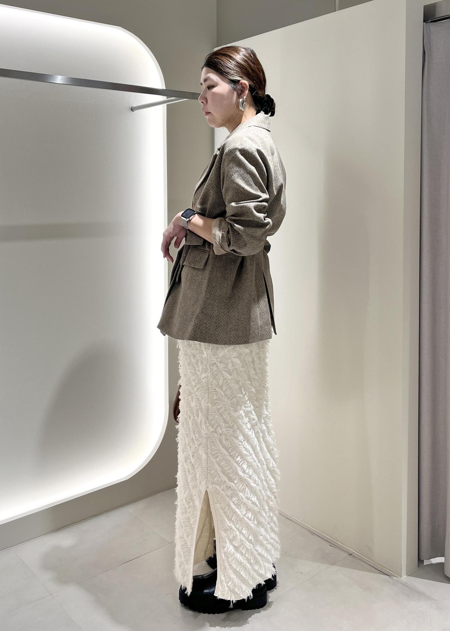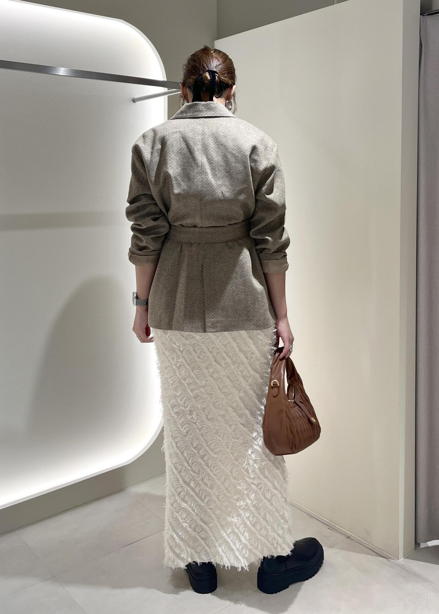 ヘリンボーンがこの時期らしいオーバーサイズのジャケットにフリンジが映えるIラインスカートとのバランス感◎