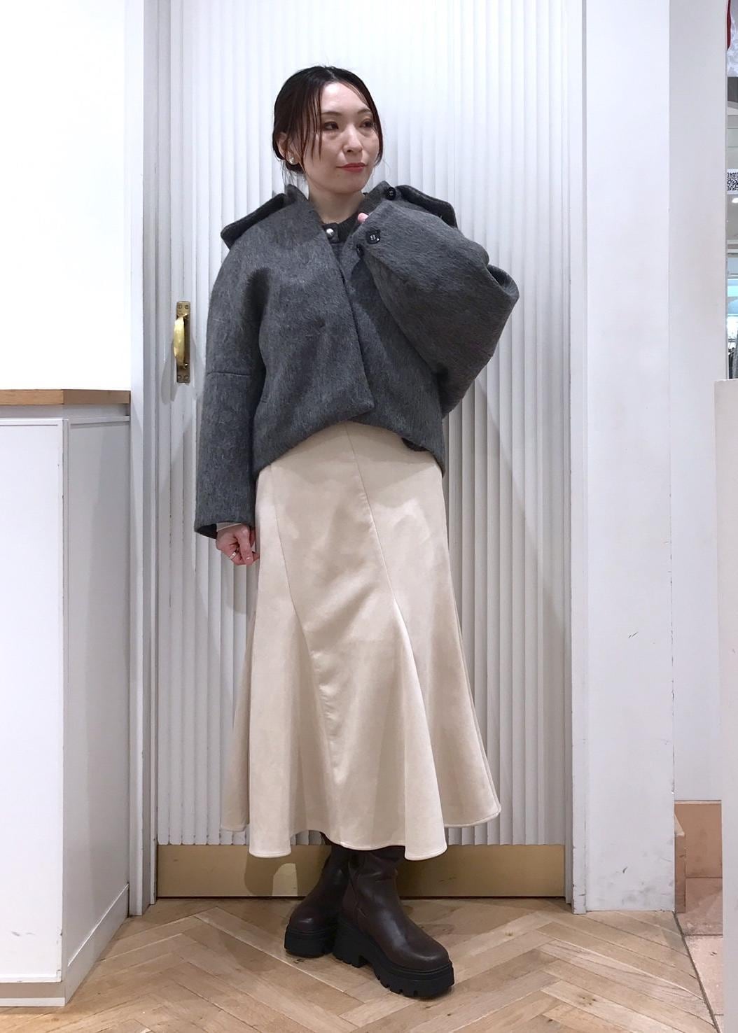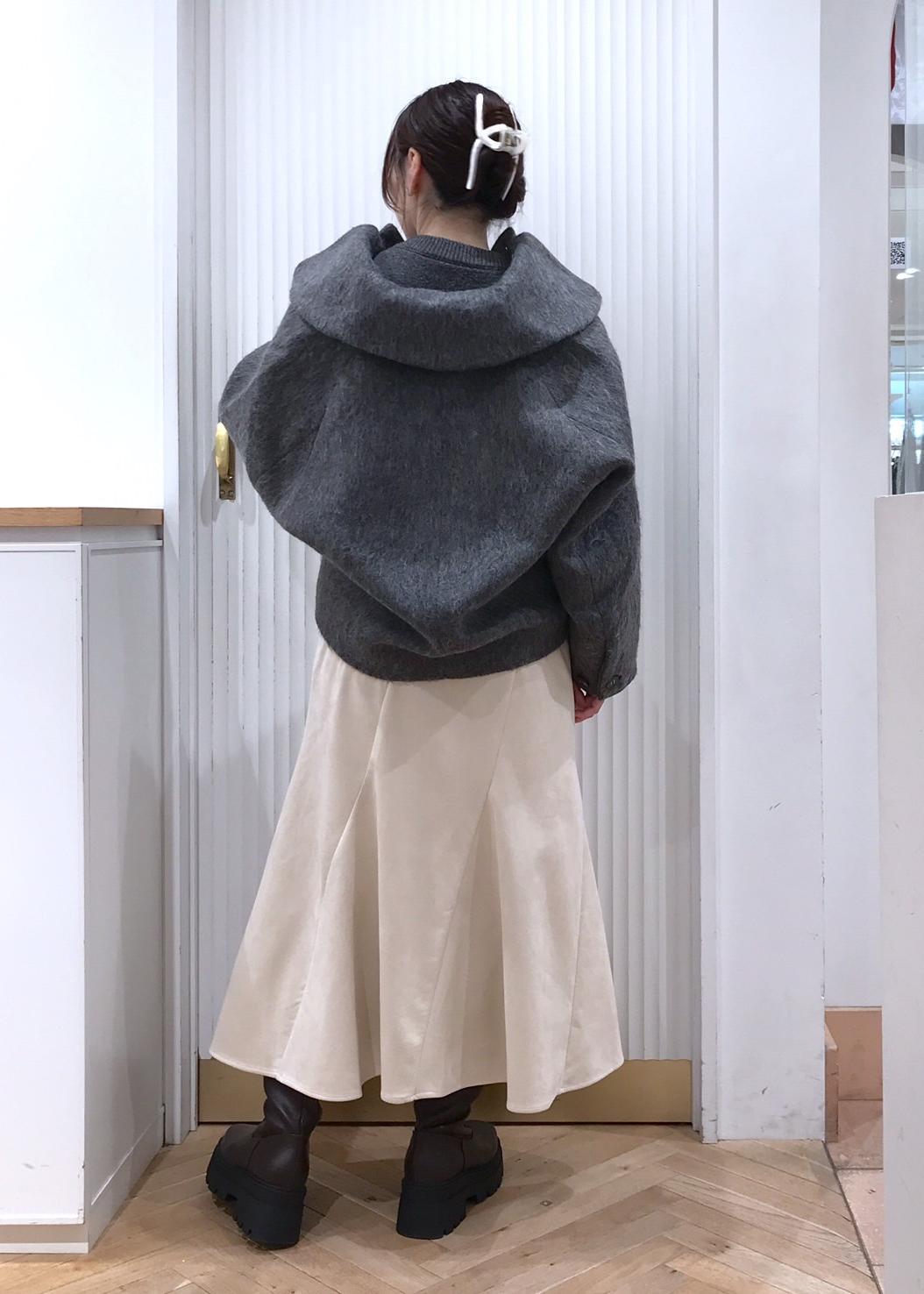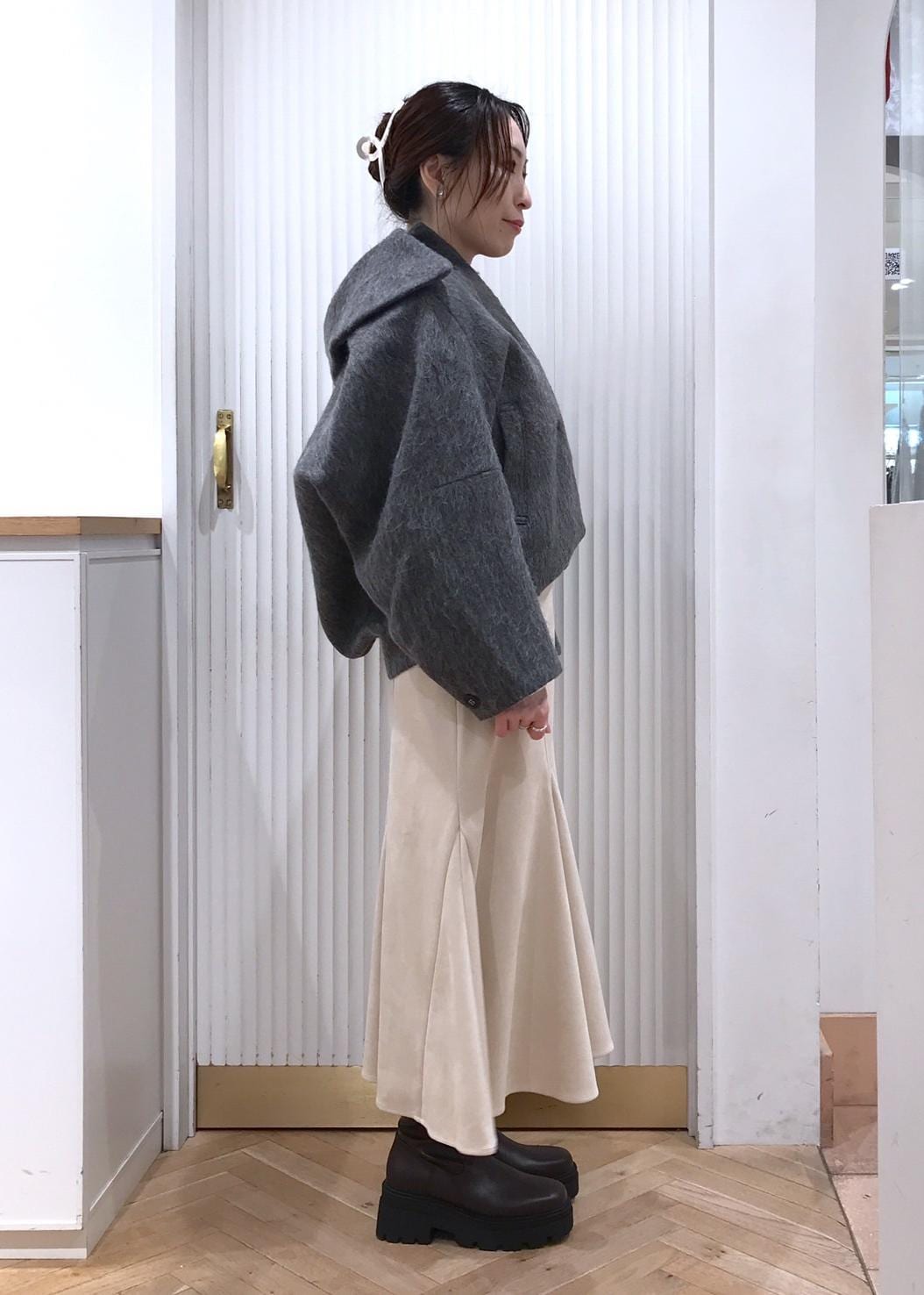 丸みのあるシルエットが可愛いショート丈コートを重たく見えないようマイルドな配色でコーディネート。