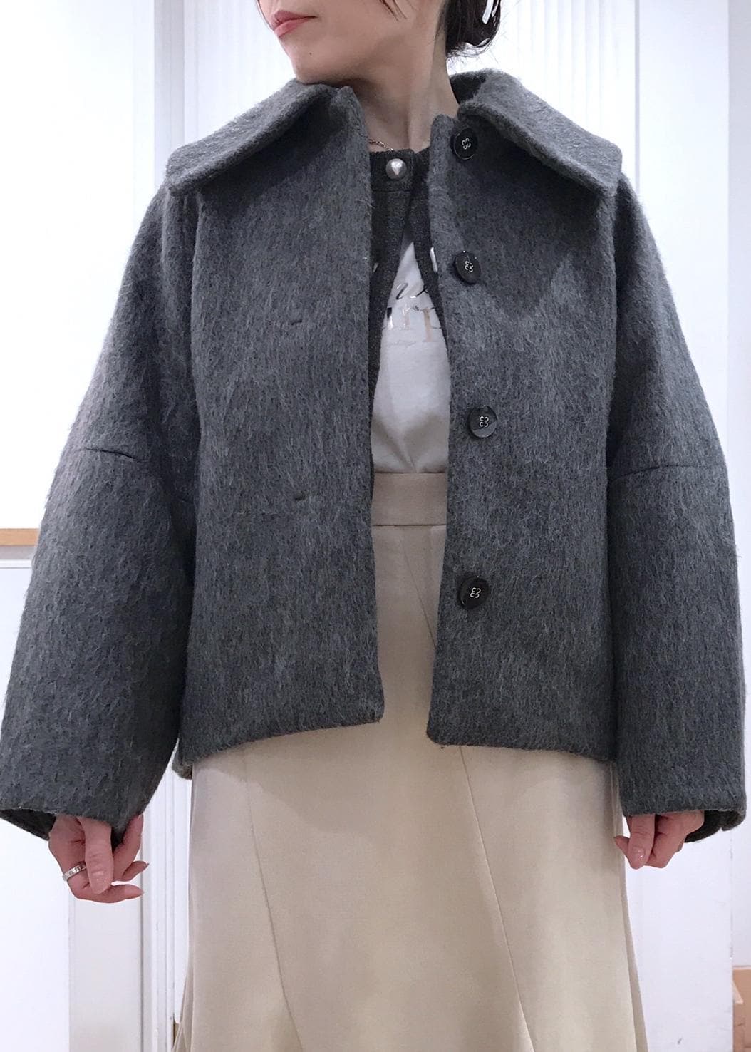VIS【アウター総選挙1位】ビッグカラーモモンガシャギーショートコートグレー / S¥10,989レビュー着丈はお尻がほぼ隠れるくらいの長さです。