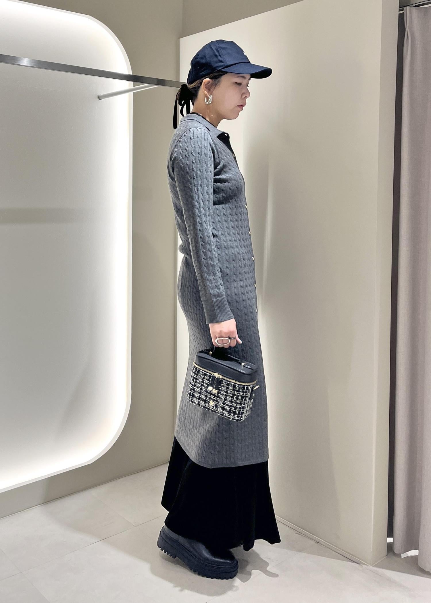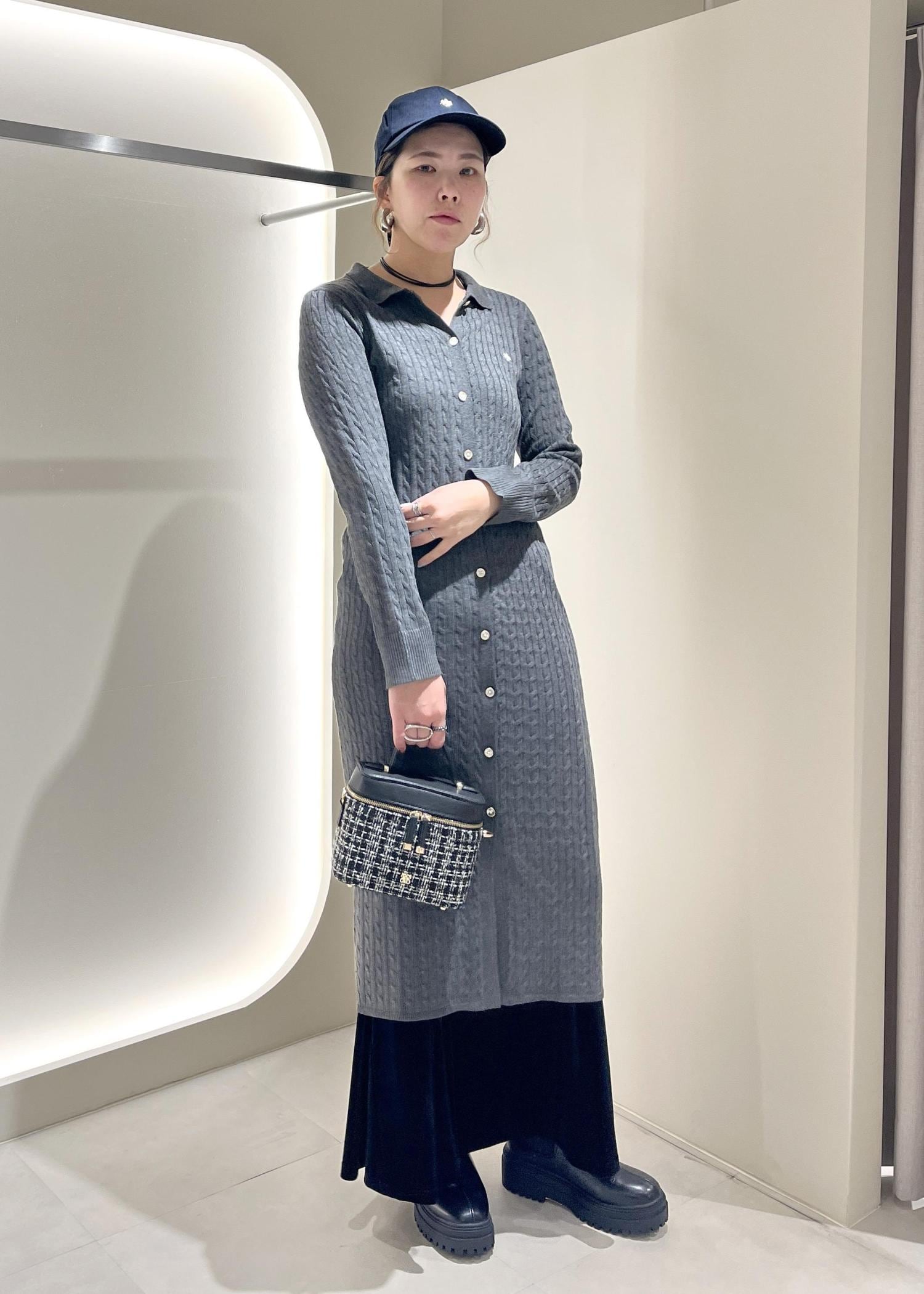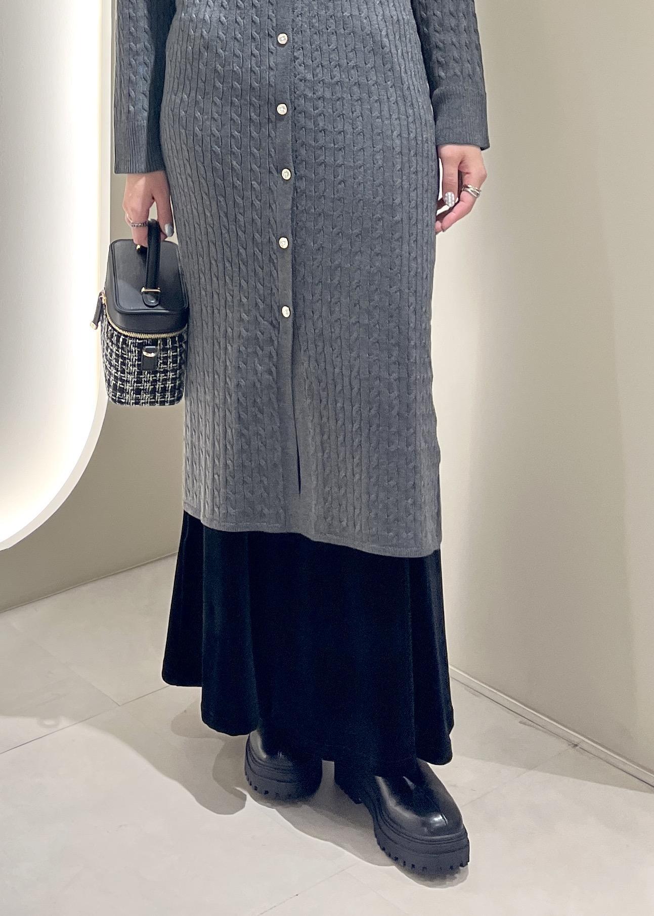 新作のニットワンピースに、長さが欲しかったのでベロアスカートをレイヤード!個人的に細見え〜なワンピースで嬉しくなりました♡♡