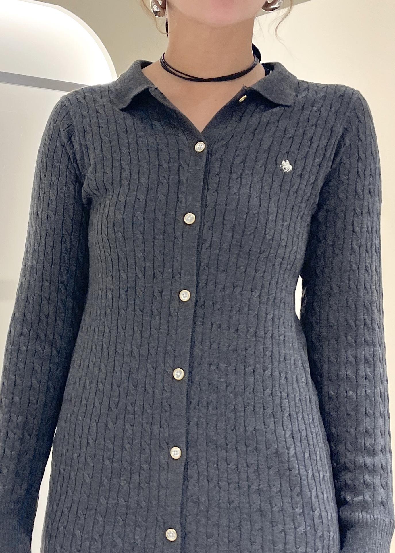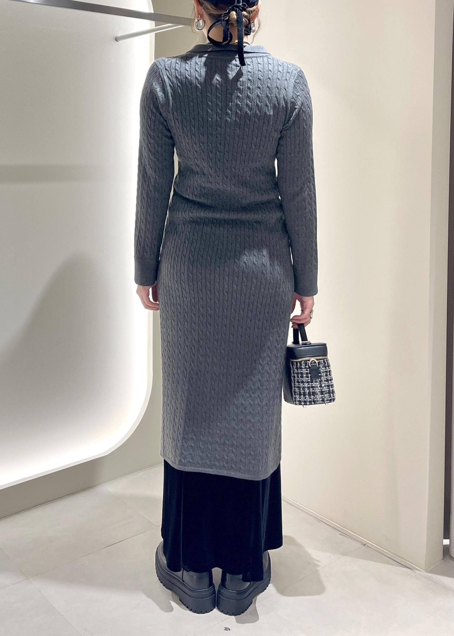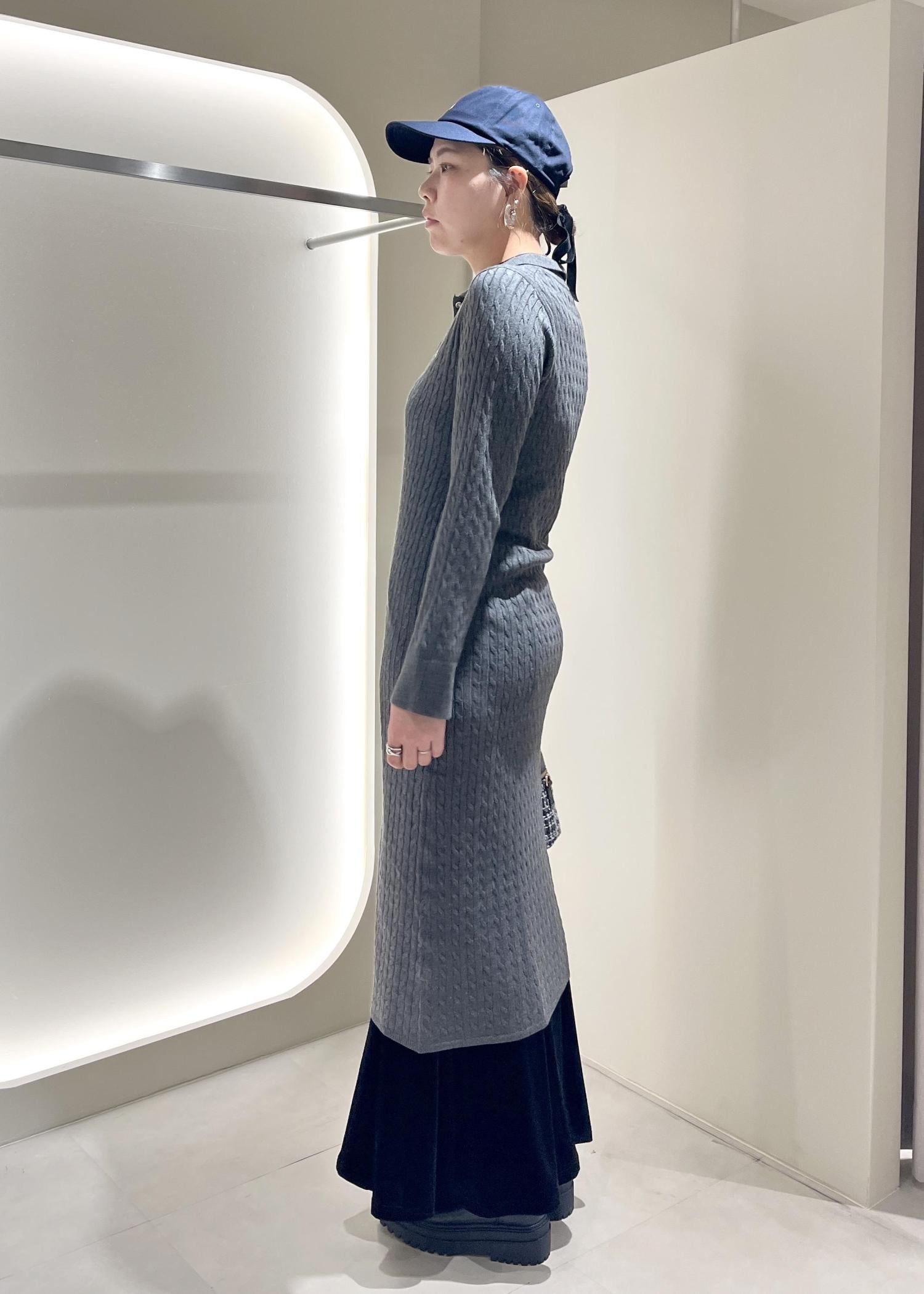 フロントのボタンや、胸元のロゴがコーデを引き立てるニットワンピです。171cmでふくらはぎの丈感です。 -