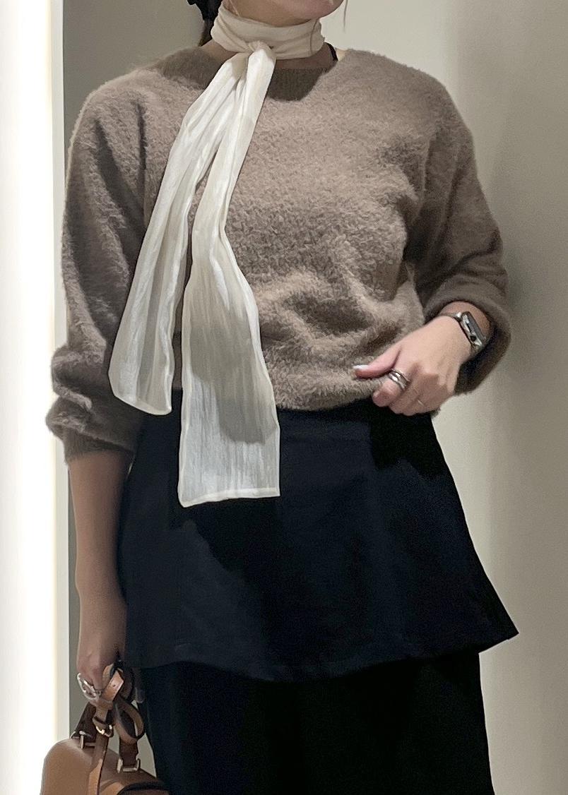 VISシアーボウタイリボン付きフェザーニットプルオーバー/2WAY・イージーケアキャメル / F¥6,589レビューふわっと着心地のいいニットに、シアーのボウタイの意素材感もポイントに!