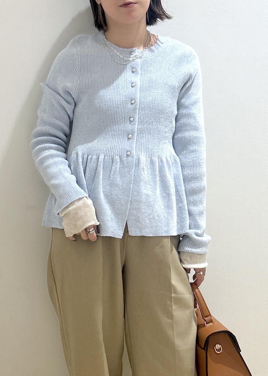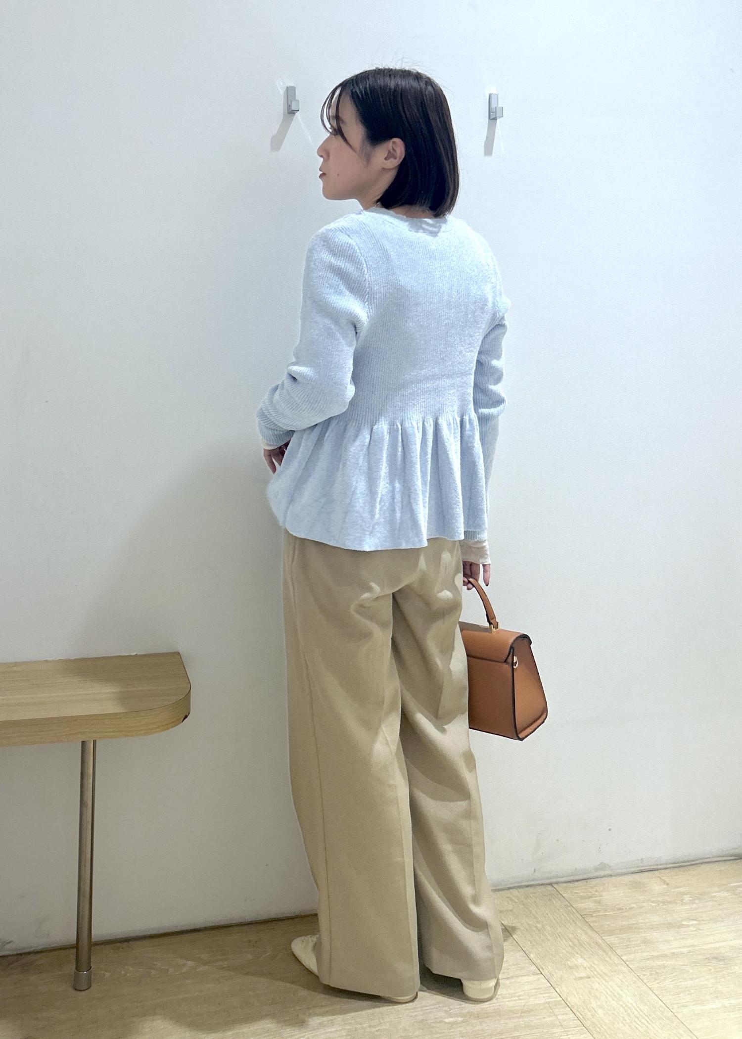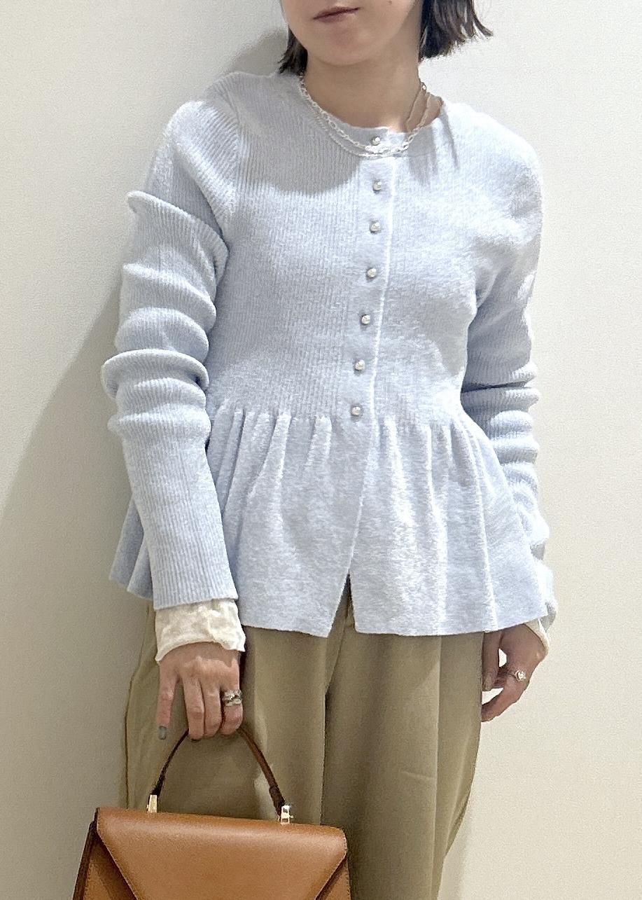 VISペプラム切替モールニットカーディガン/イージーケアサックス / F¥6,589レビューモールの柔らかい肌触りが特徴のペプラムカーディガンです。お尻が隠れる長さで腰まわりをカバーしてくれます。