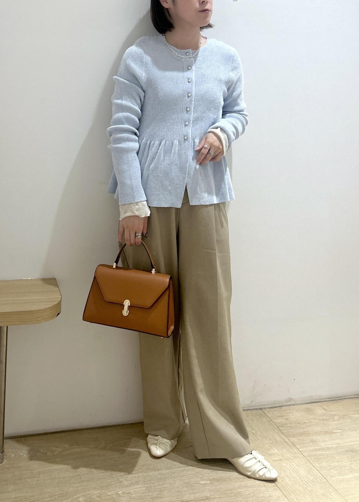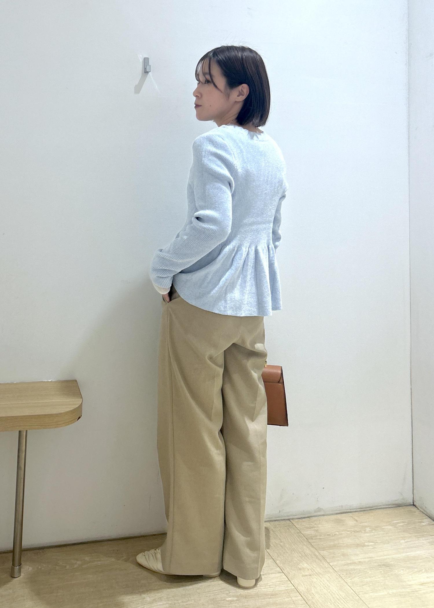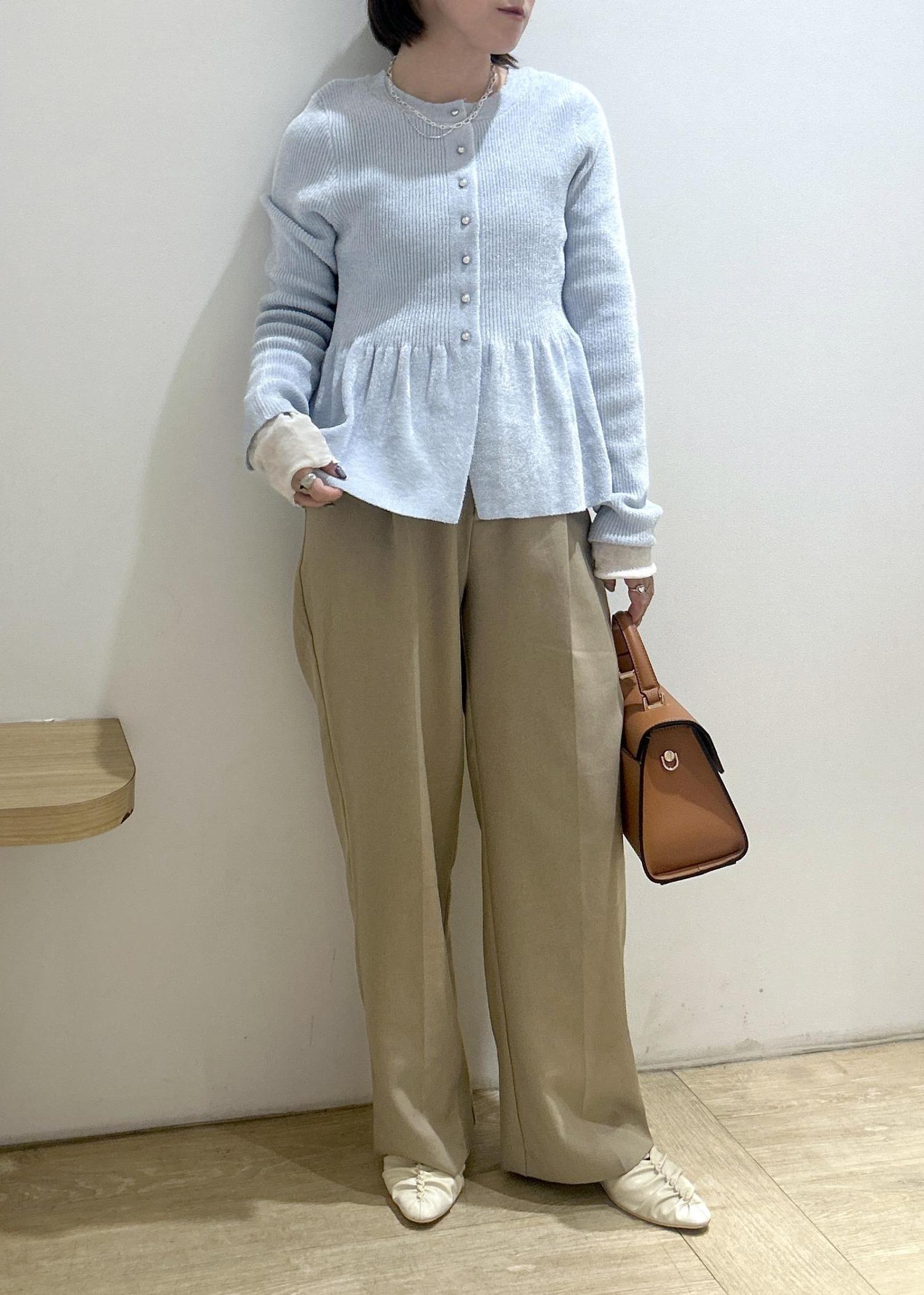 VISペプラム切替モールニットカーディガン/イージーケアサックス / F¥6,589レビューモールの柔らかい肌触りが特徴のペプラムカーディガンです。お尻が隠れる長さで腰まわりをカバーしてくれます。