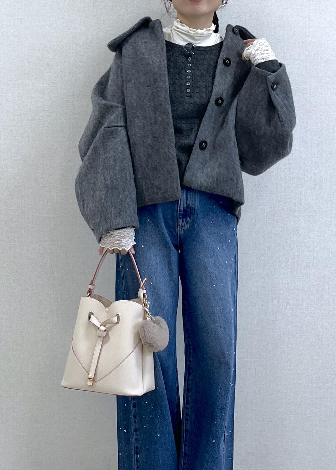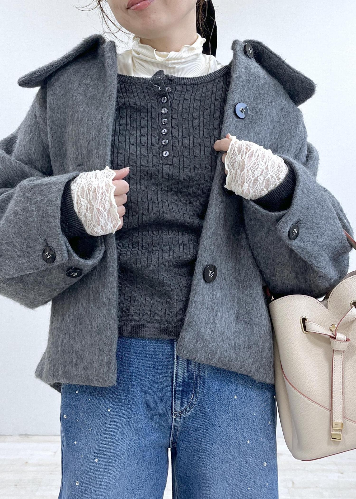 ゆるっとシルエットのショートコートに、袖レース×ケーブルニットでほんのり甘さをプラス。