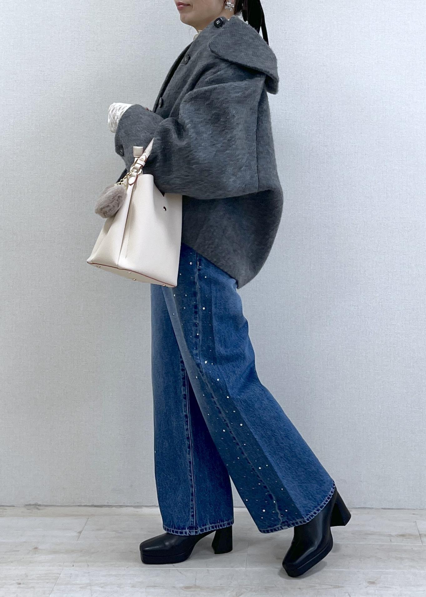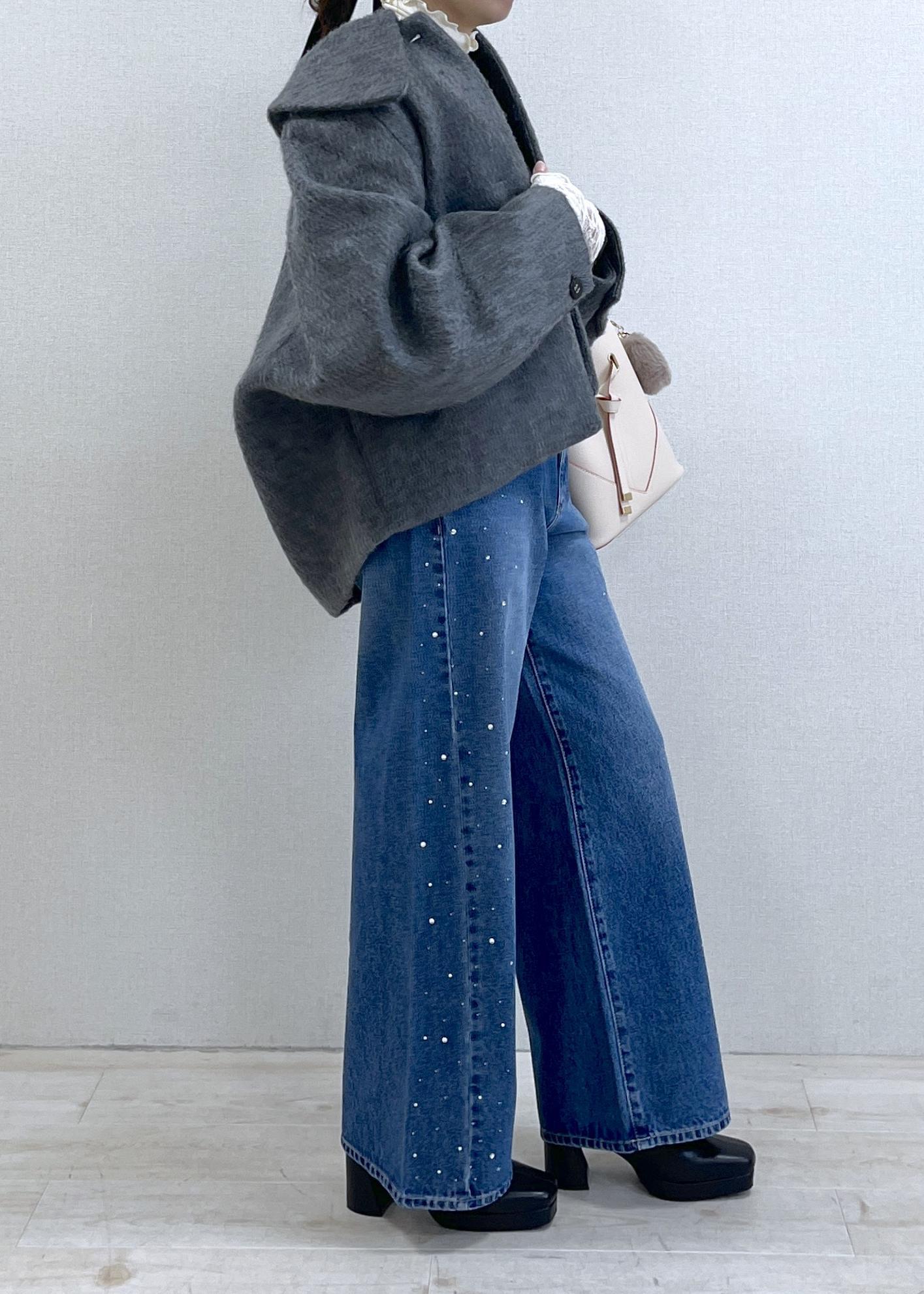 ビジューがきらめくデニムで、カジュアルだけど華やかな印象に。