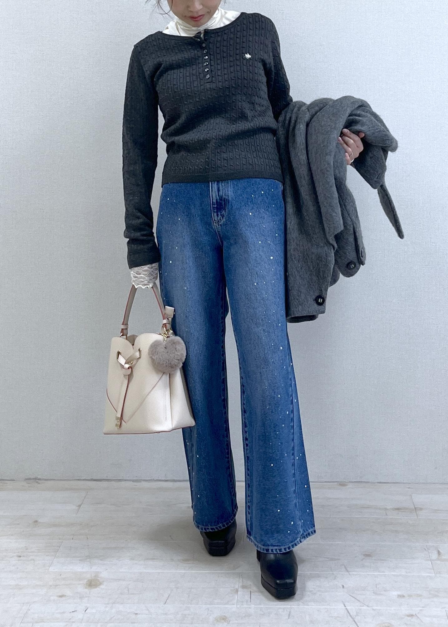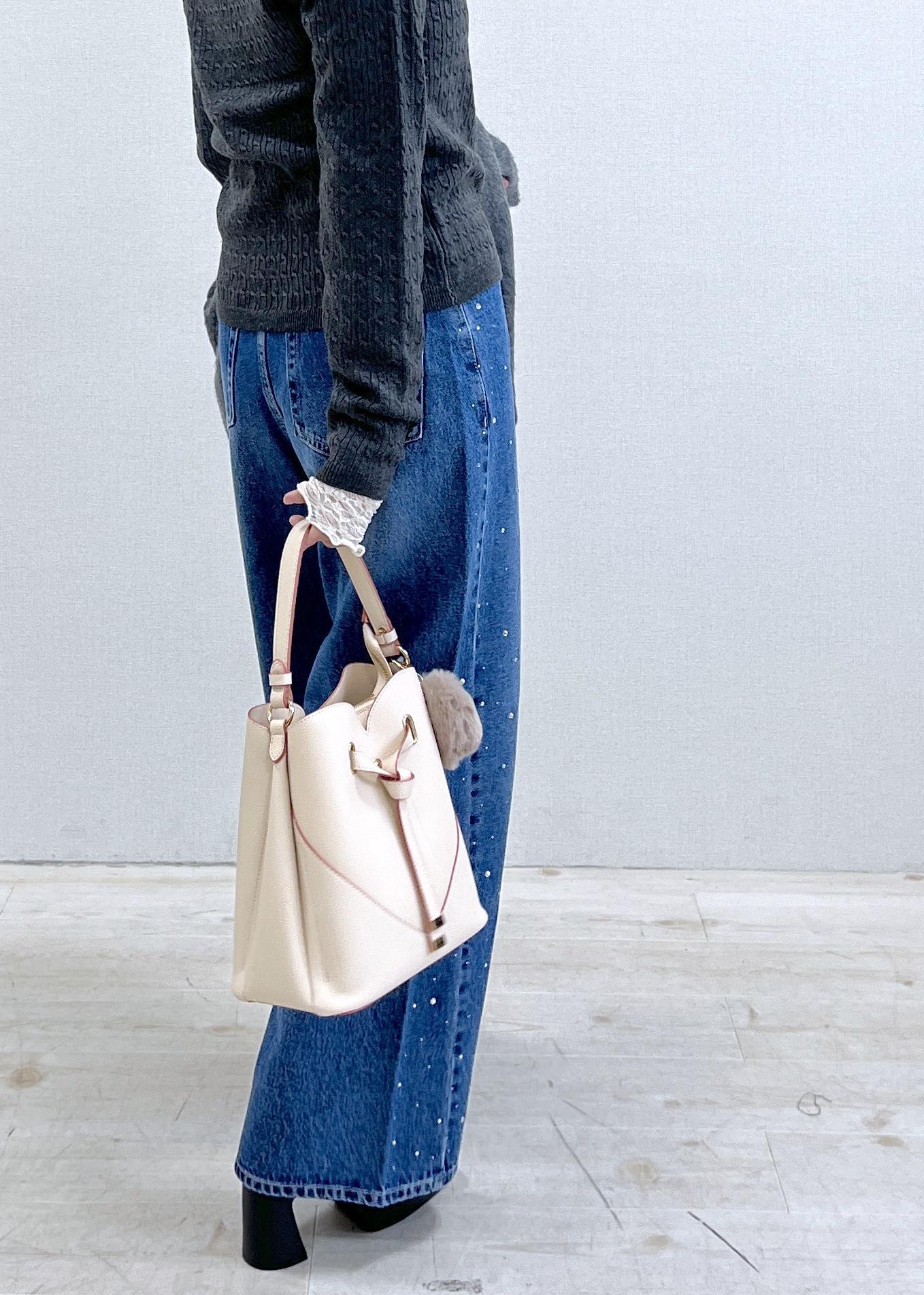 ベージュピンクバッグで抜け感を出せば、重たくなりがちな冬コーデも軽やか見え。