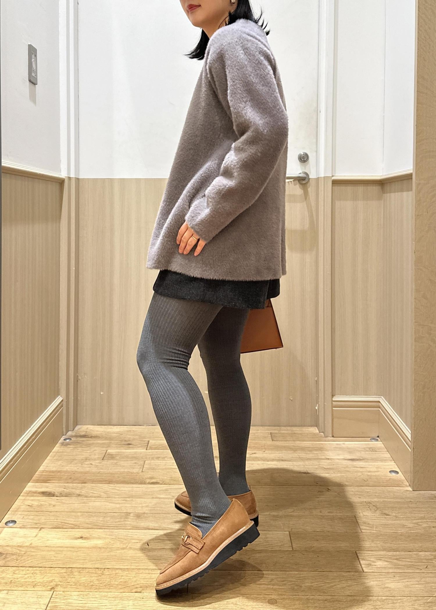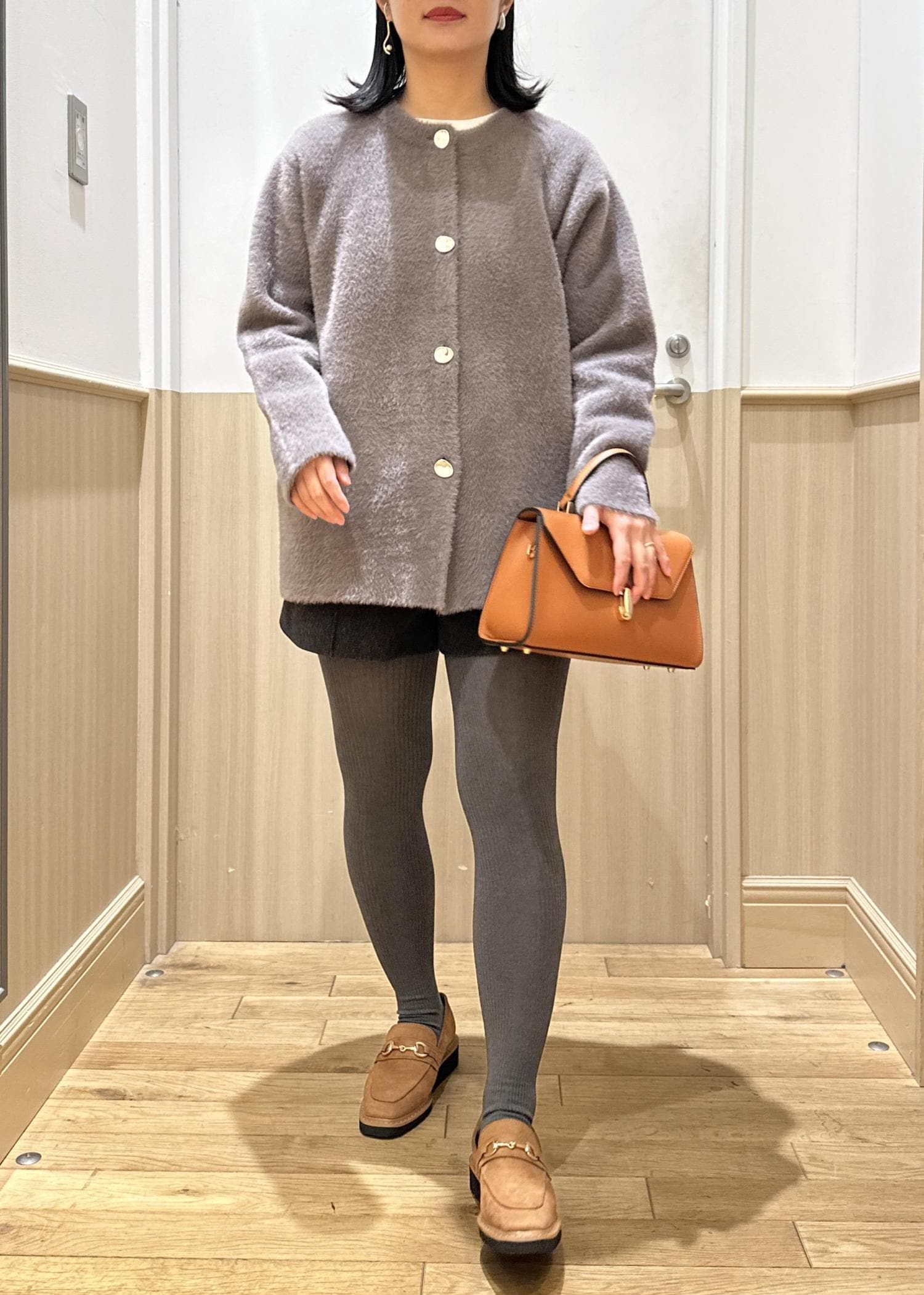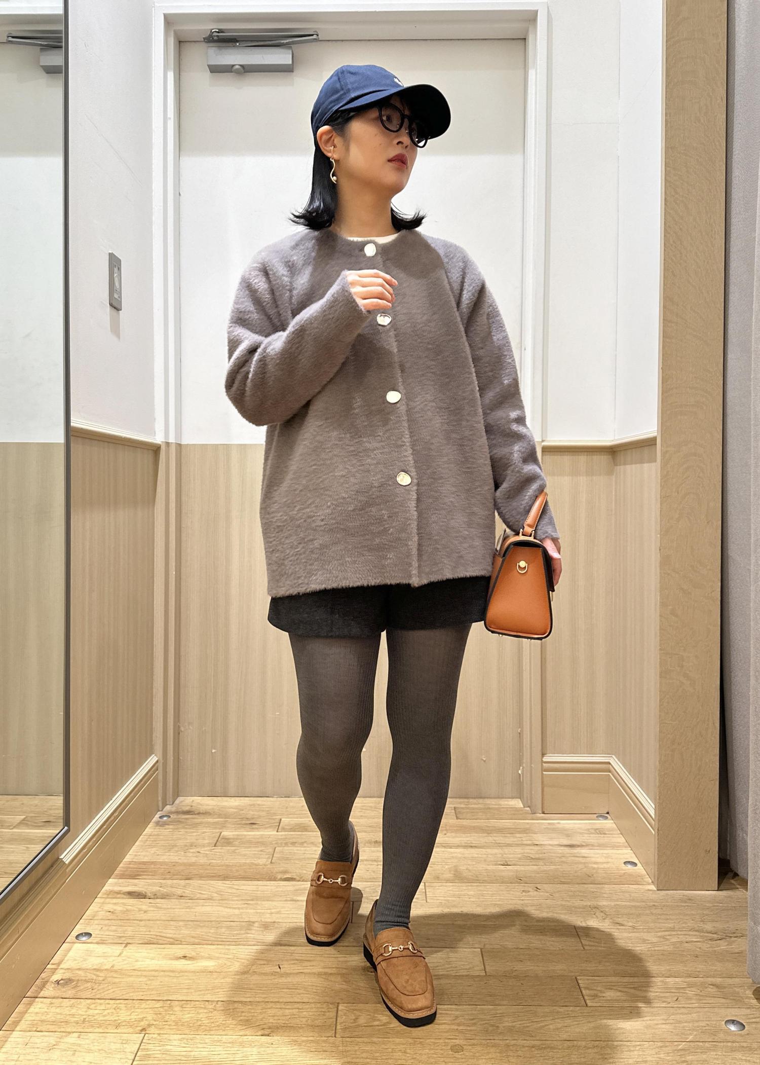 ルーズなサイジングのニットコートにはショートパンツで合わせるのが気分◎