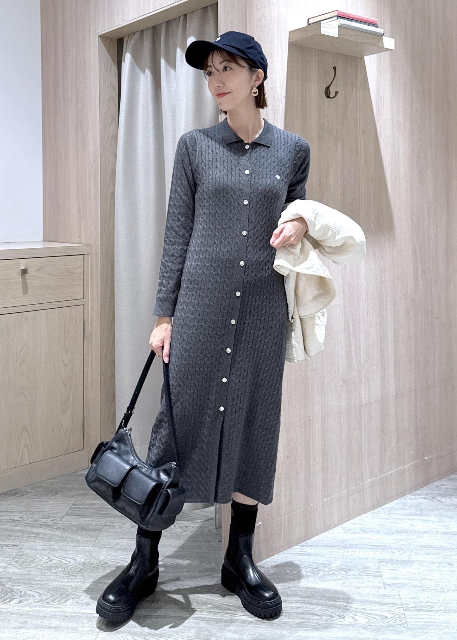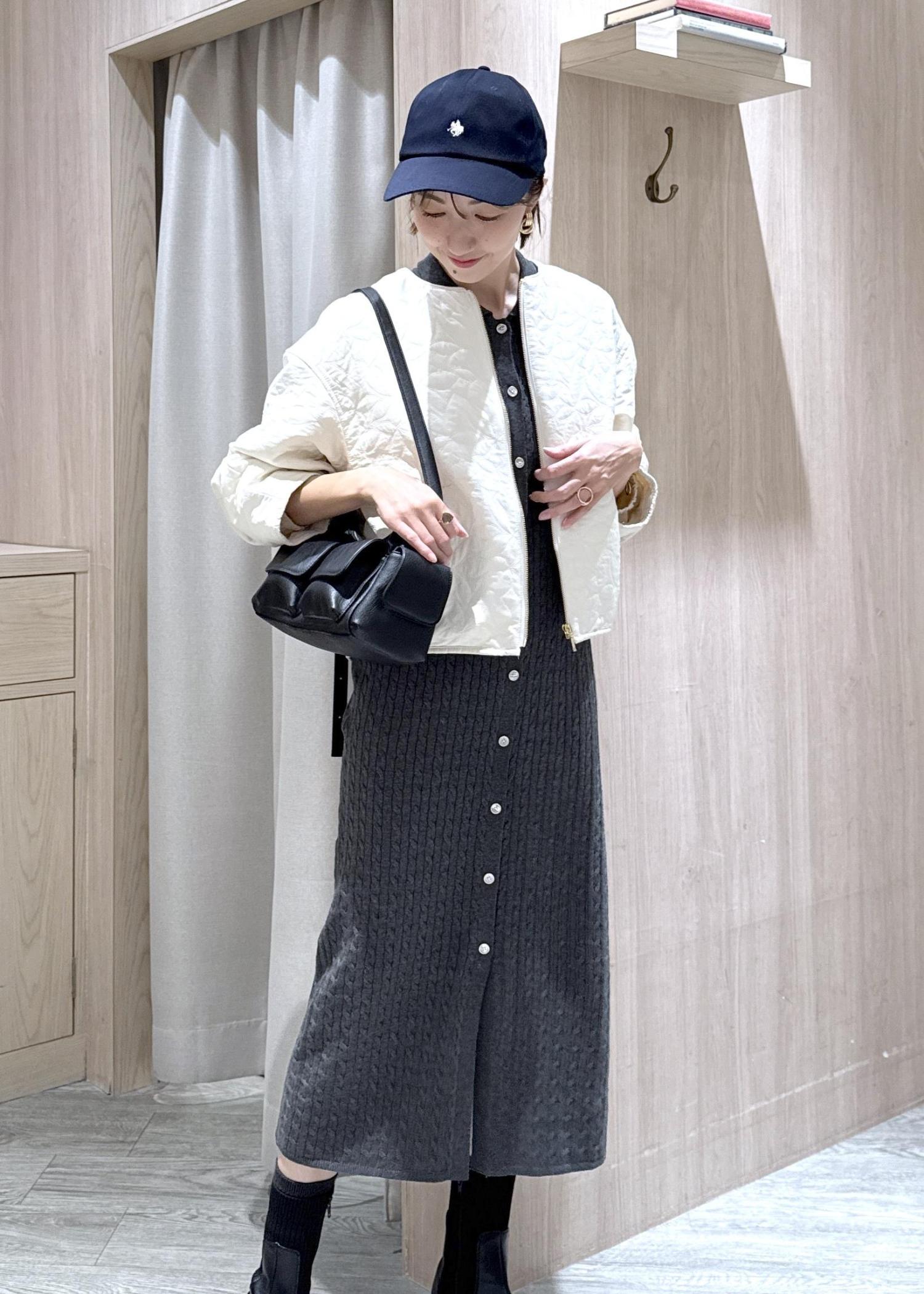 襟付きのニットワンピースをカジュアルなブルゾンとキャップで一気にカジュアルテイストにスタイリングしました♪