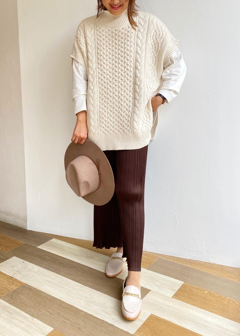 今季トレンドのニットベストコーデ。 ケーブル編み×ホワイトの鉄板合わせにしてみました。 ボトムにはこちらもトレンドのプリーツパンツ。 異素材合わせも可愛いですよね。