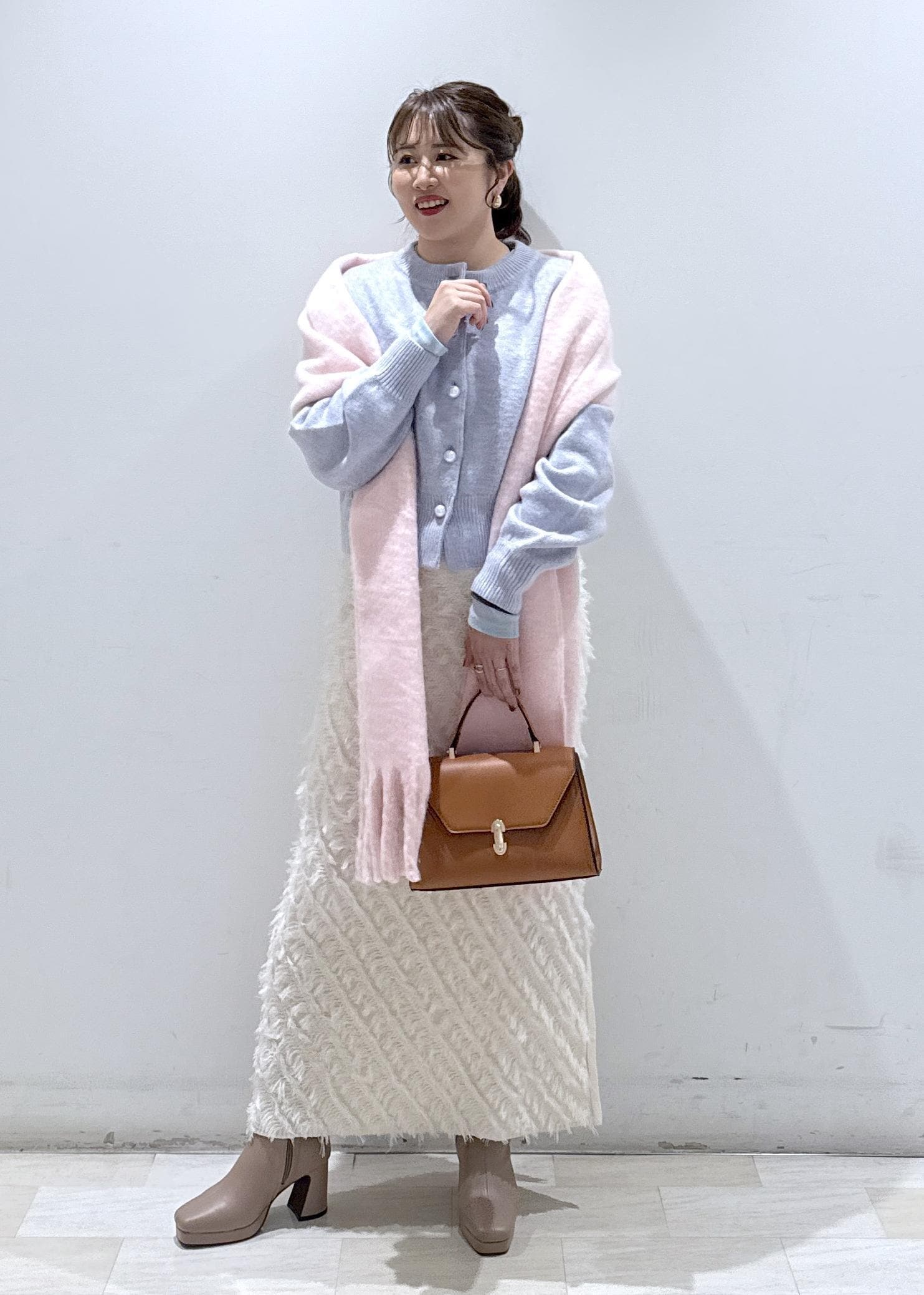 今回はVISで大人気なラメ入りのカーディガンに、白のフリンジスカートと合わせてファンタジーあるパステルカラーコーデにしてみました。ラベンダー×ピンクの組み合わせは顔周りをパッと明るく見せるのでオススメです!