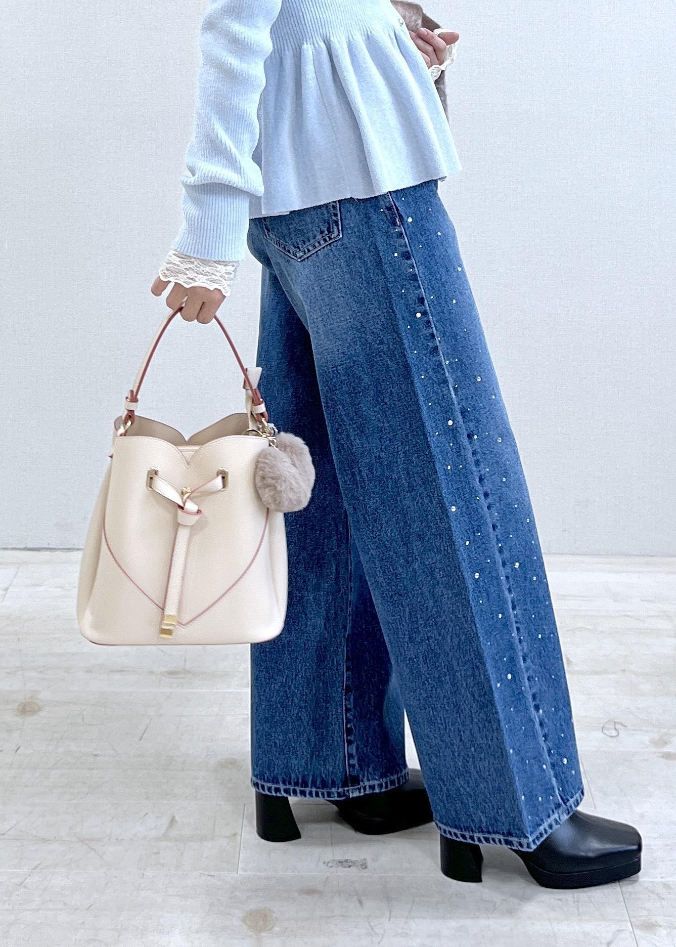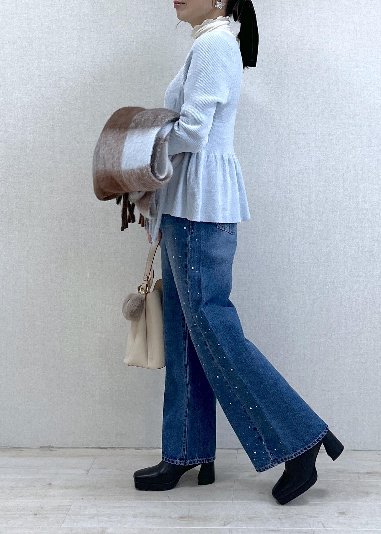 デニムは裾にかけて広がるワイドシルエットで、脚長効果も◎