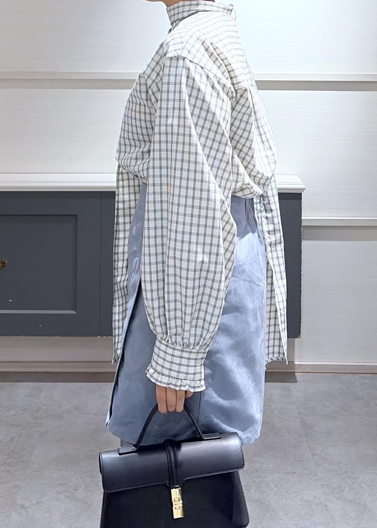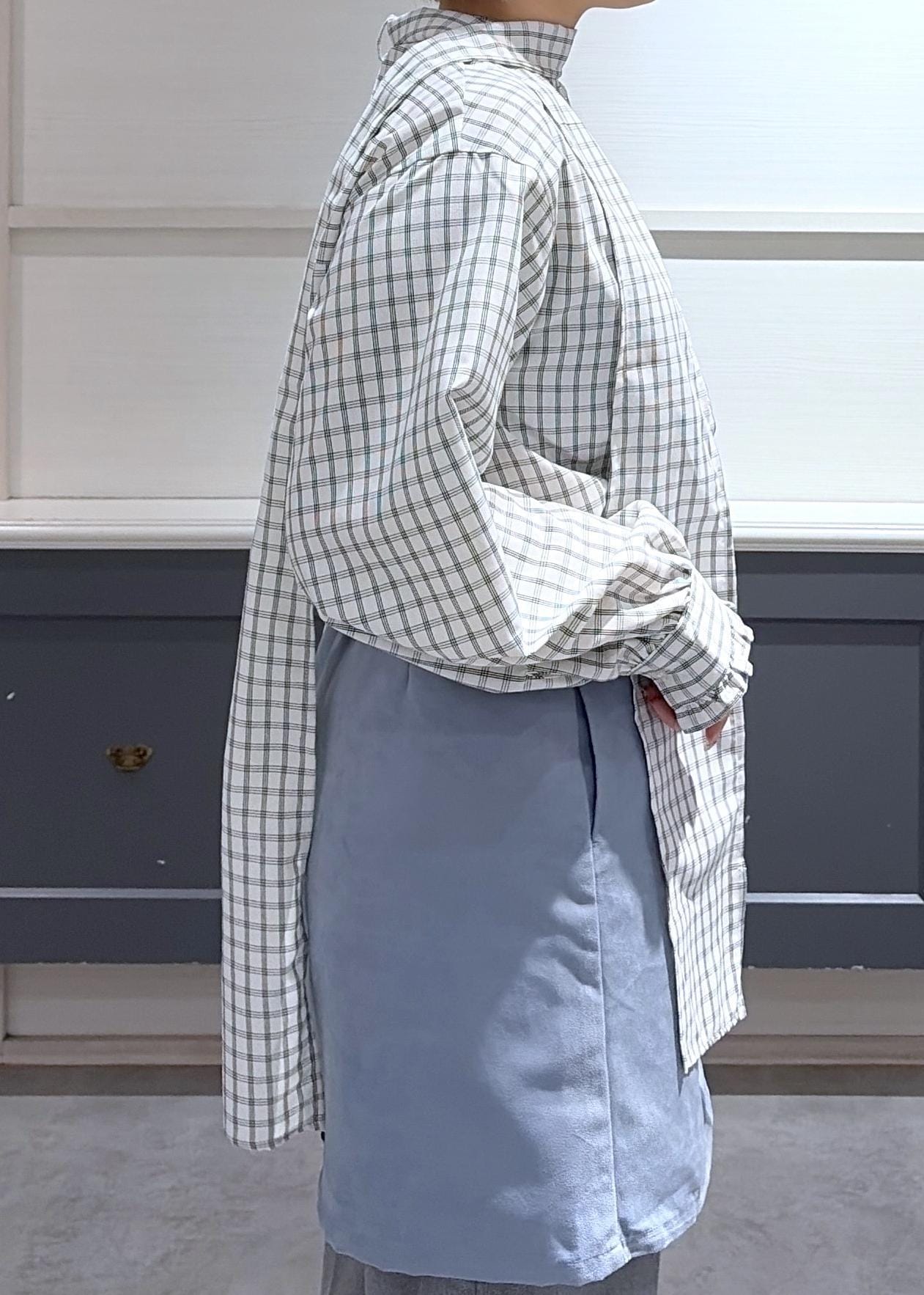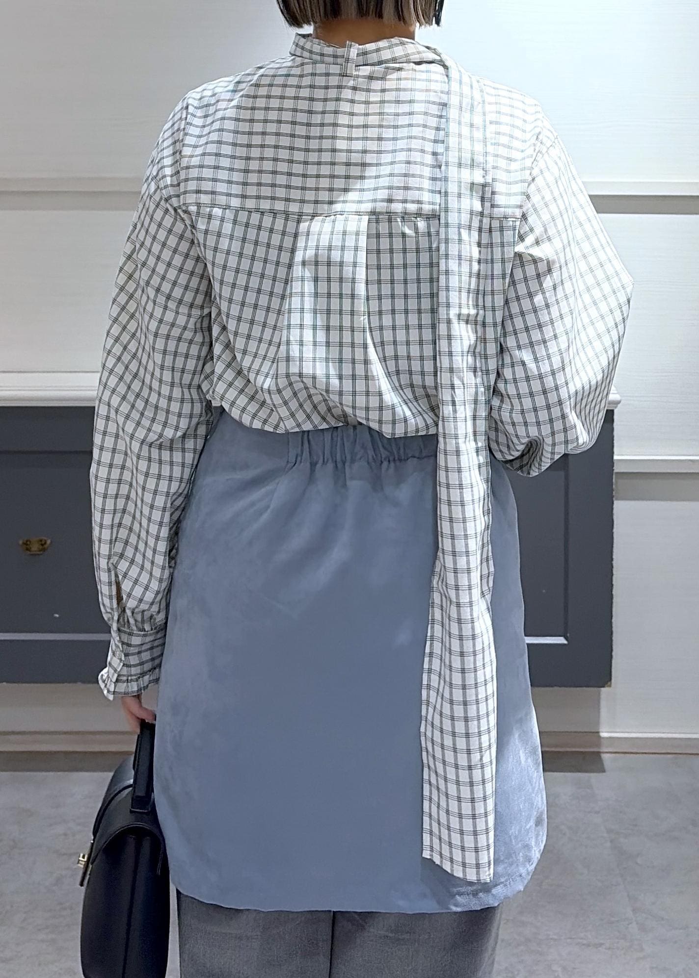 ゆるめのチェックシャツにブルーのスカートを合わせた