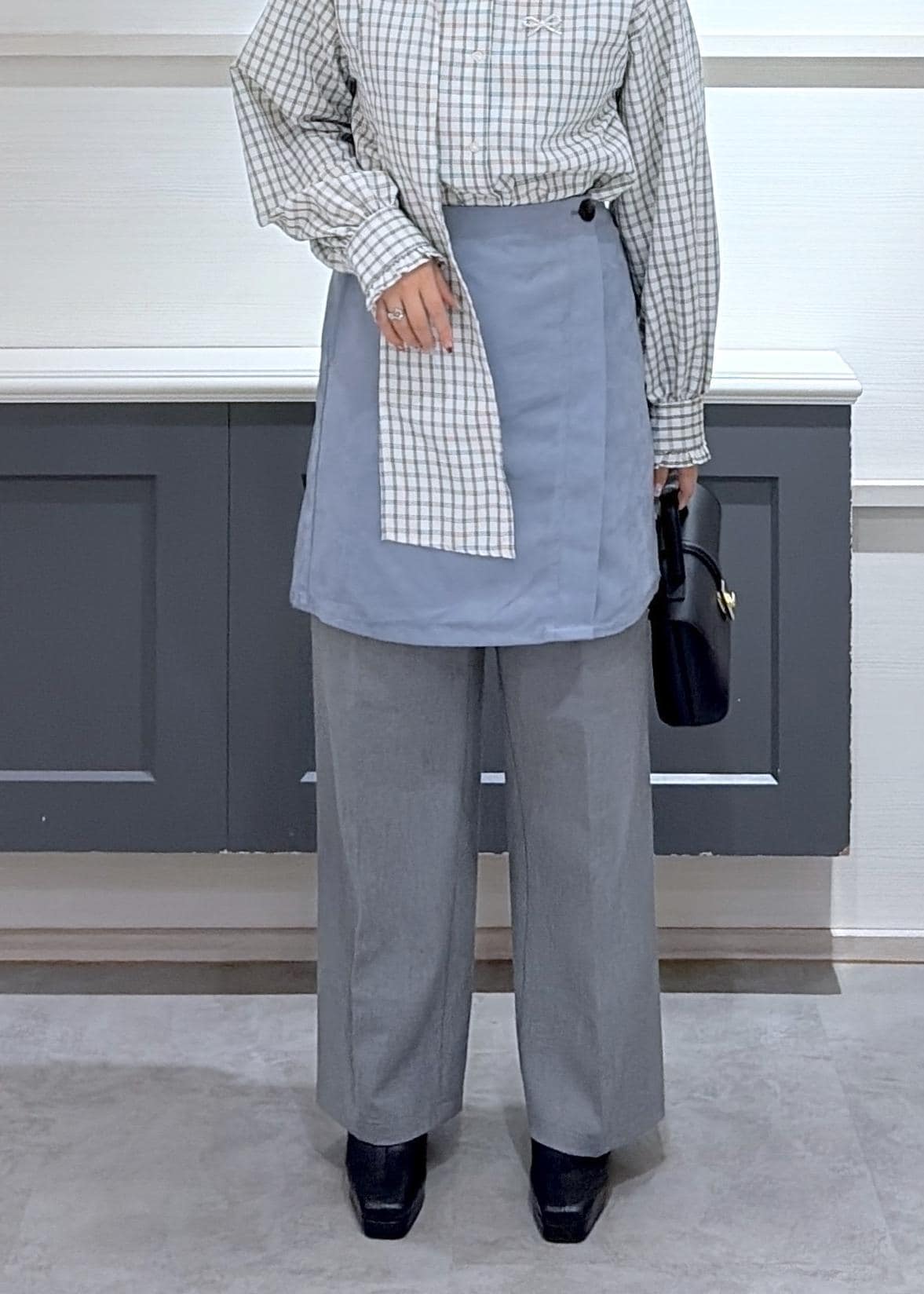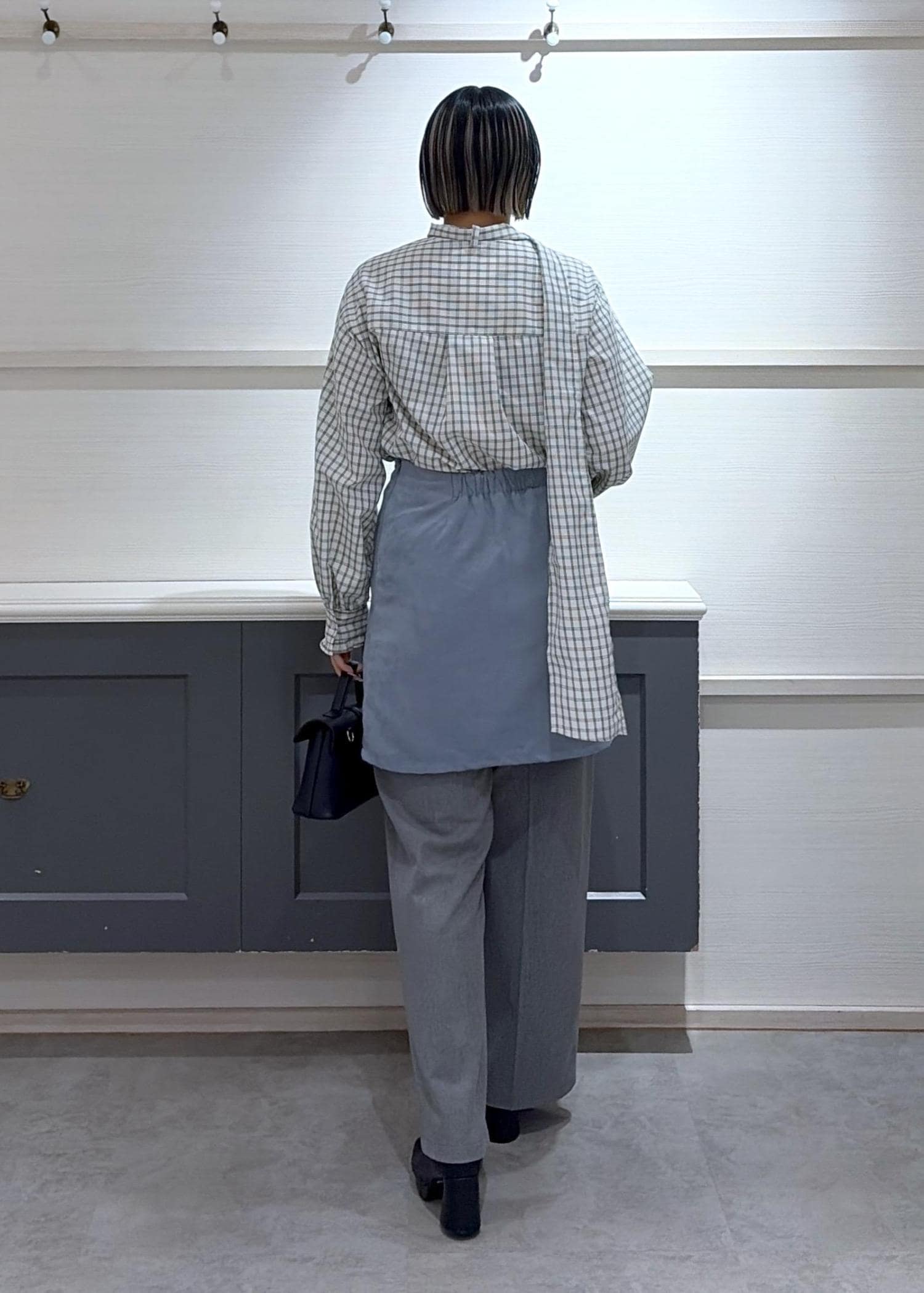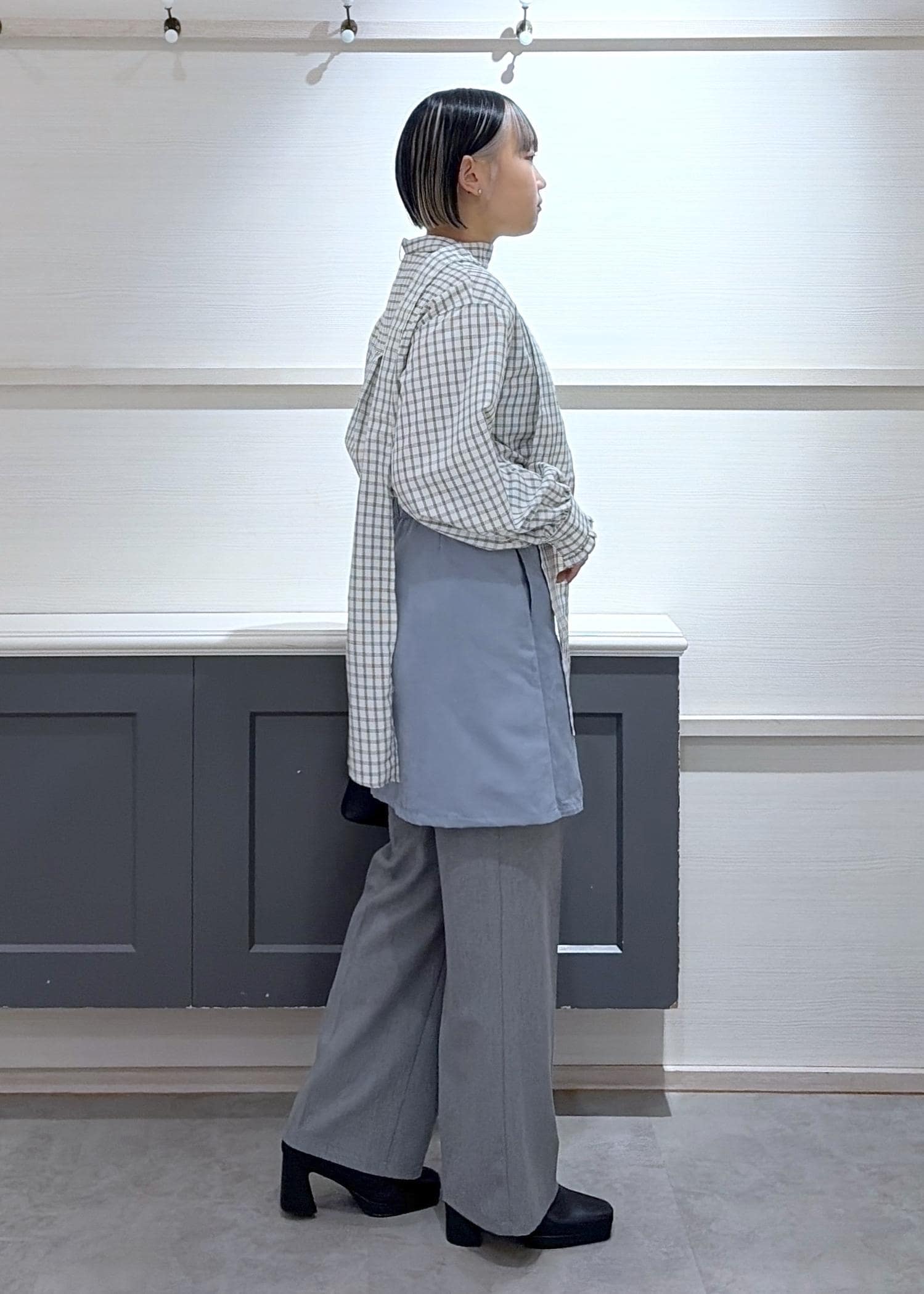 ゆるめのチェックシャツにブルーのスカートを合わせた