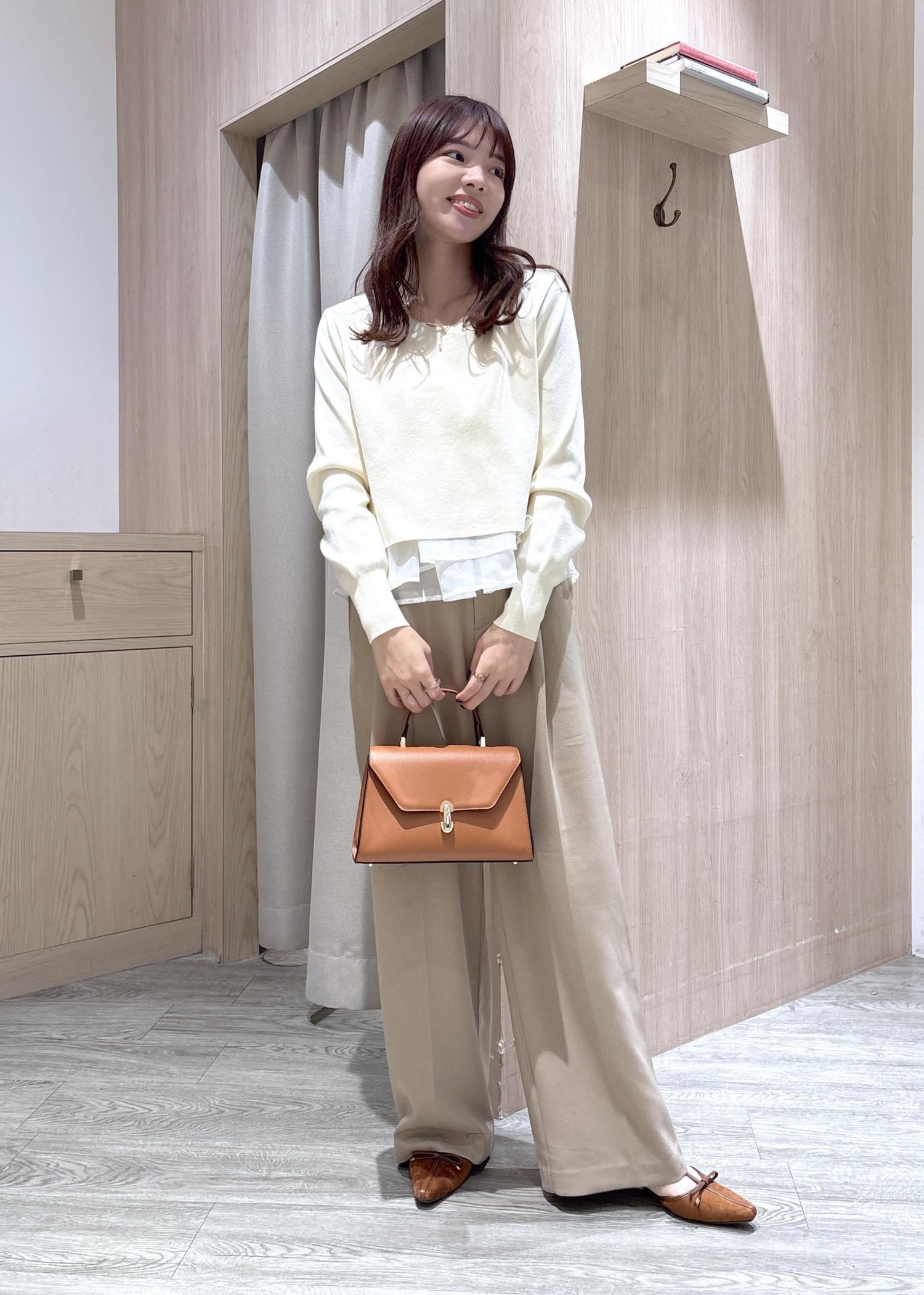 トップスはレイヤードスタイルなのでアウターを脱いでも可愛く柔らかいコーデに◎