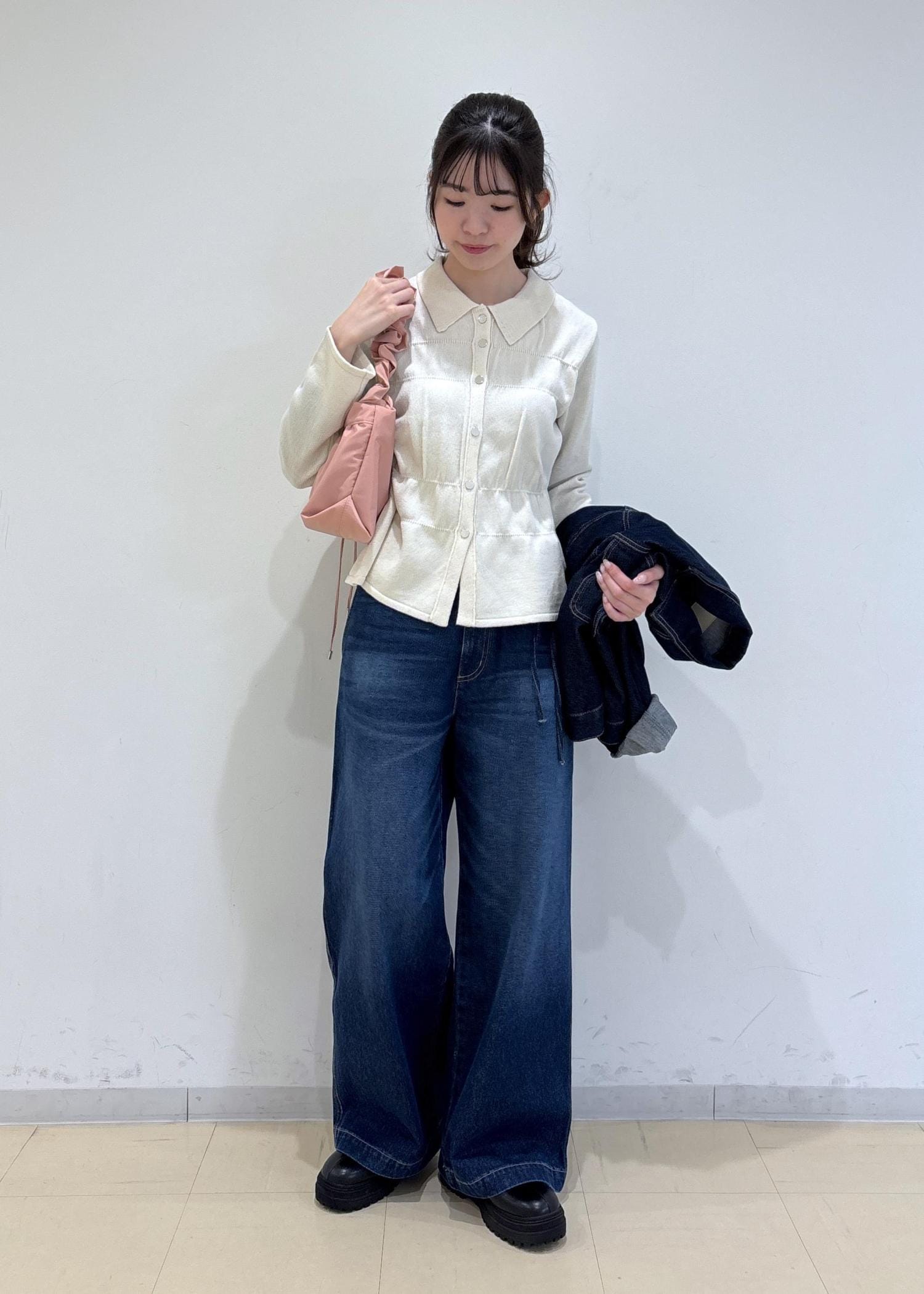ペプラムシルエットのトップスにデニムを合わせたキレカジコーデです。