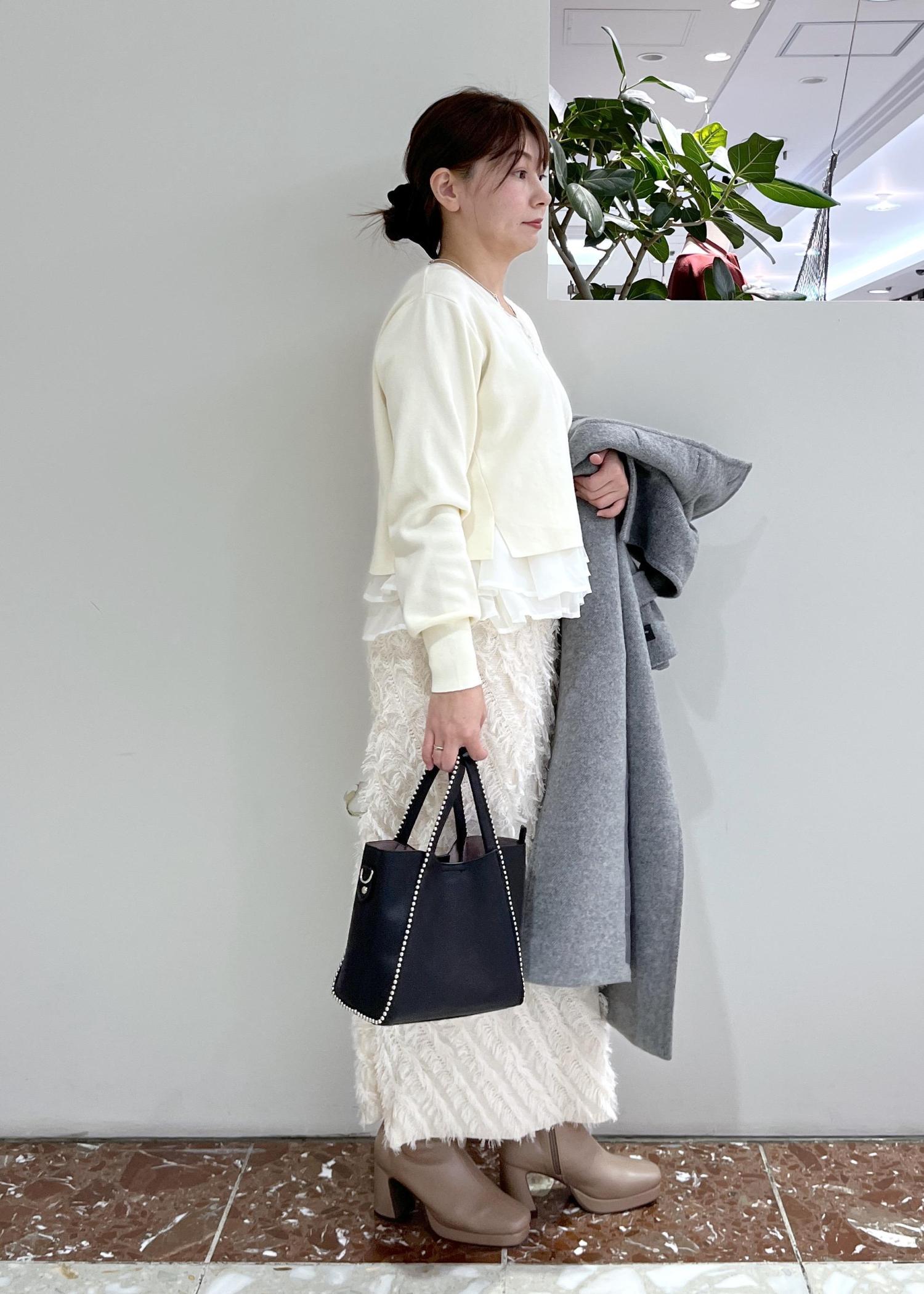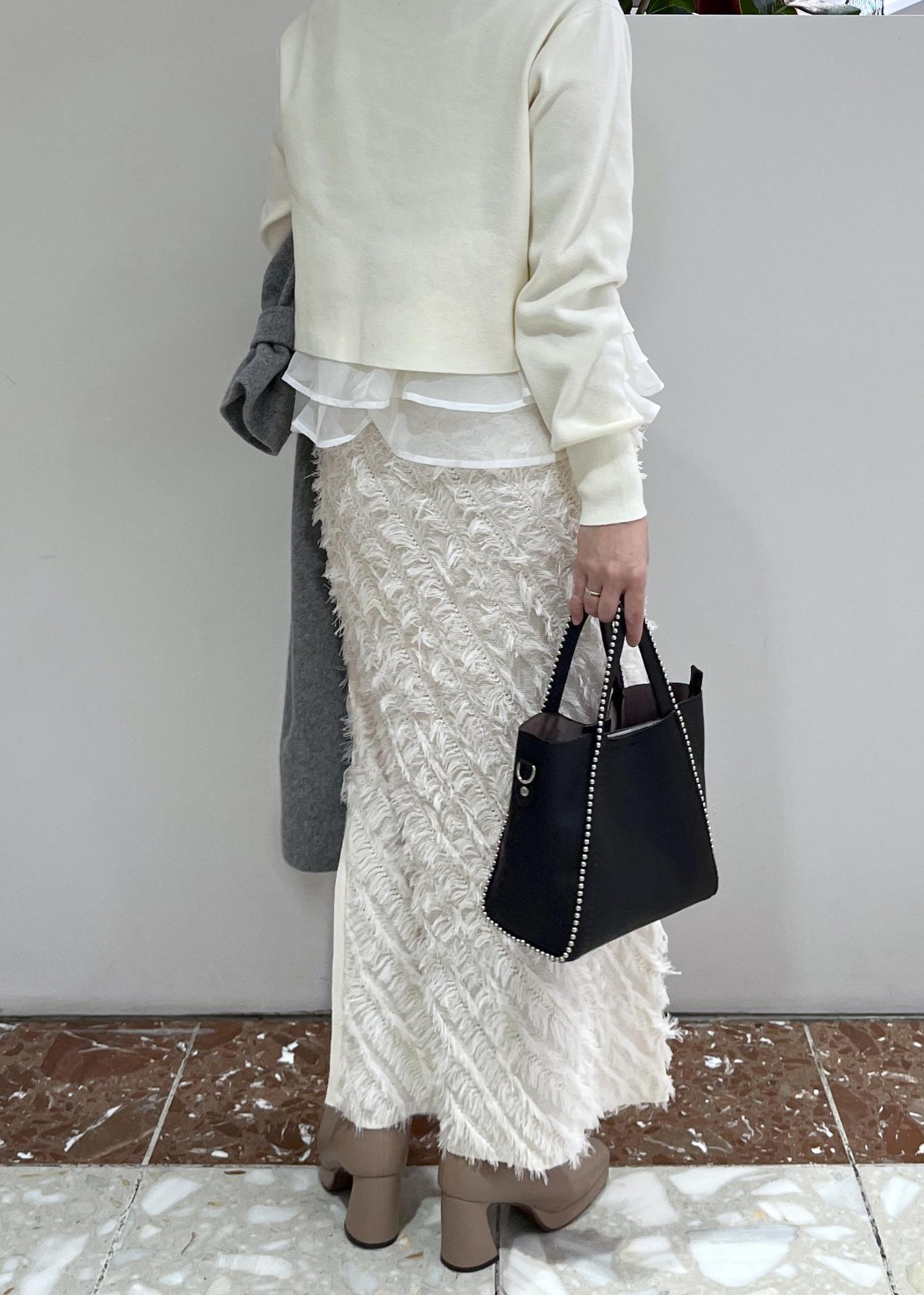 VISフリンジニットナロースカートキナリ / F¥4,612レビューフリンジが入ったデザイン性のあるニットスカートです。157cmで、ウエストがゴムなのでお好みの位置に調節して履くことが出来ます。