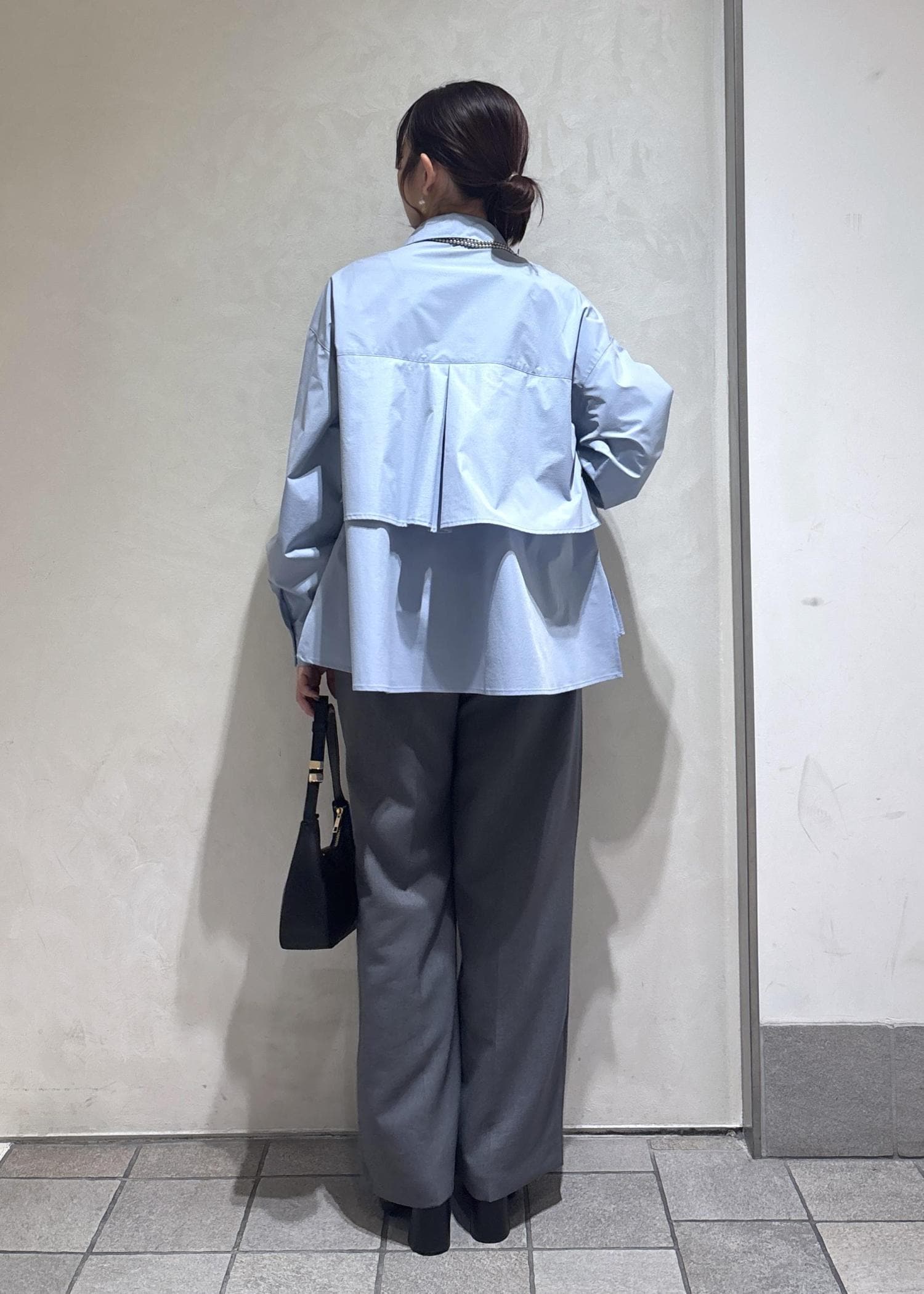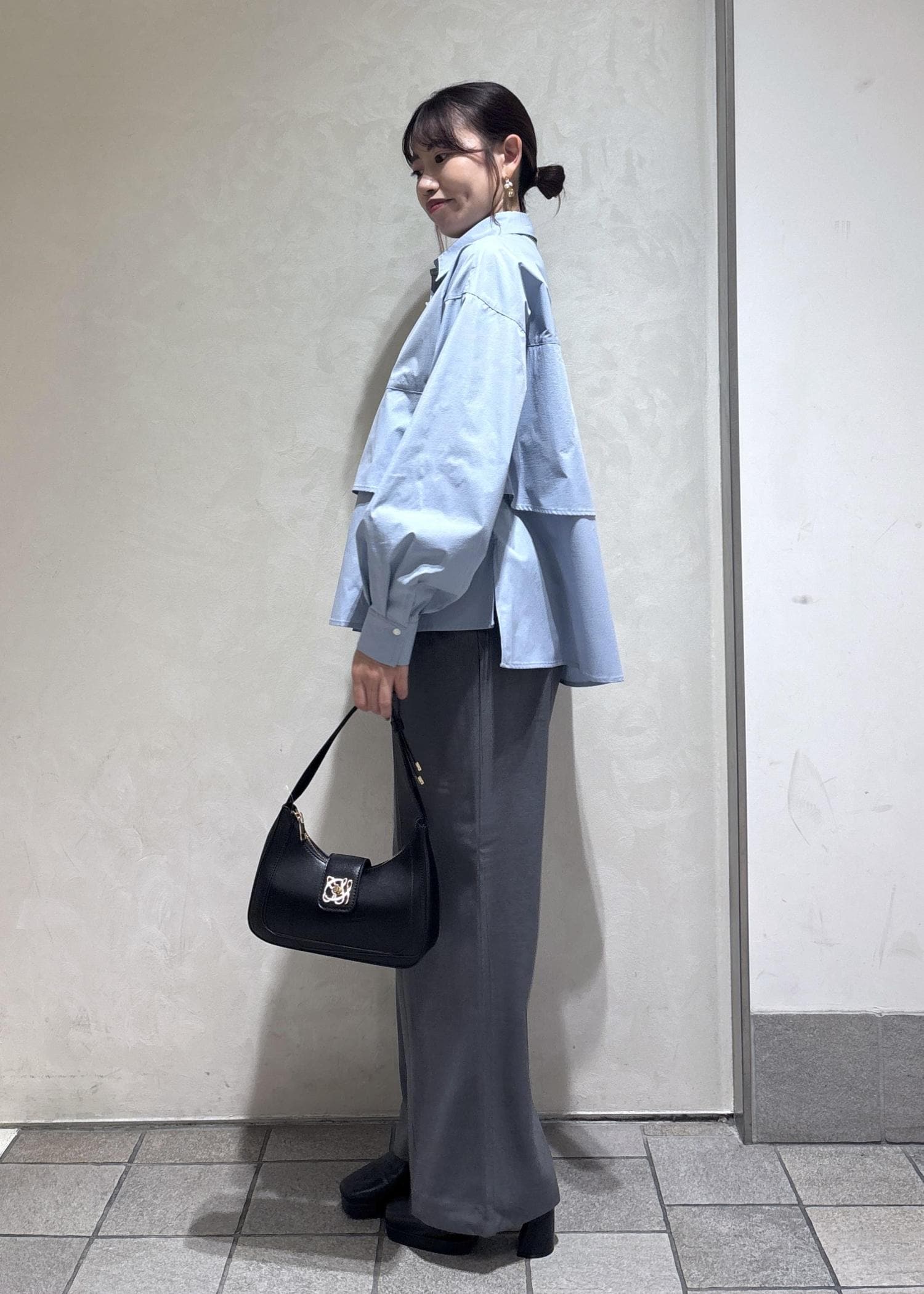 sax blue shirt × gray pants