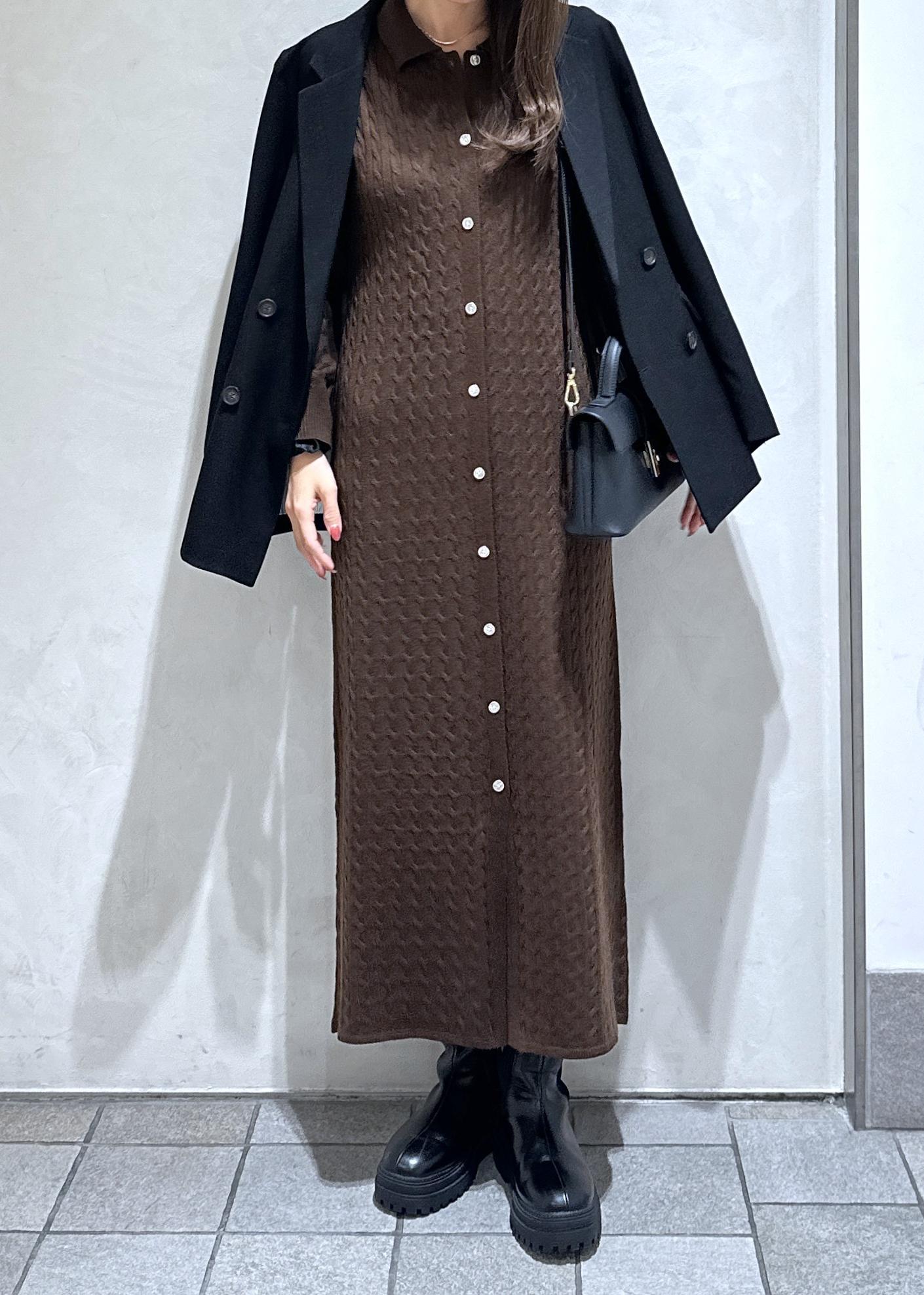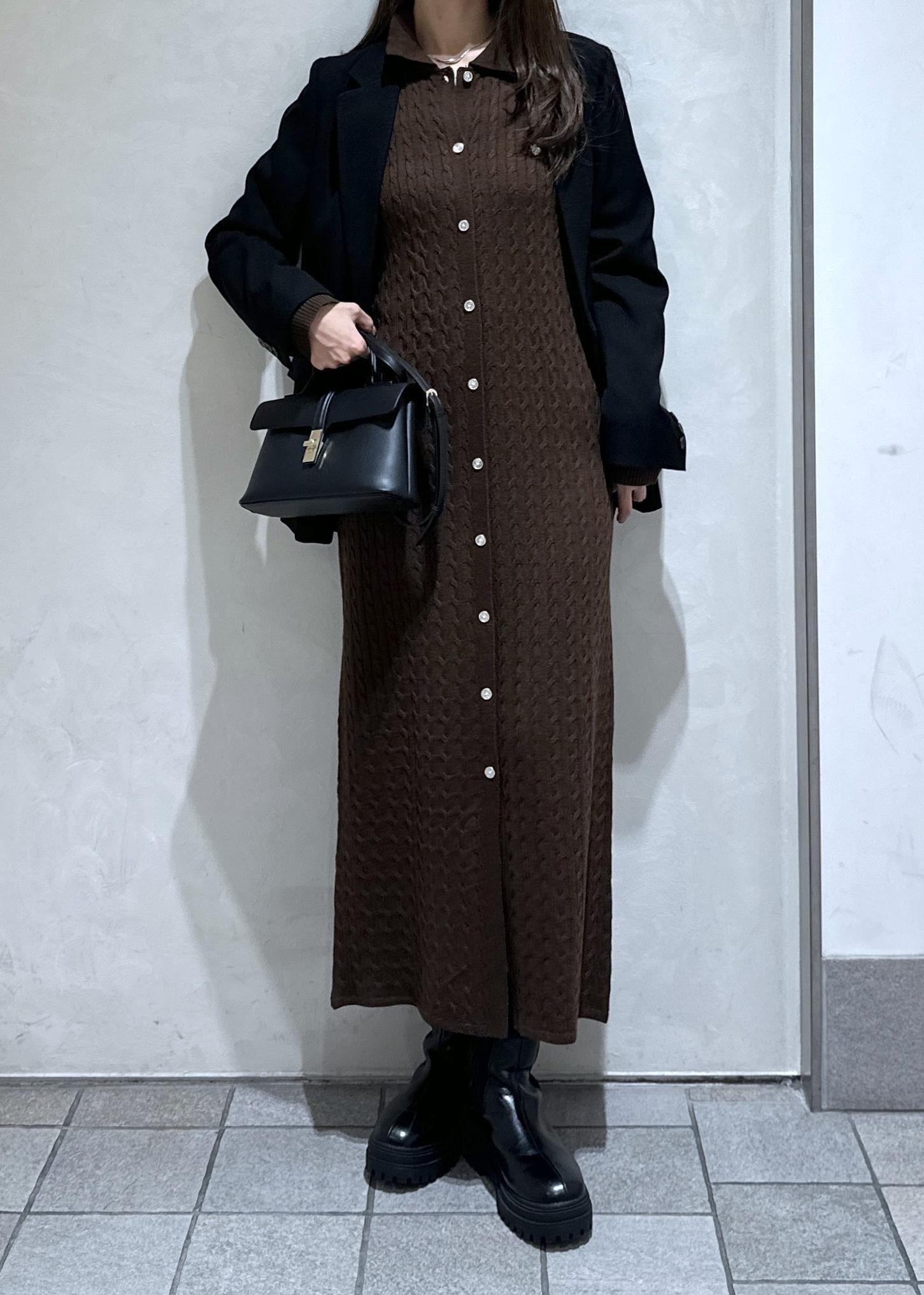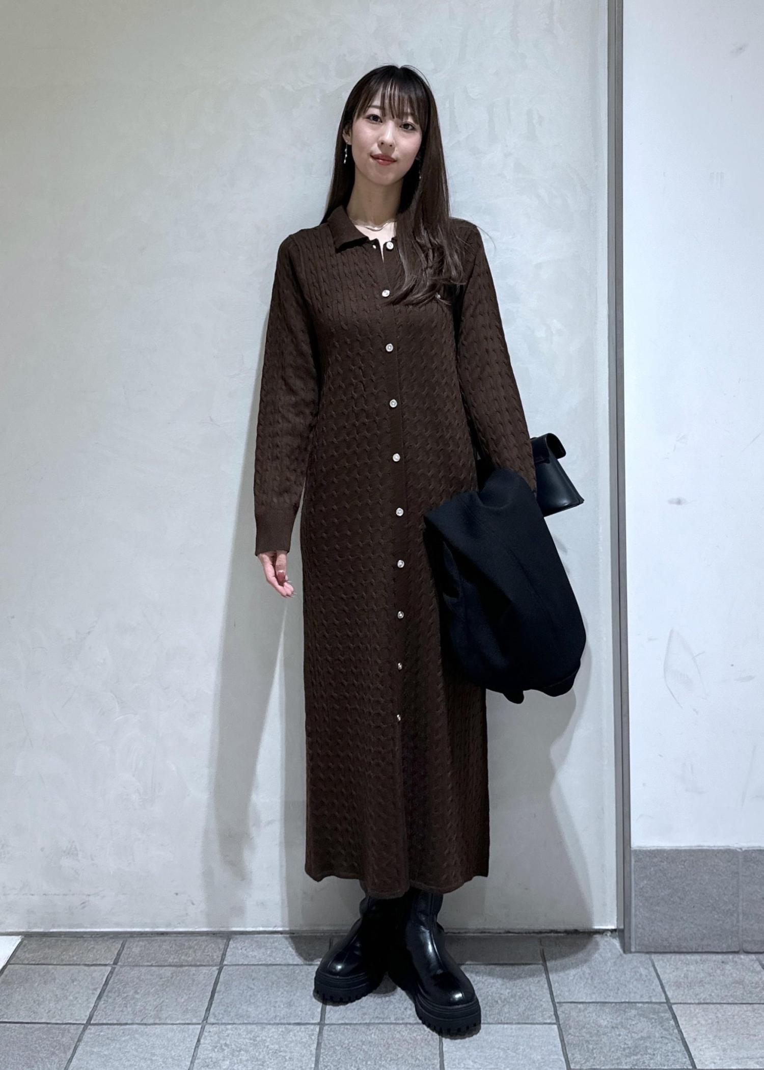 VIS【POLO BCS】VIS別注ニットワンピースダークブラウン / F¥9,900レビュー165cmの私が着用しても丈間は長めになりました!前のボタンが一つだけしか開かないので前が開く心配がなく着用できます!