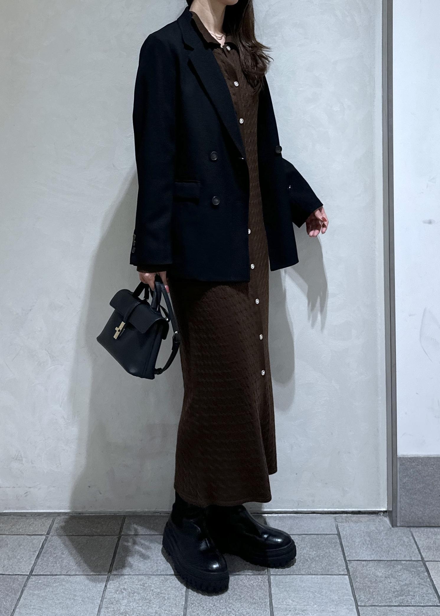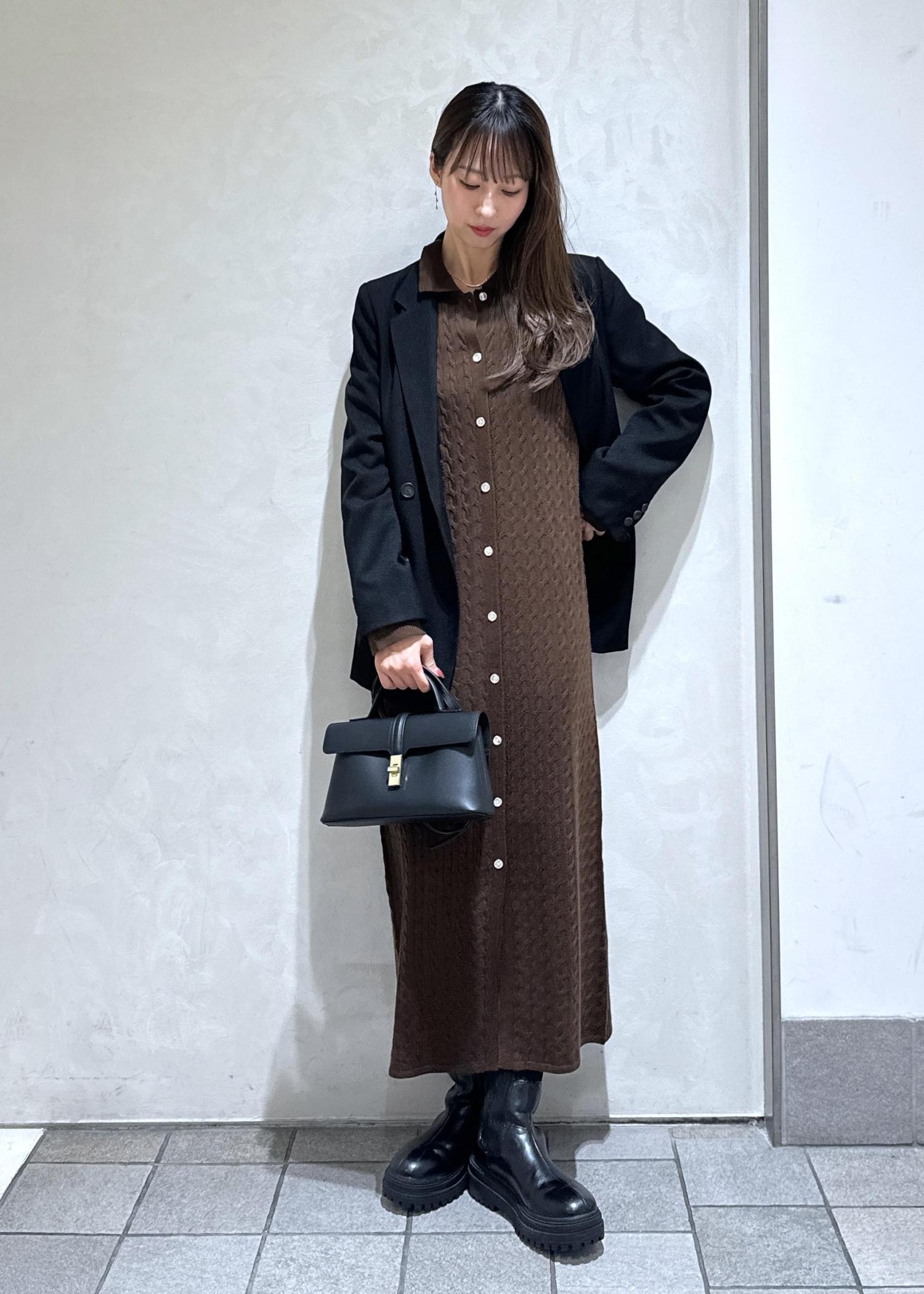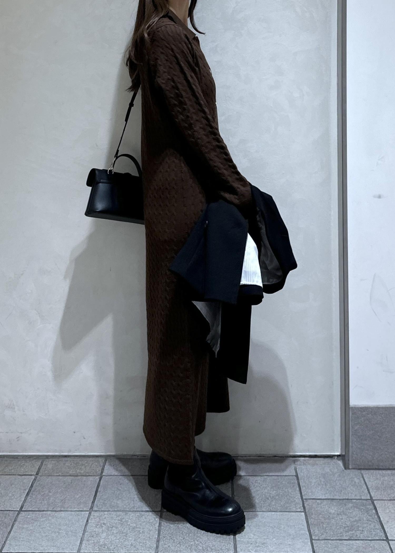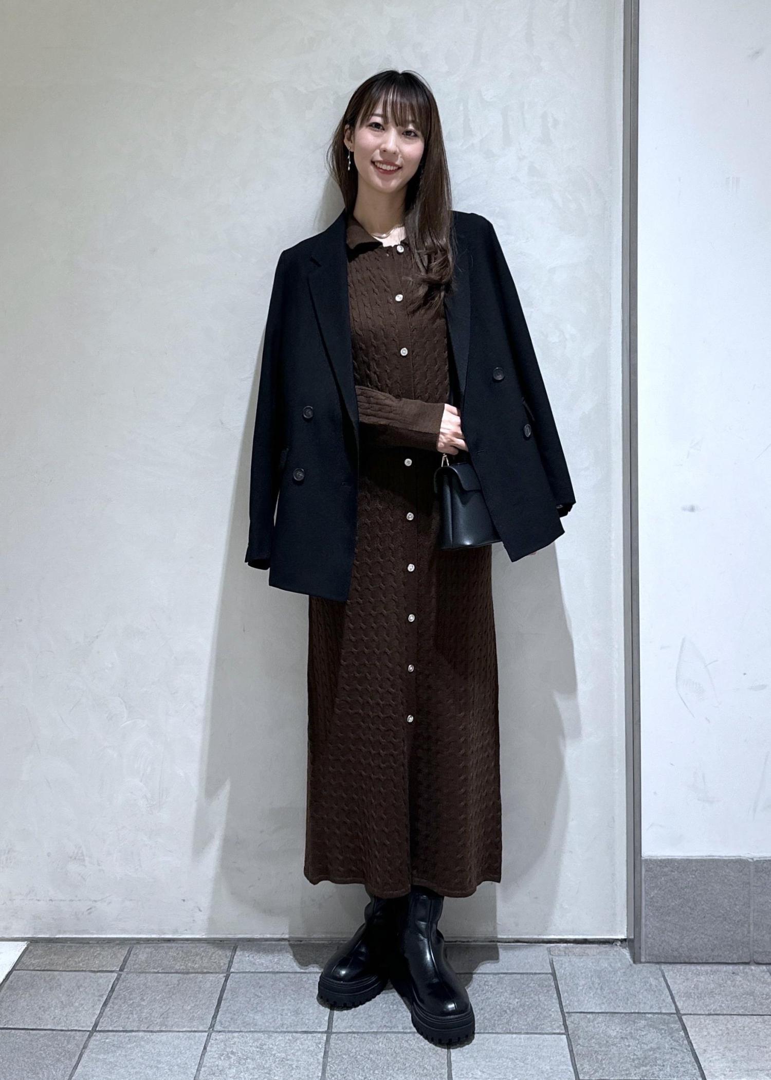 VIS【POLO BCS】VIS別注ニットワンピースダークブラウン / F¥9,900レビュー165cmの私が着用しても丈間は長めになりました!前のボタンが一つだけしか開かないので前が開く心配がなく着用できます!