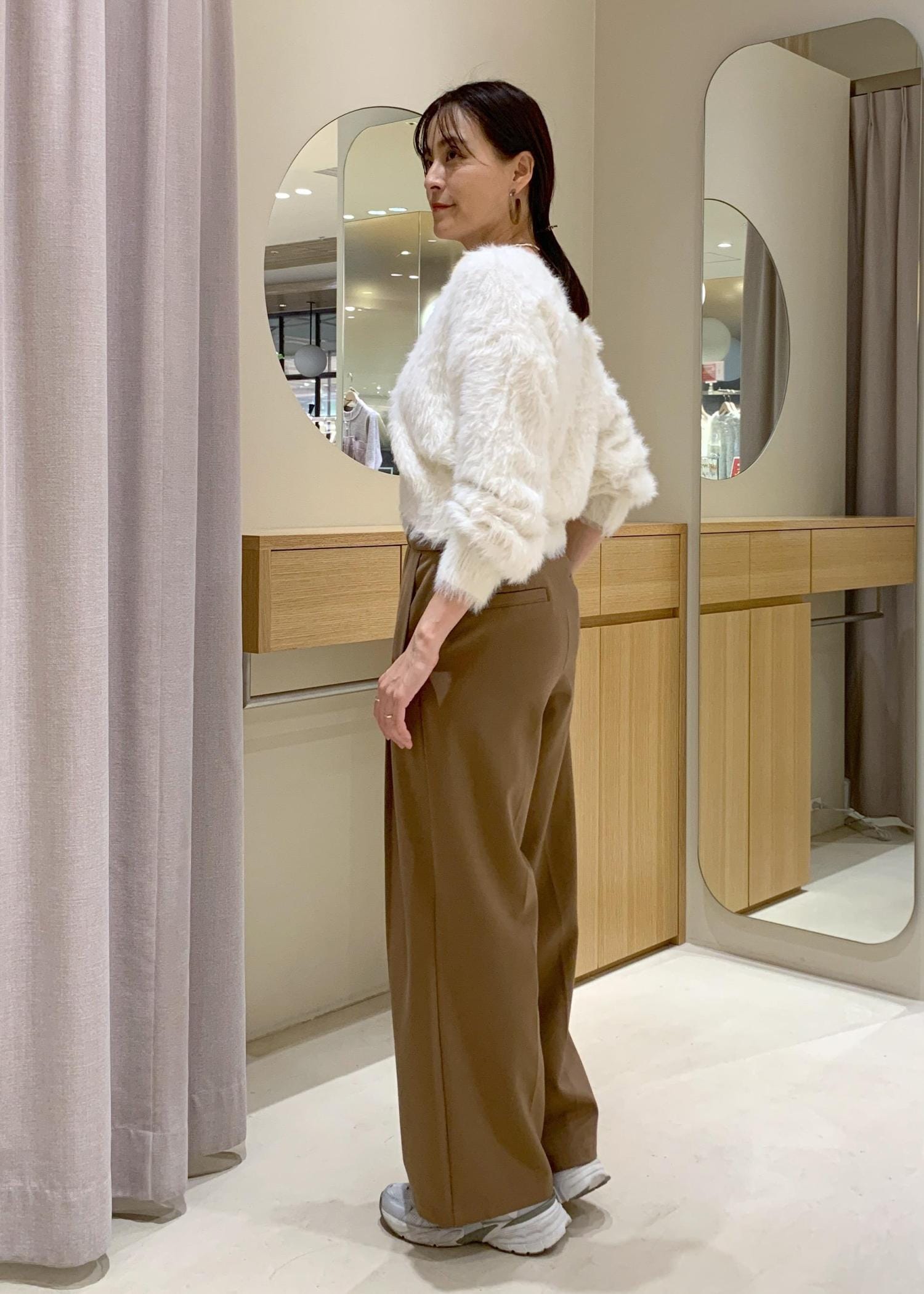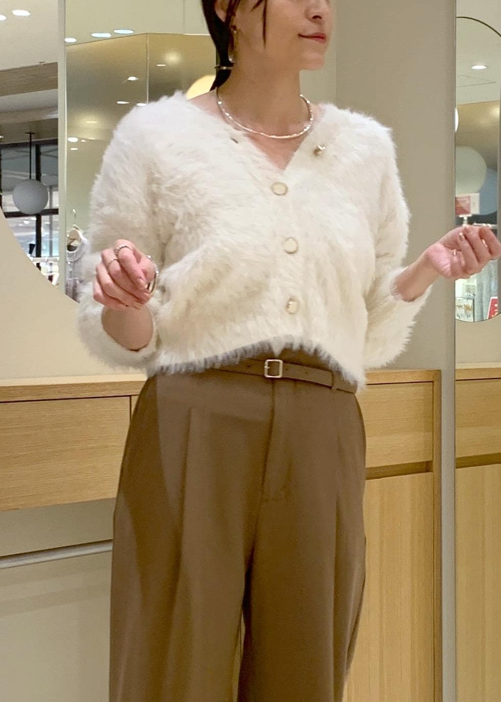 ふわふわした柔らかい質感、着用していて軽さがあります。着膨れしてしまう程の肉厚感ではないので、シャツやタートルなどの重ね着がしやすいです。