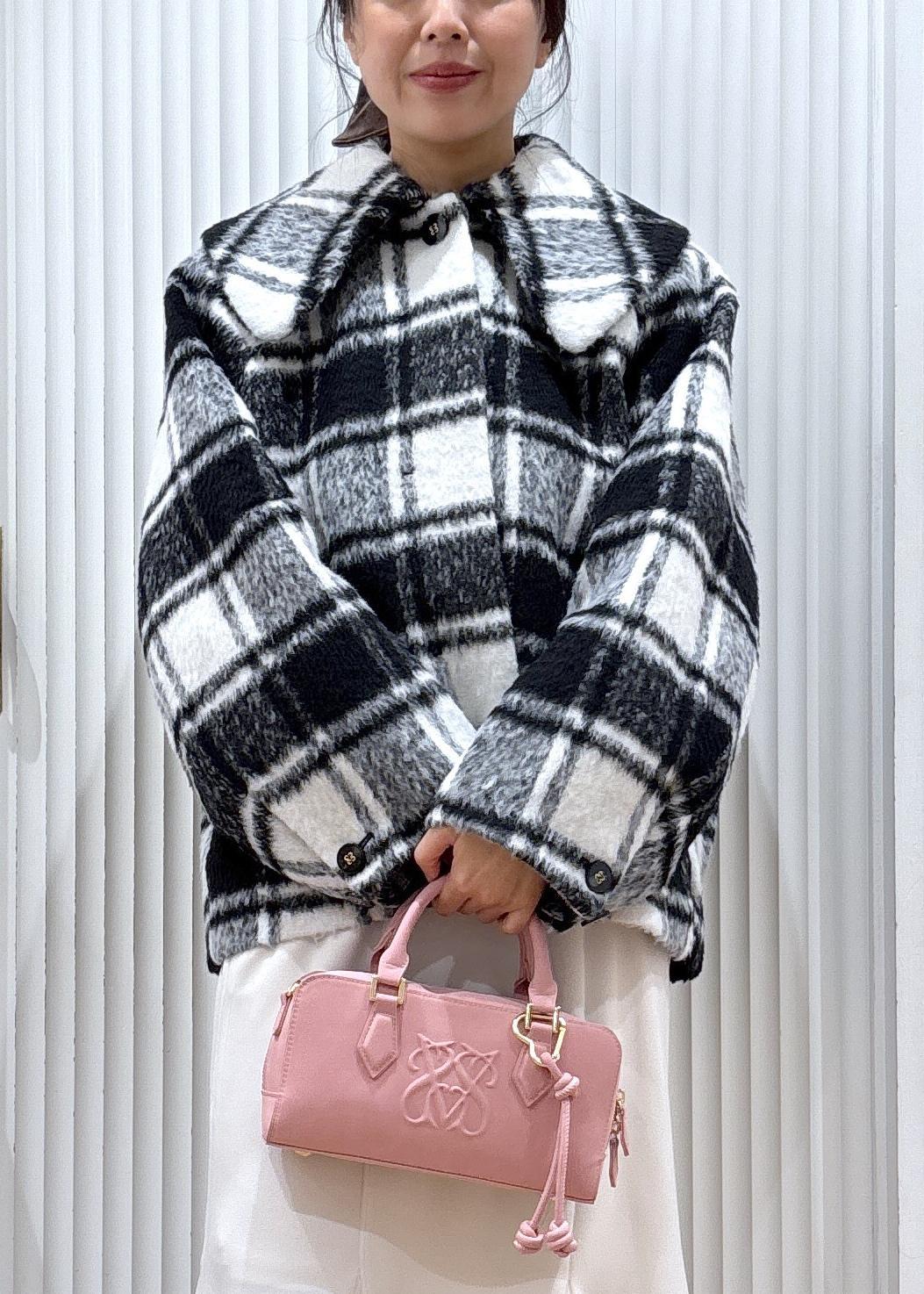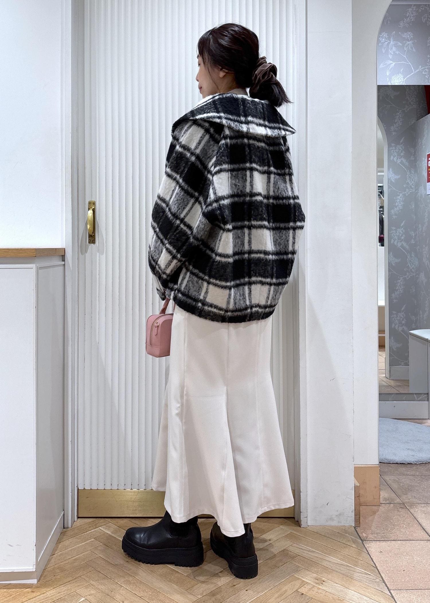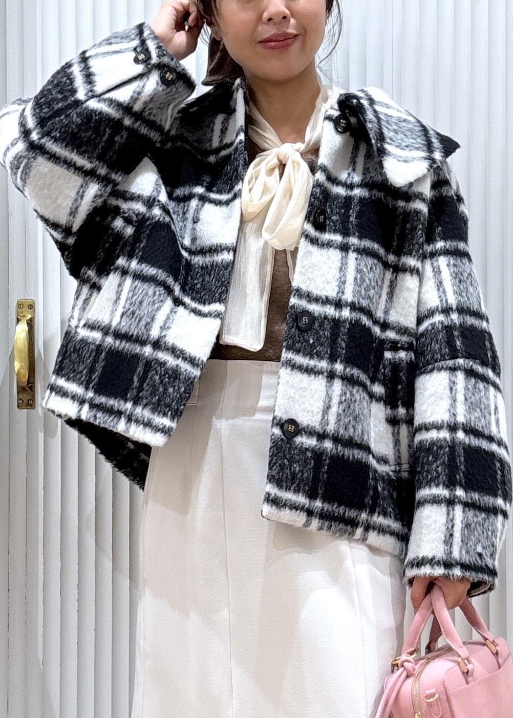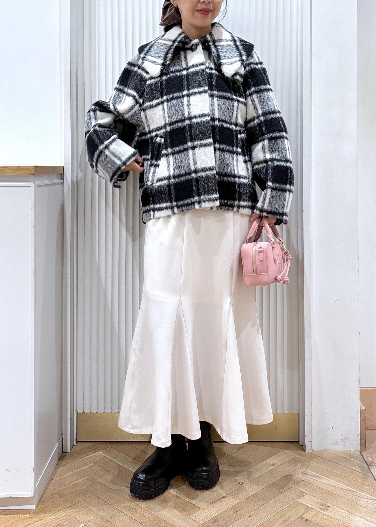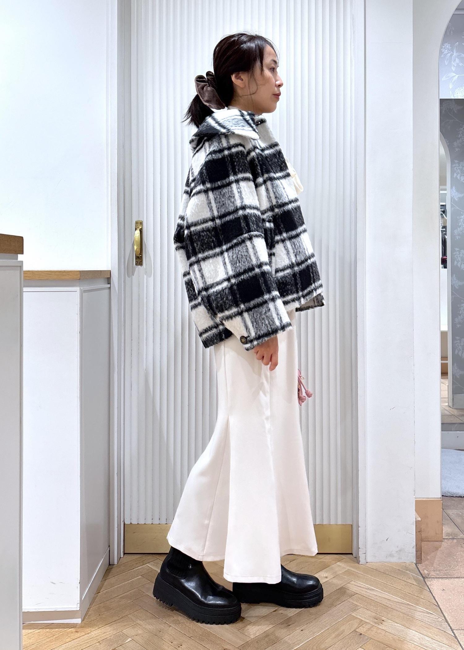 人気のモモンガコートの新色、チェックを主役にコーディネートしました。