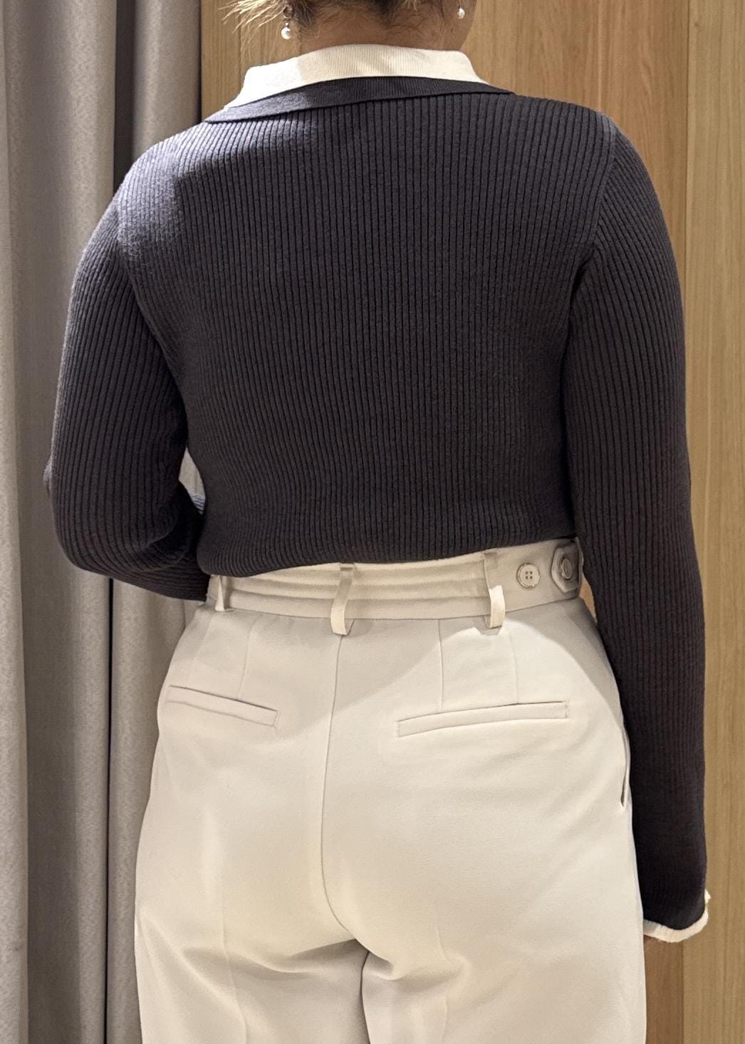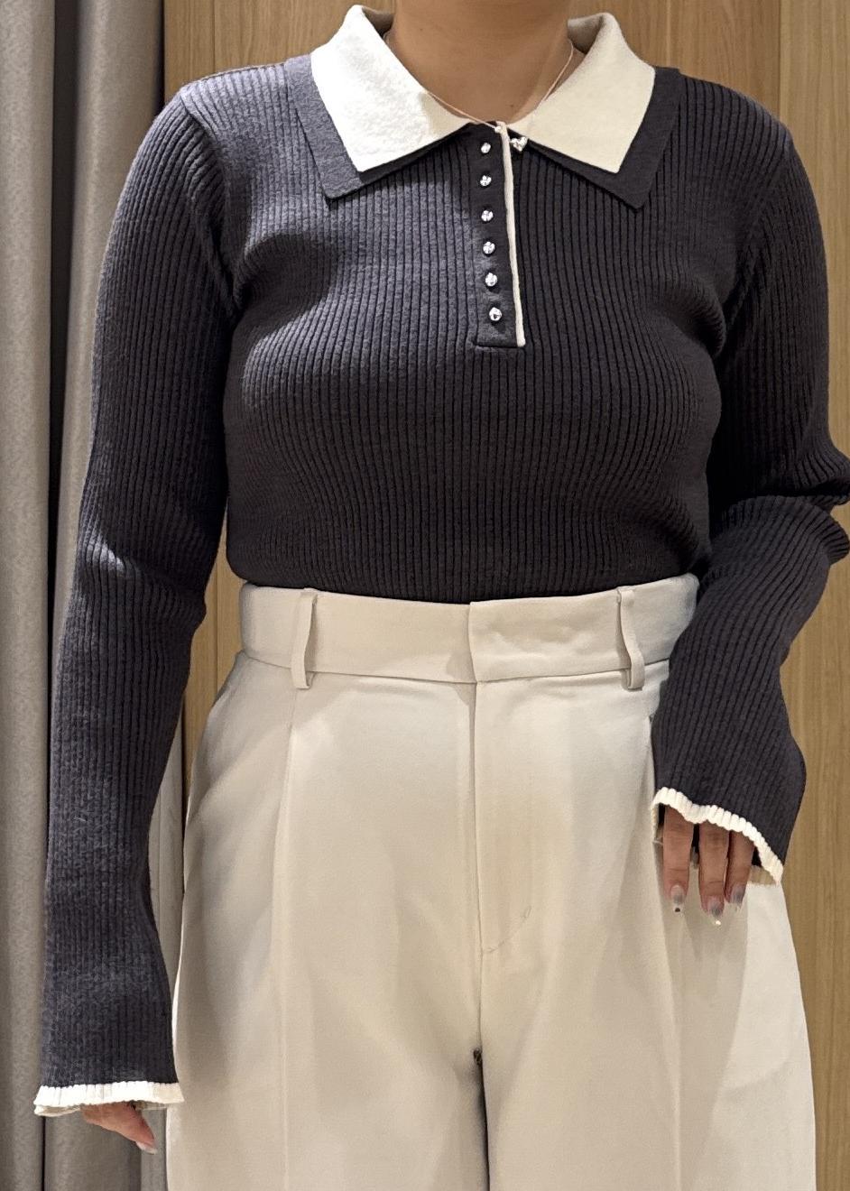 予約VISダブルカラーポロニットトップスチャコール / F¥5,929レビュー153cmの私ですが、袖は手の甲にかかるくらいです。