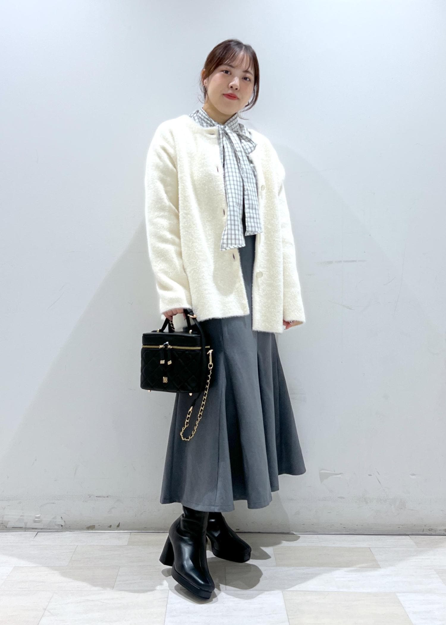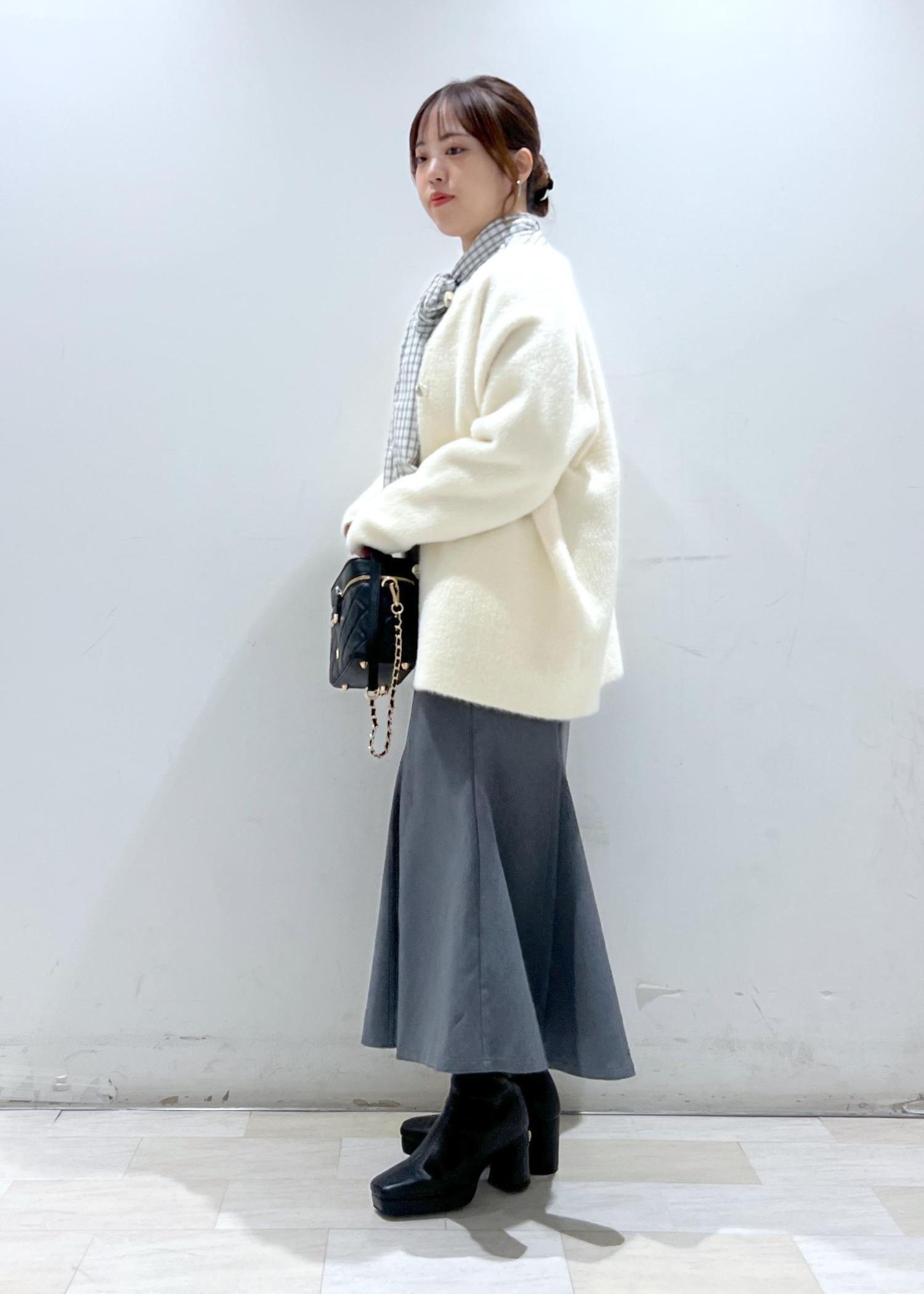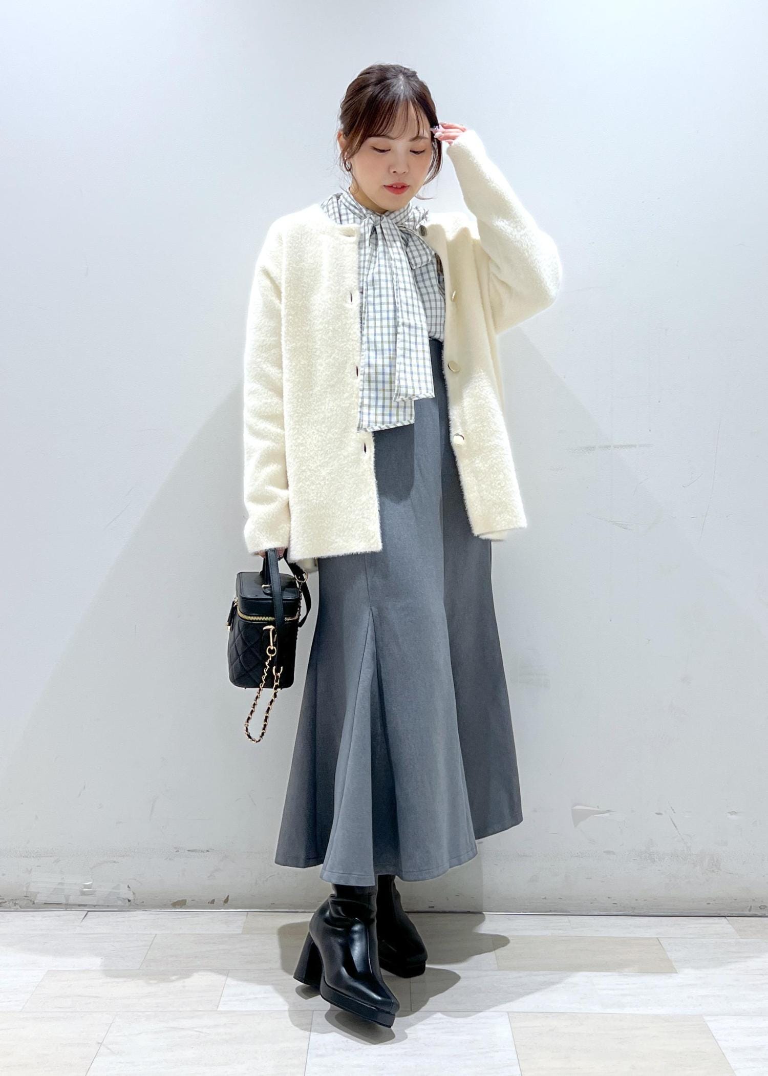 カーディガンのミニフェザーヤーンがふわふわとしていて、ブラウスとマーメイドスカートの綺麗めスタイルにも少し甘さが足されます○