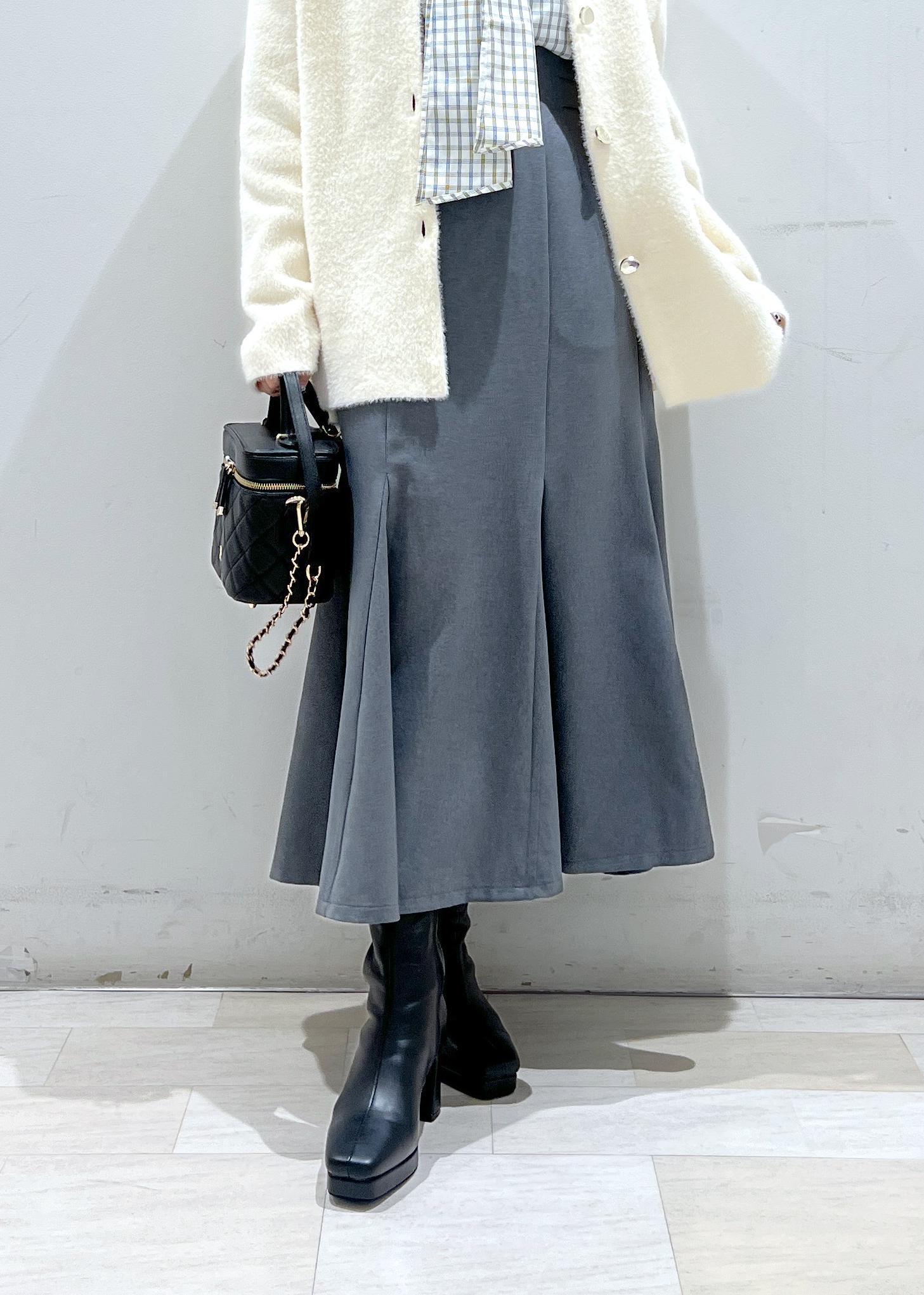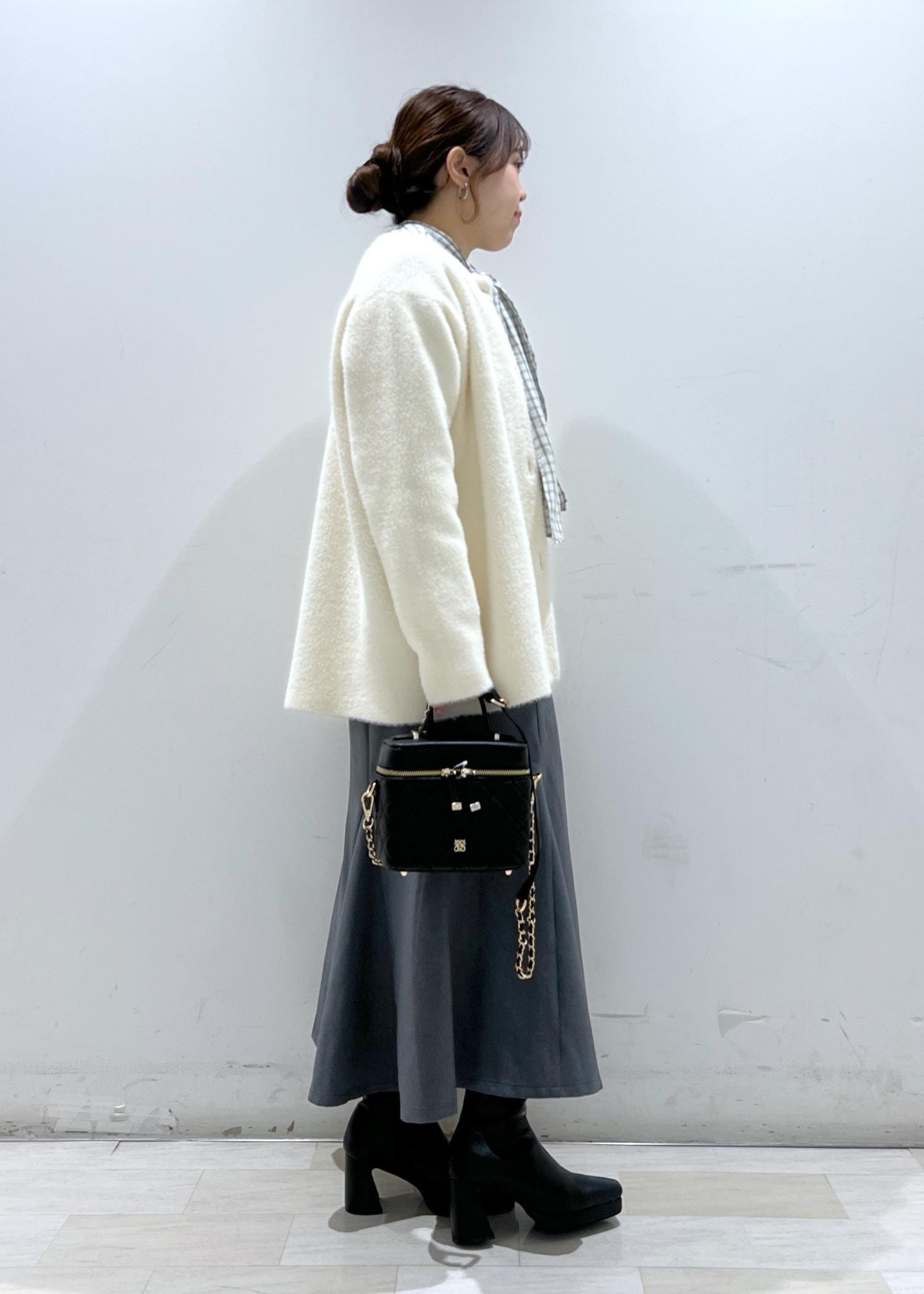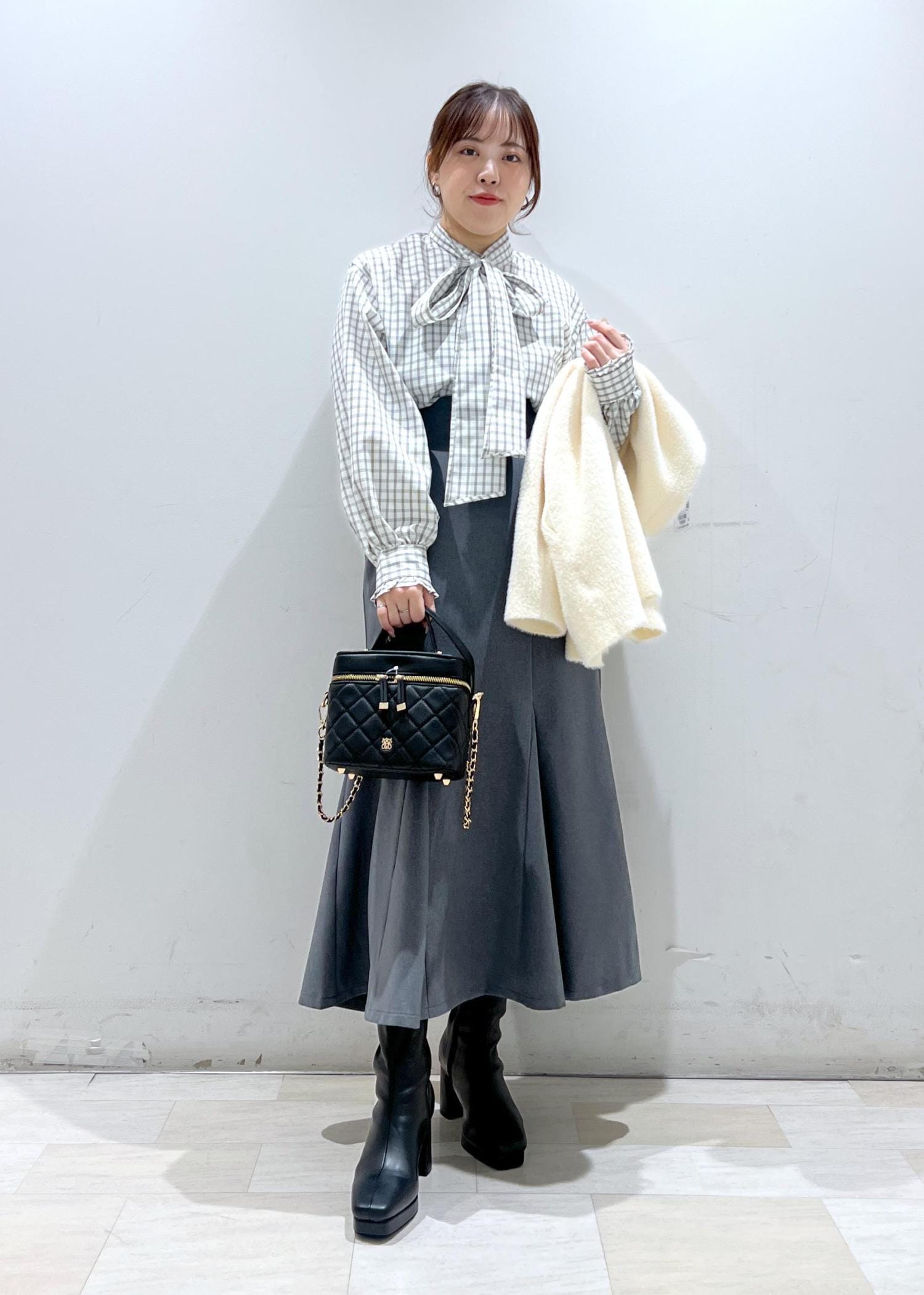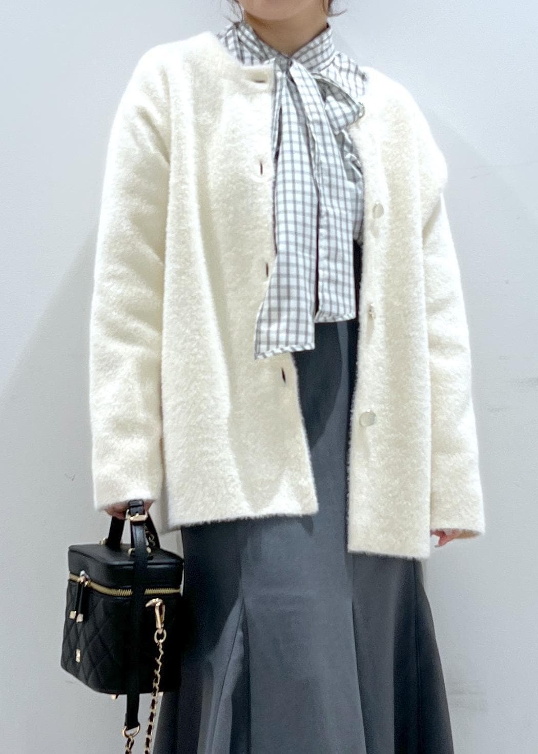 カーディガンのミニフェザーヤーンがふわふわとしていて、ブラウスとマーメイドスカートの綺麗めスタイルにも少し甘さが足されます○