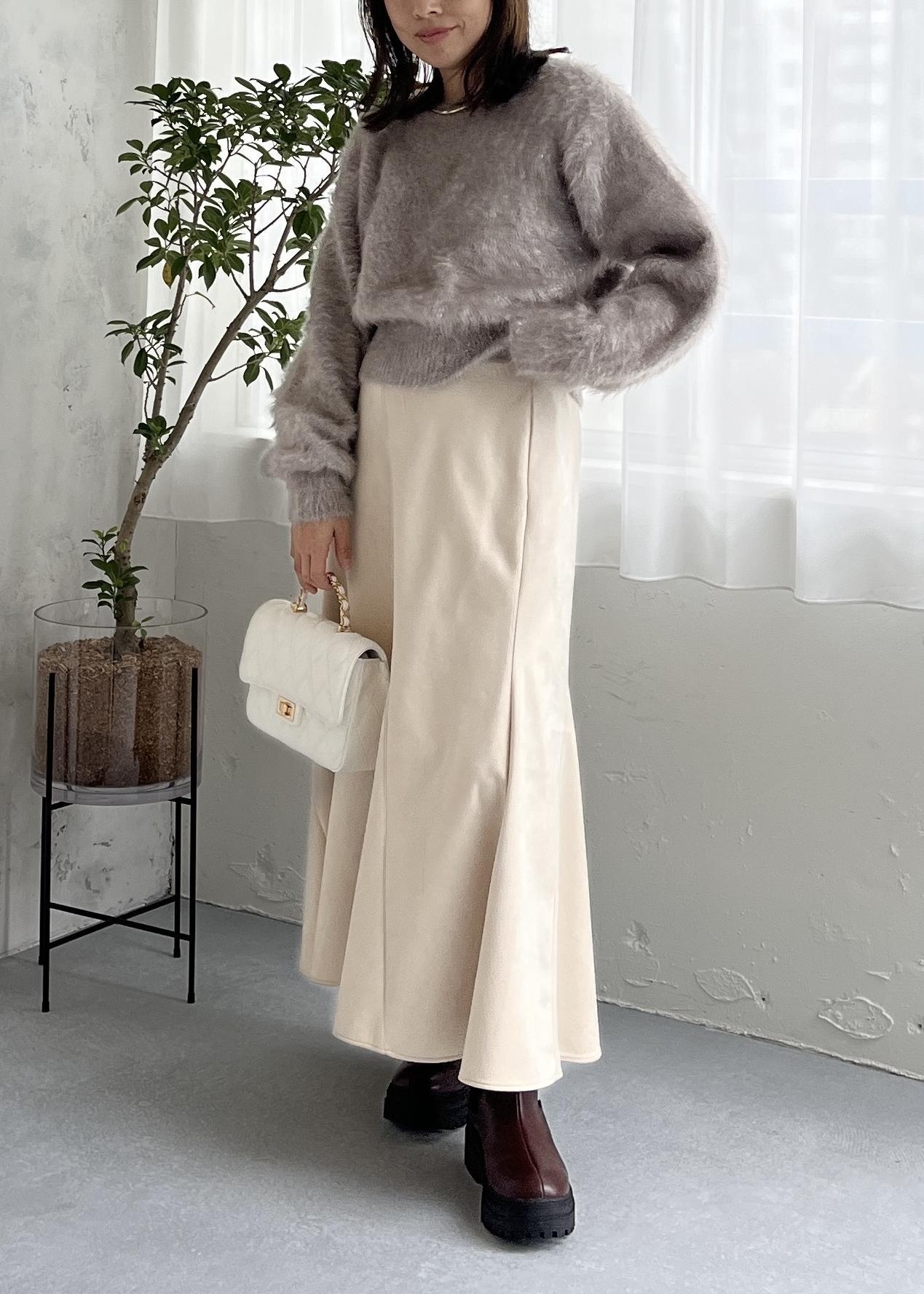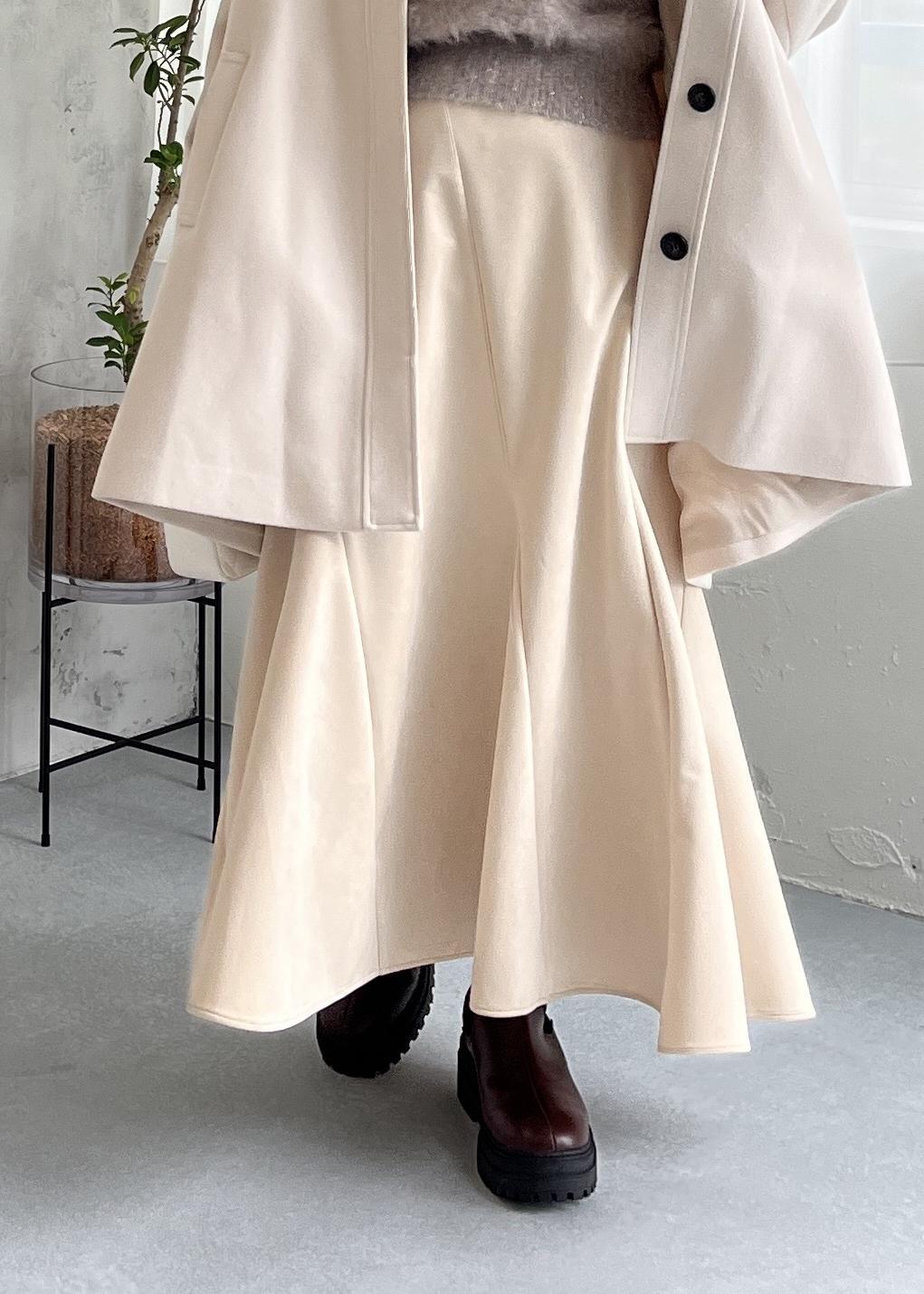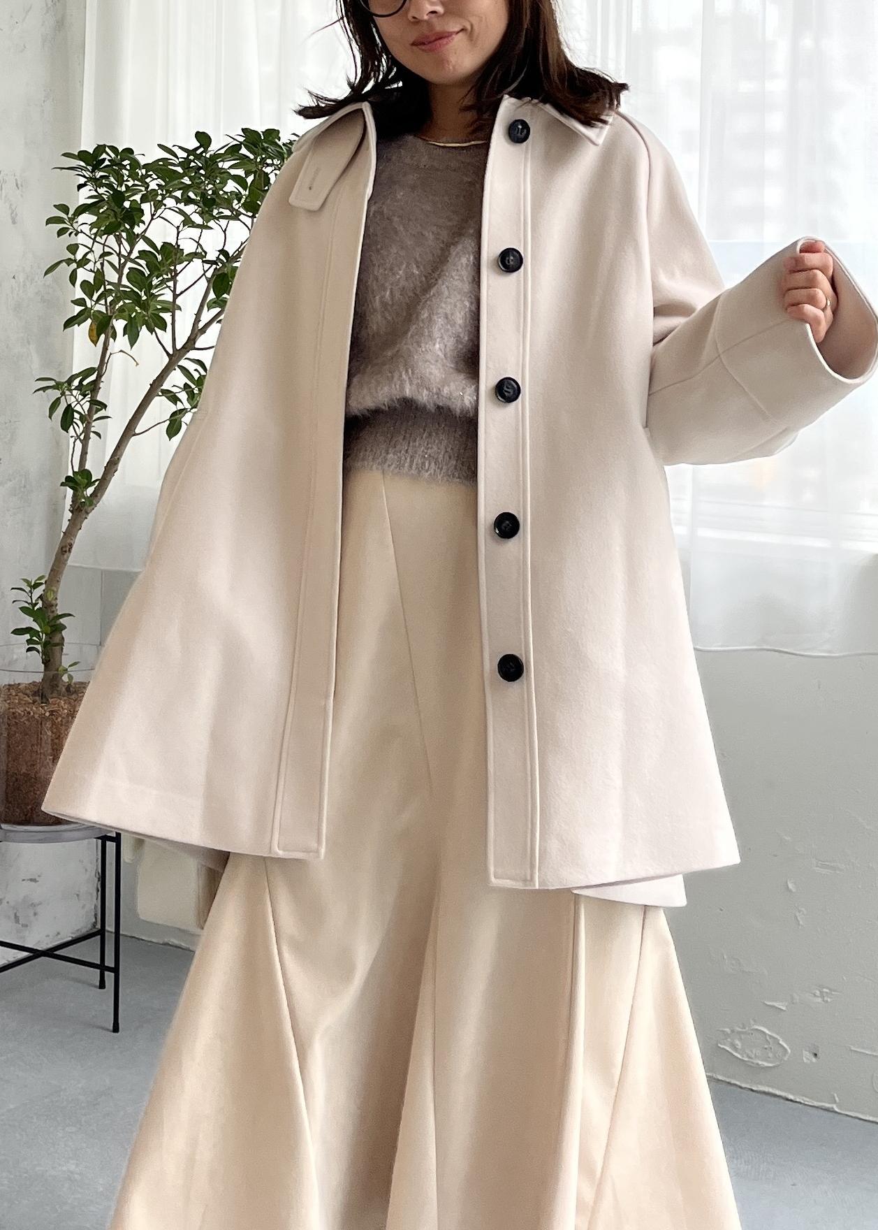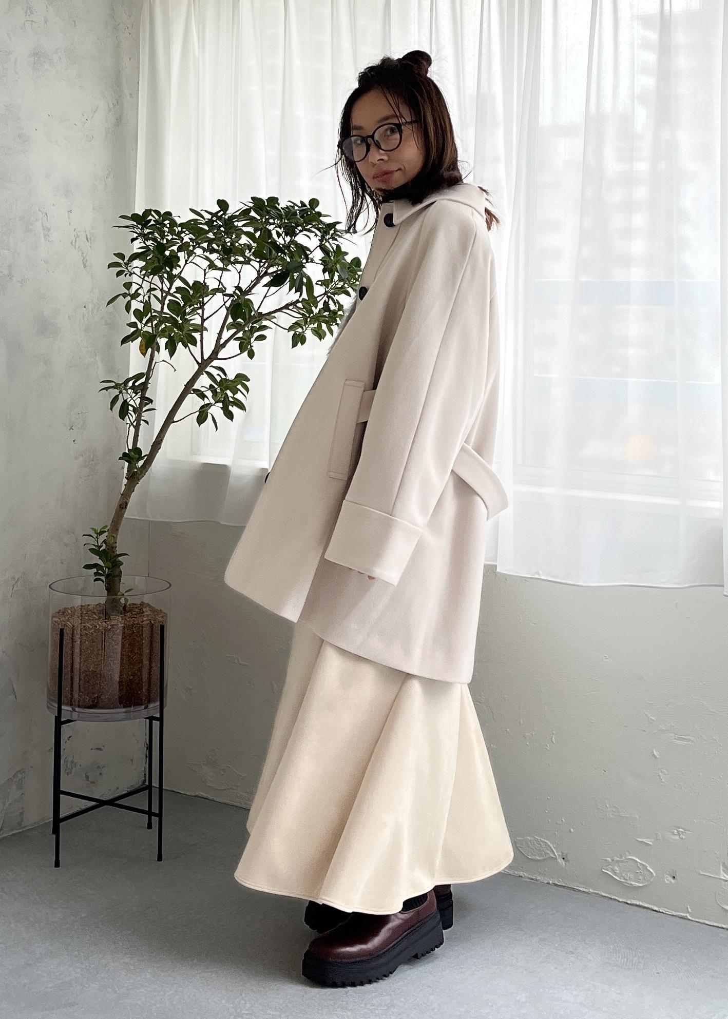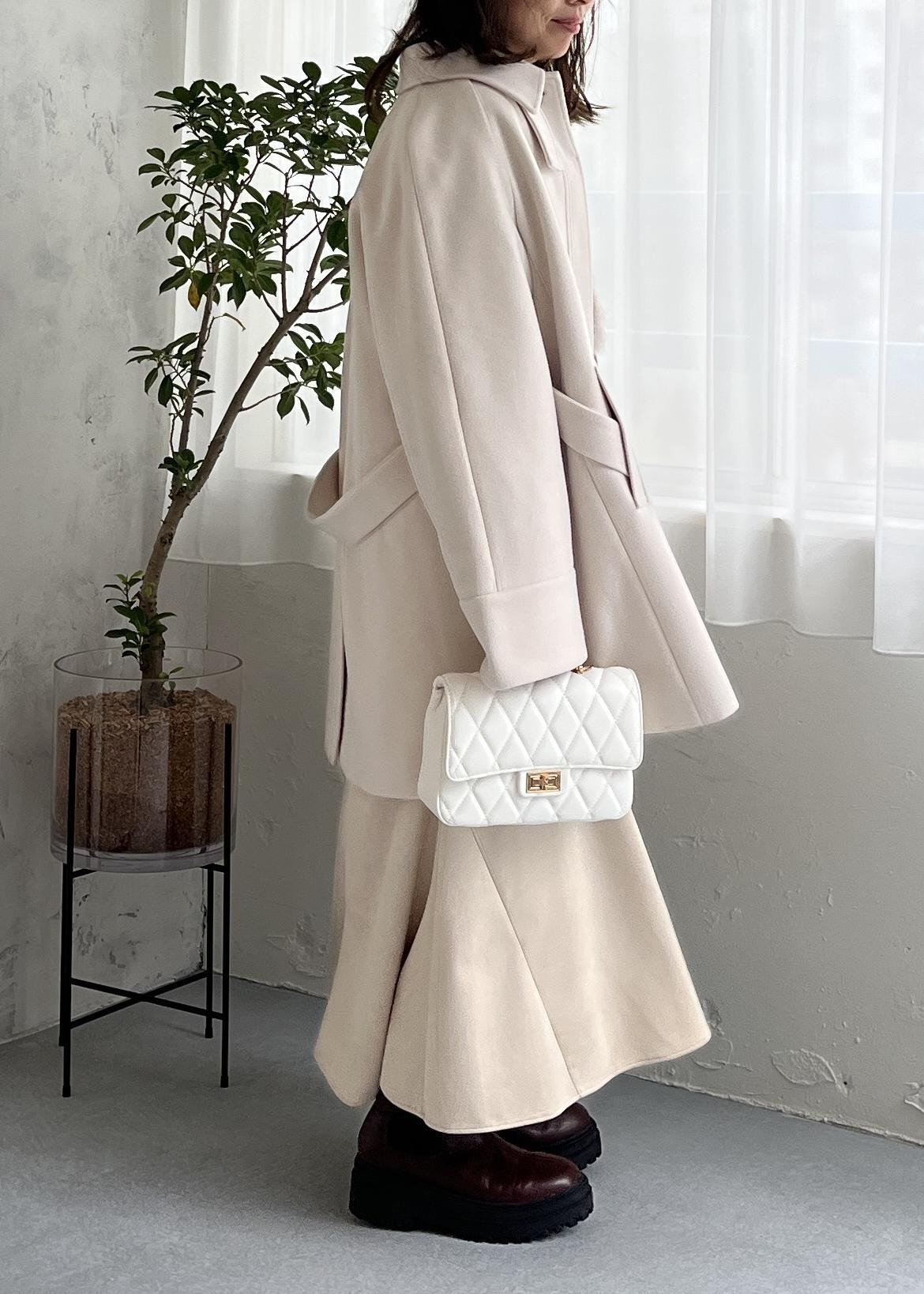 ふわっと広がるフレアスカートが、歩くたびに女っぽさをプラス。ゆるっと羽織れるAラインコートは、肩まわりがすっきり見え◎トップスはほんのり起毛感のあるニットで、ほっこりしすぎず大人っぽく。