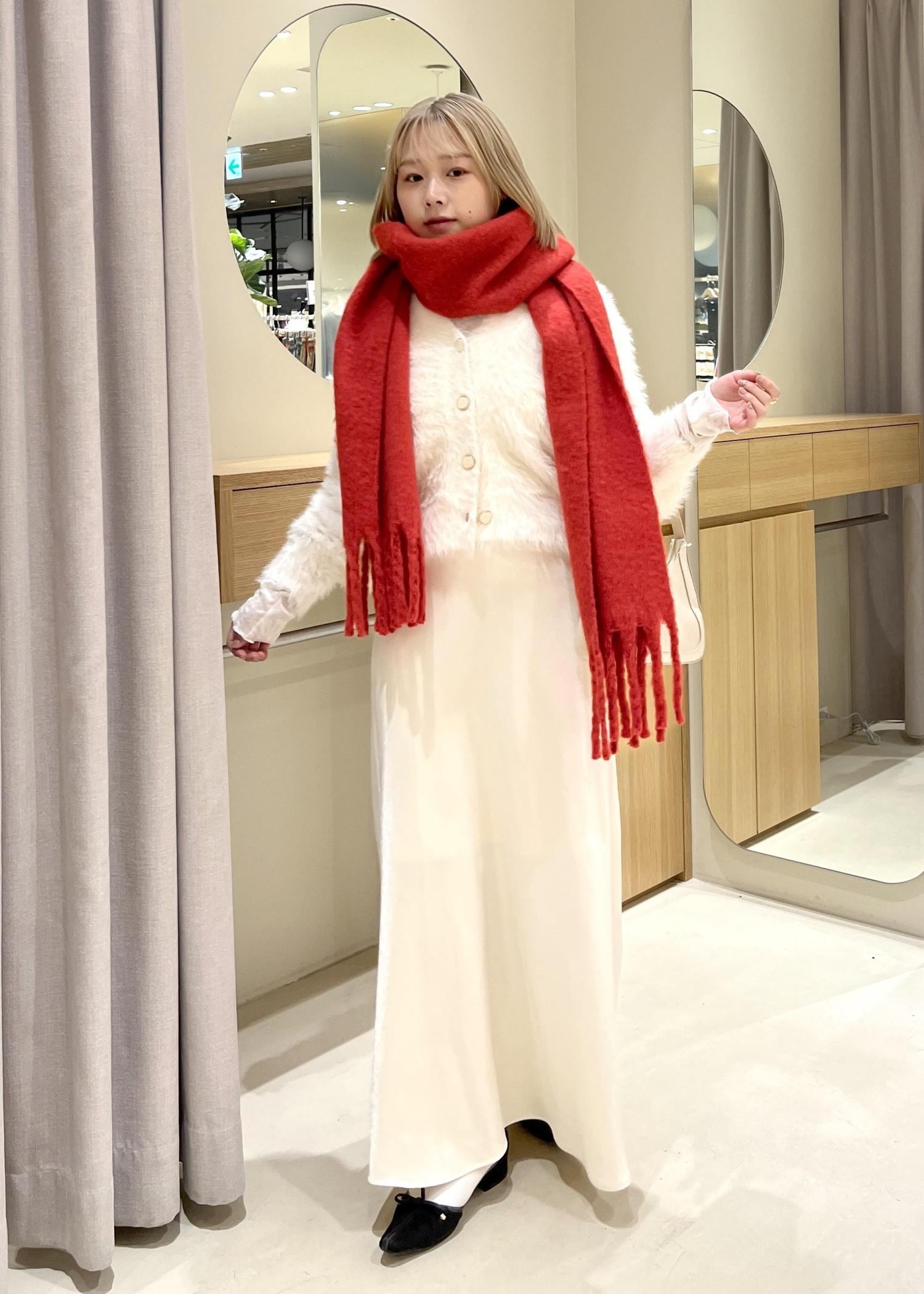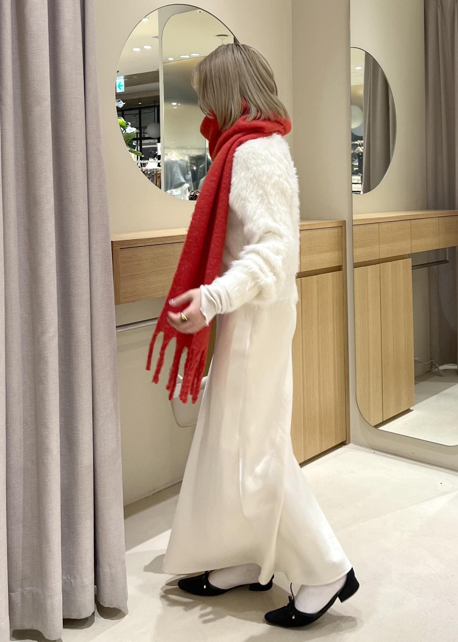 オールホワイトでまとめ、赤のマフラーを差し色に持ってきた