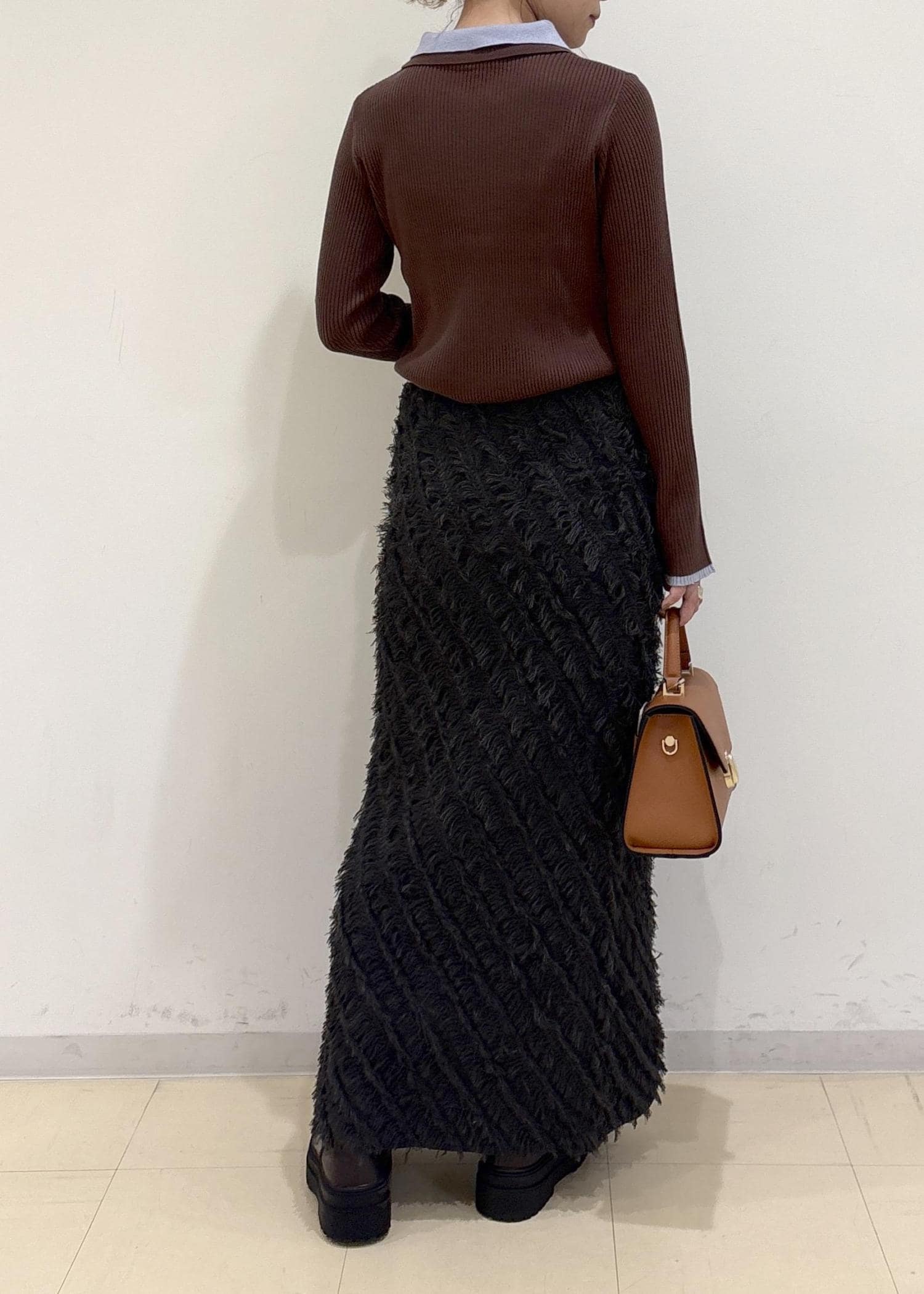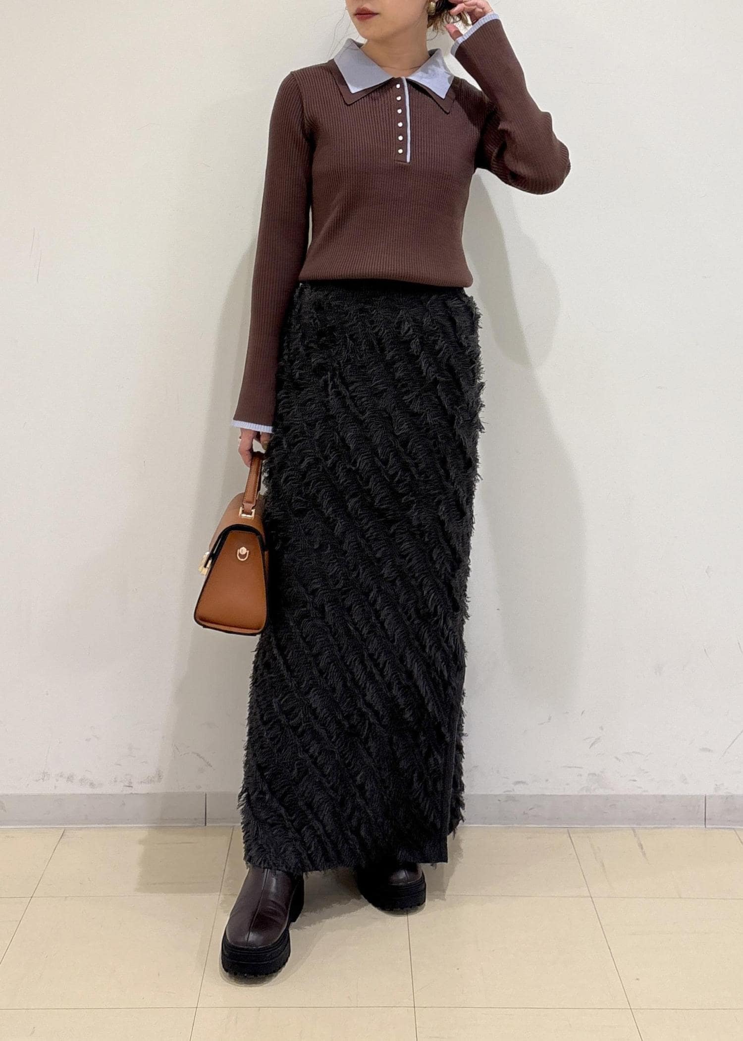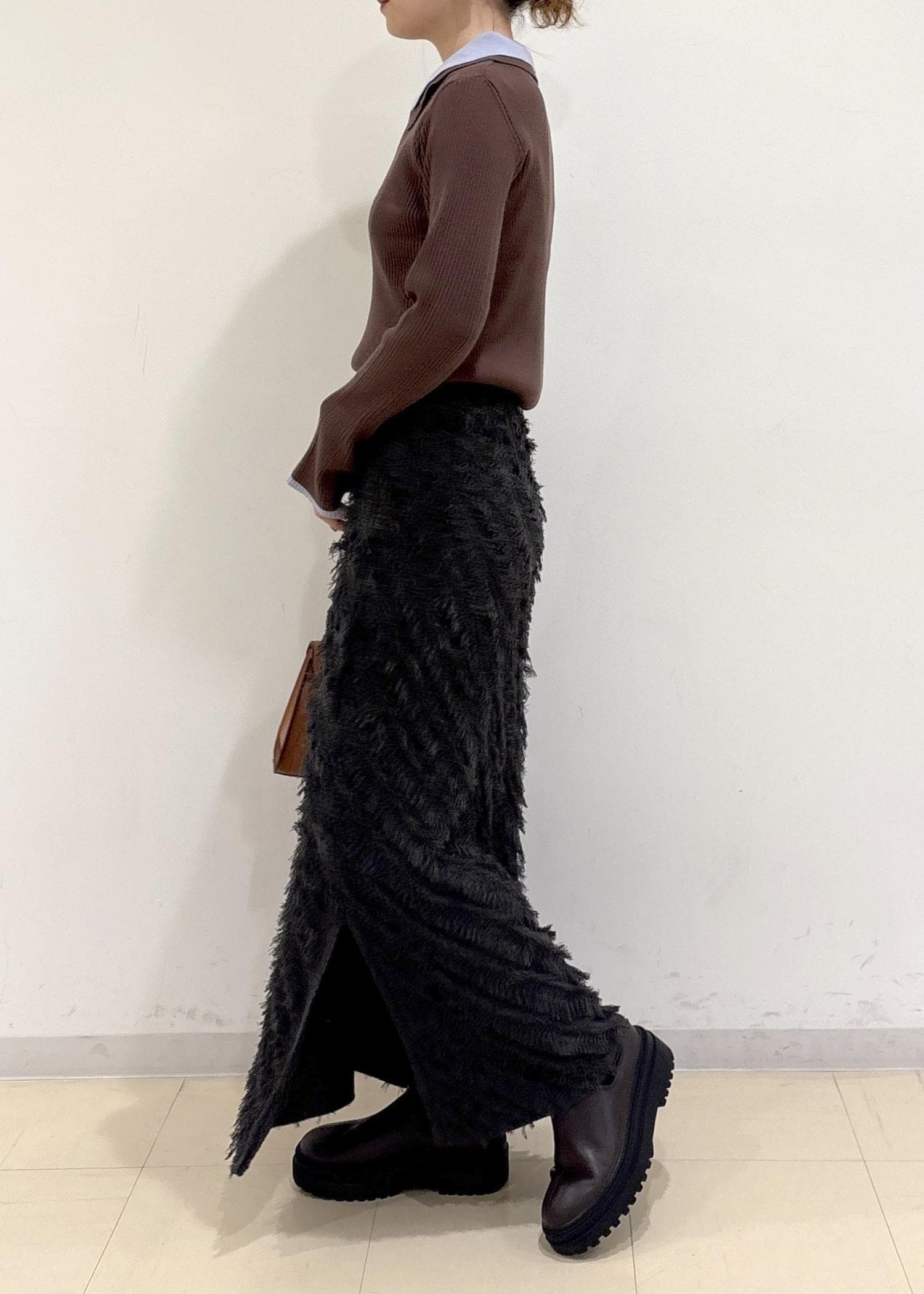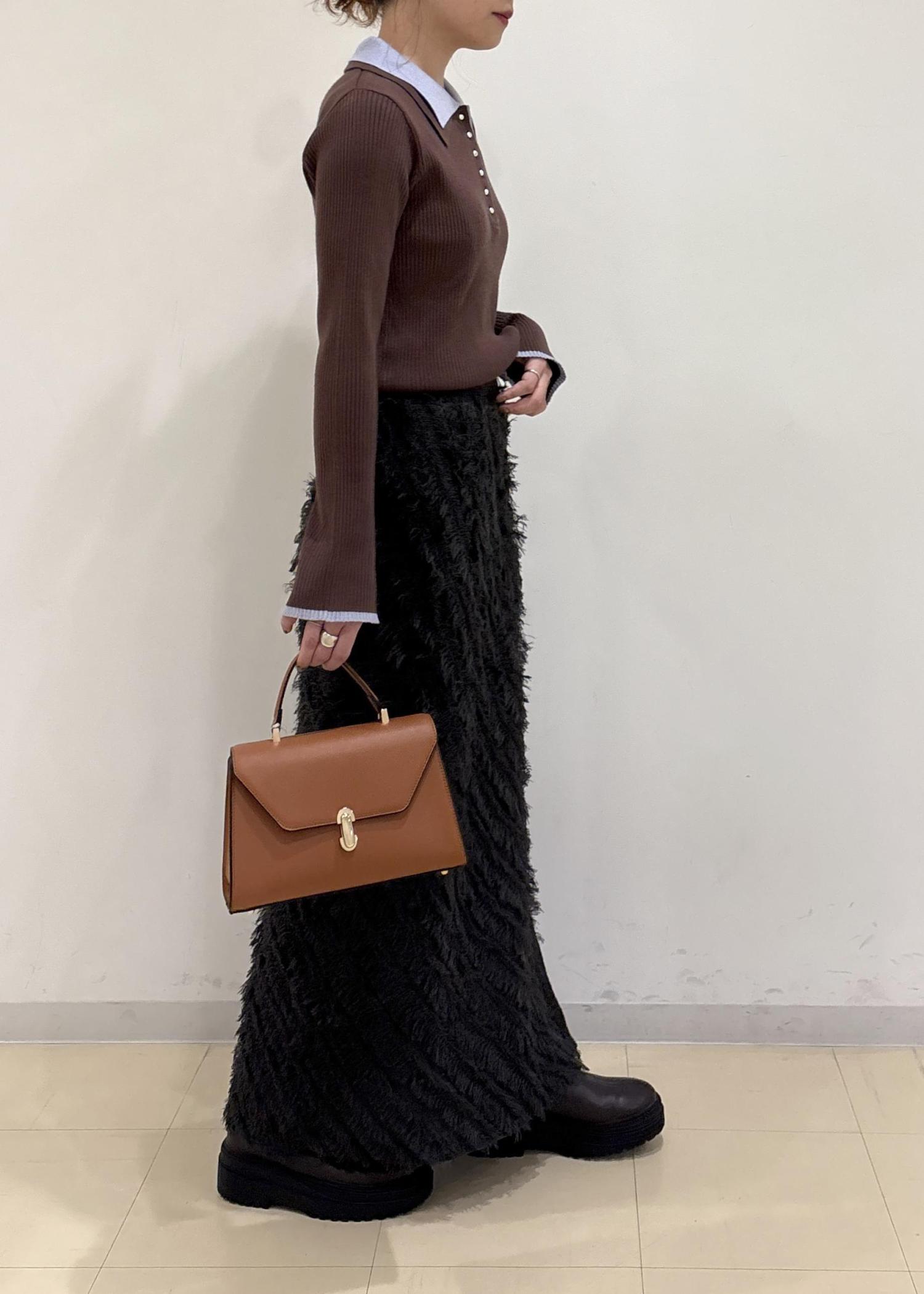 フリンジ素材で骨盤周りが強調されないかなと思いましたが、ロングな丈感だったのでバランスがとれました◎
