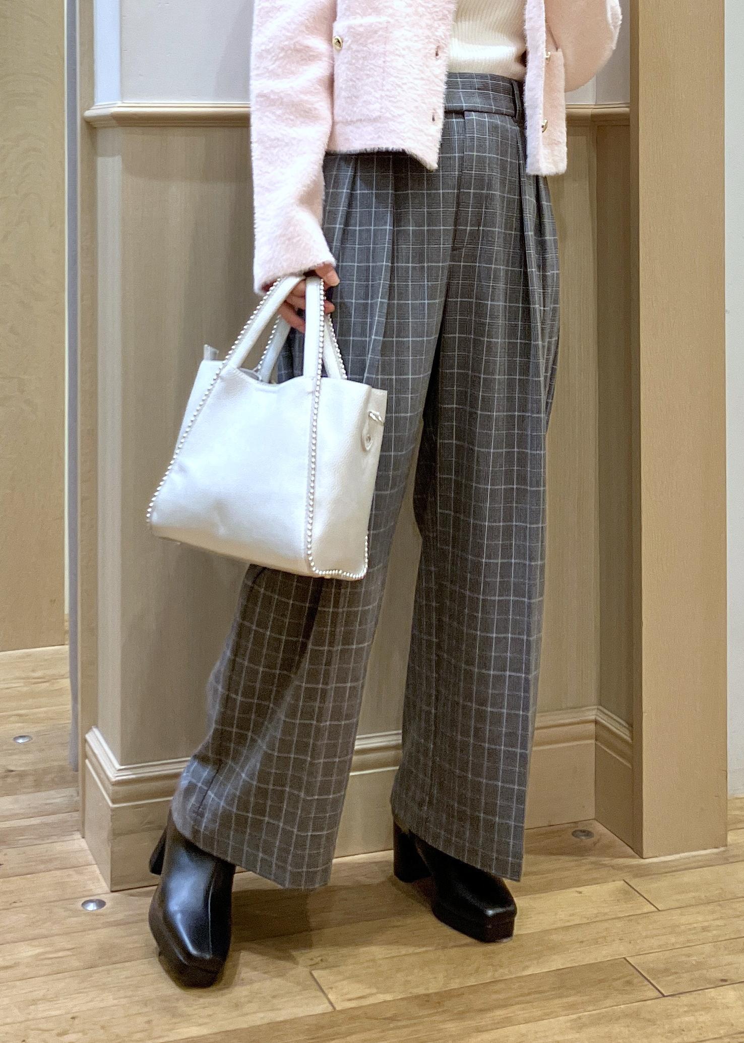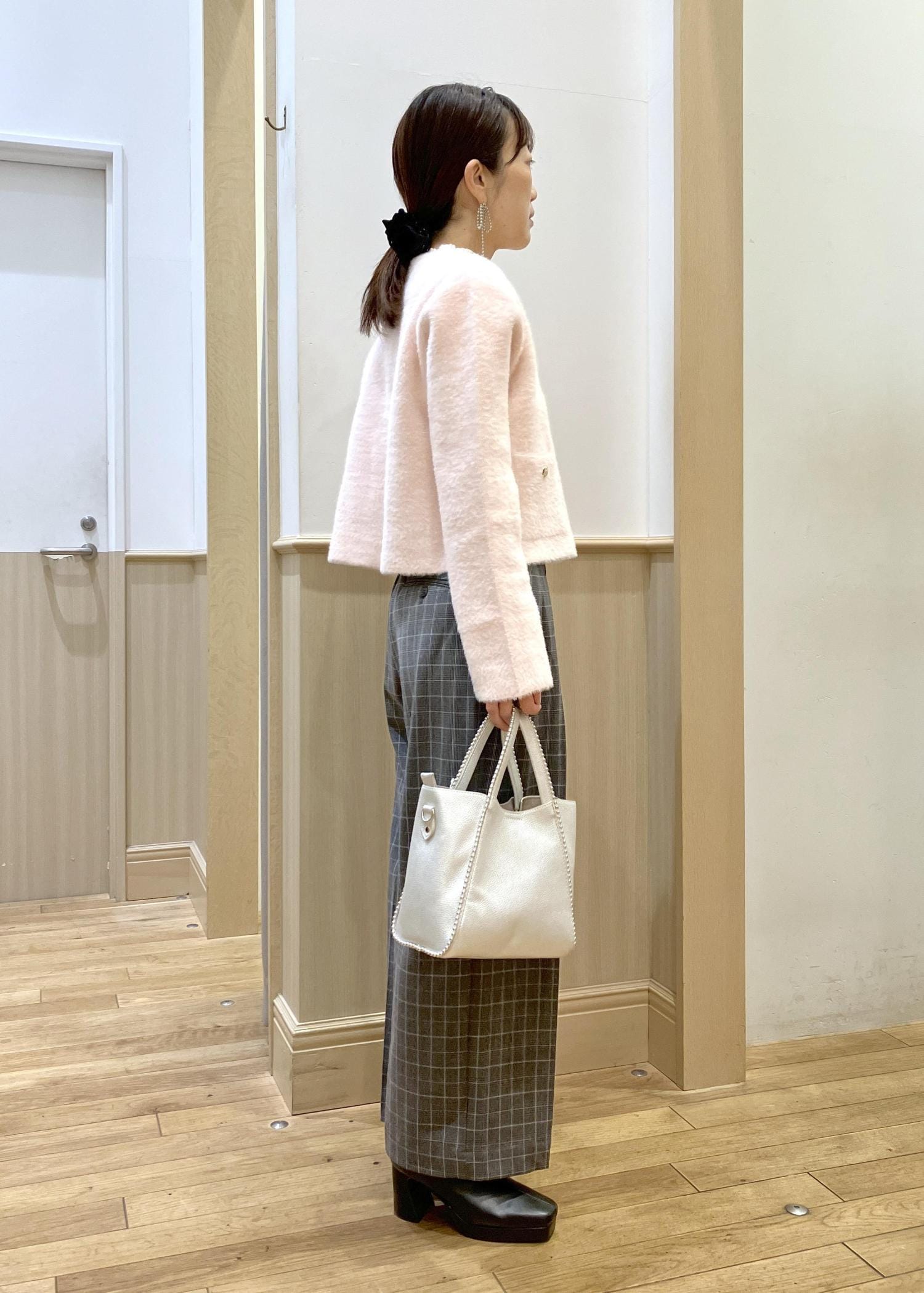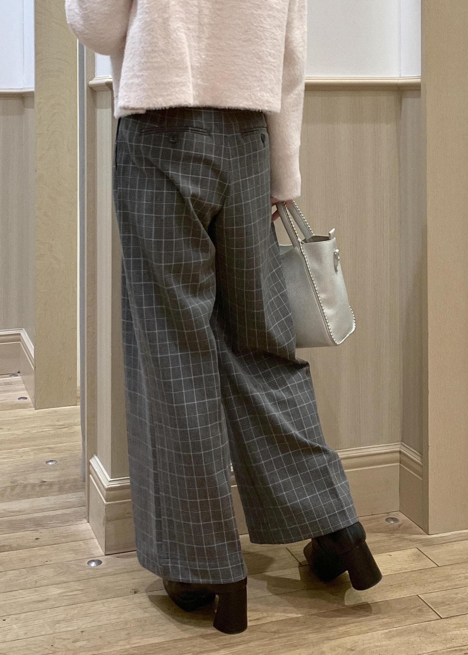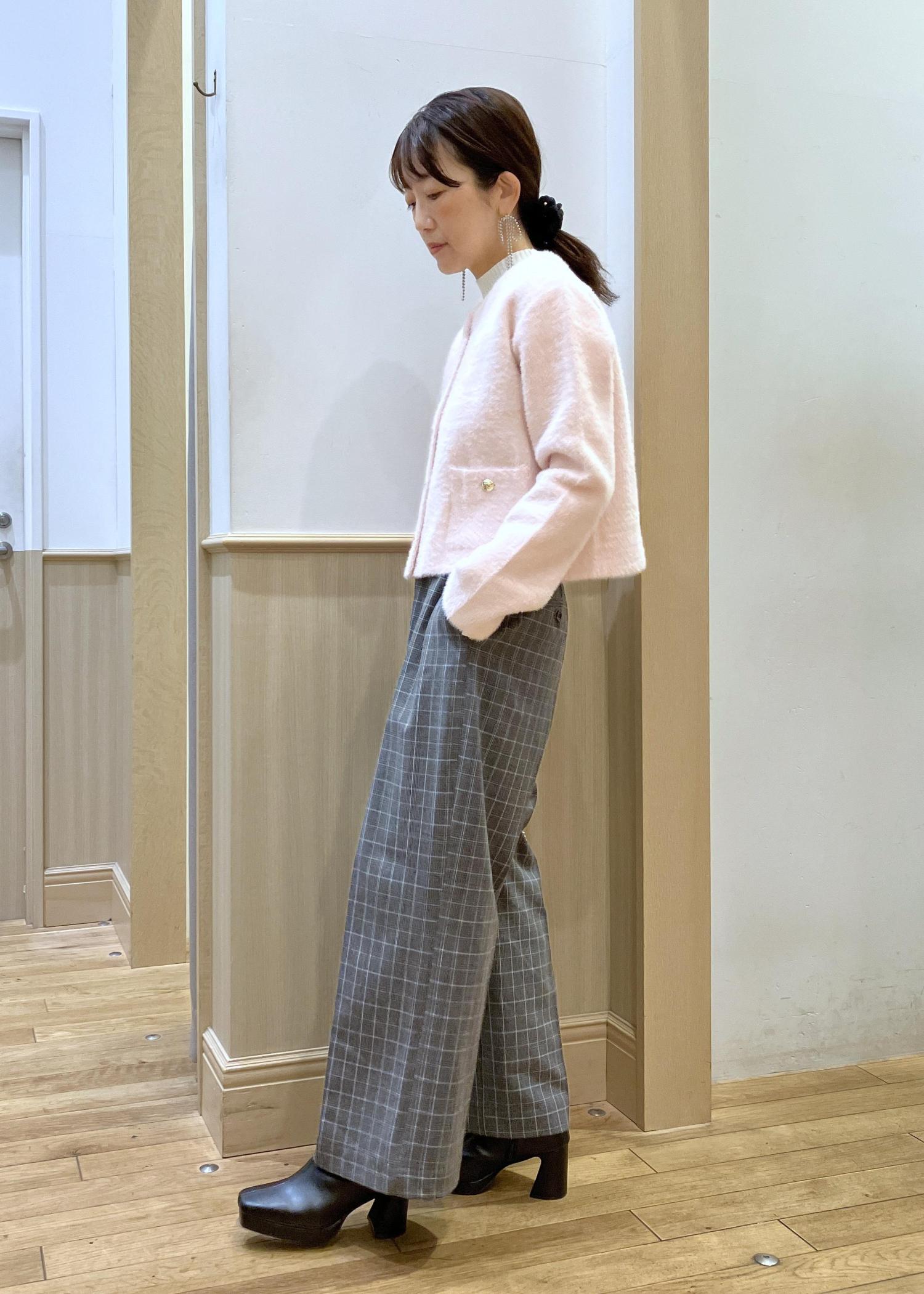 女子感高めのピンクカラーカーデを大人女子としてチェック柄のワイドパンツを合わせて落ち着いた雰囲気にしたのがポイントです。