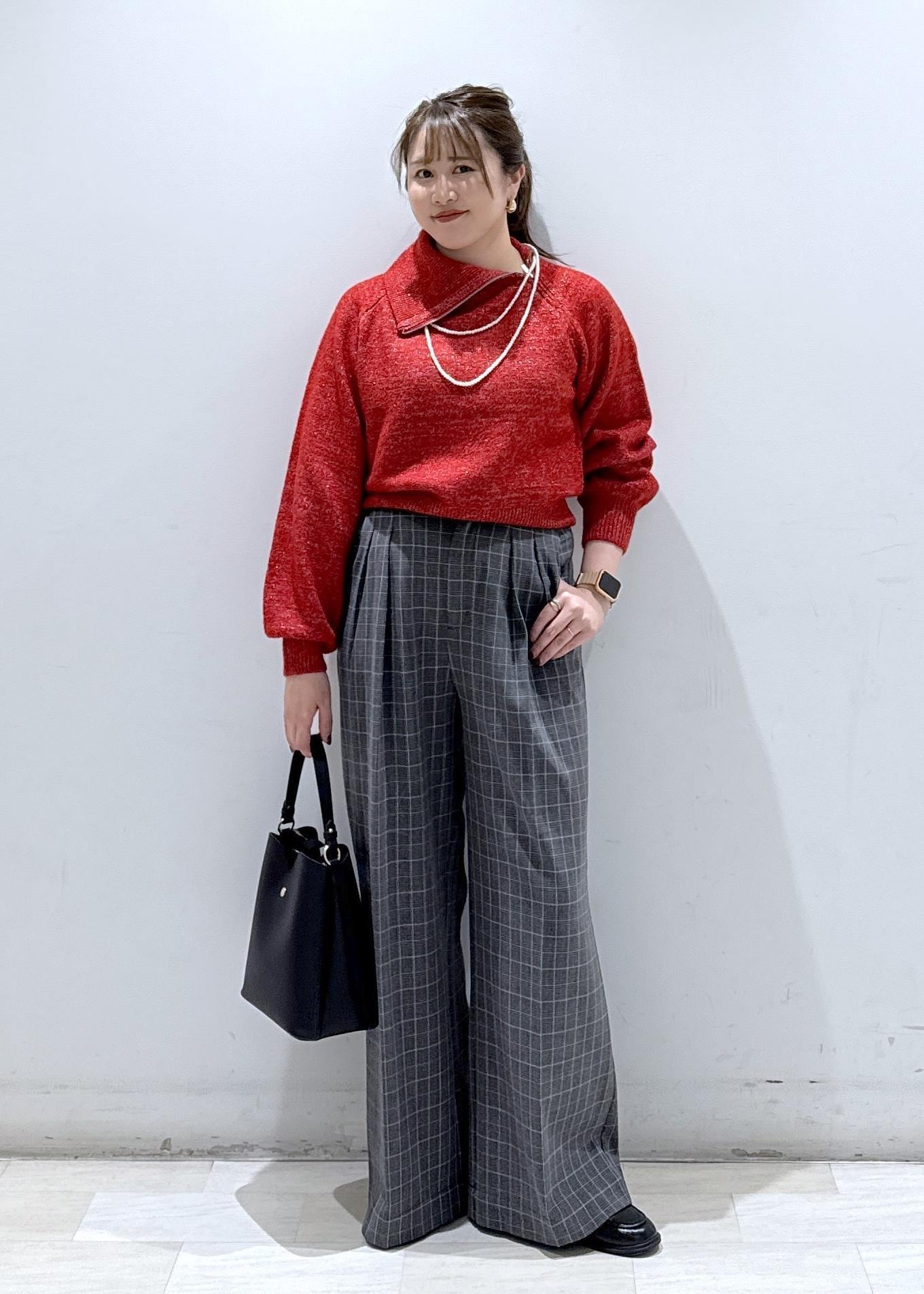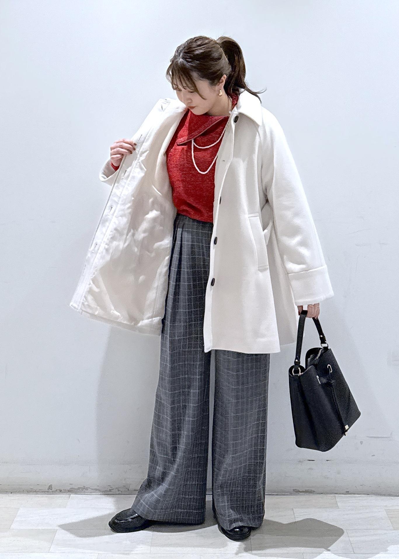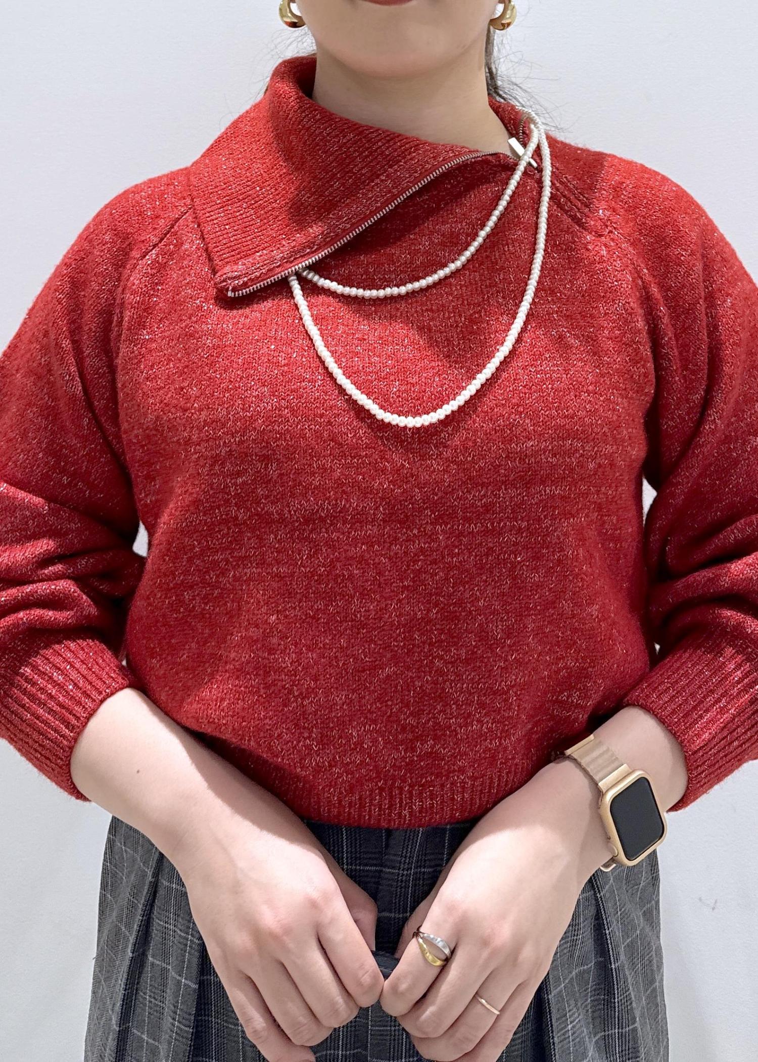 今回は新作で入荷しました赤のフロントジップニットに、ワイドパンツを合わせて綺麗めなスタイリングにしてみました。