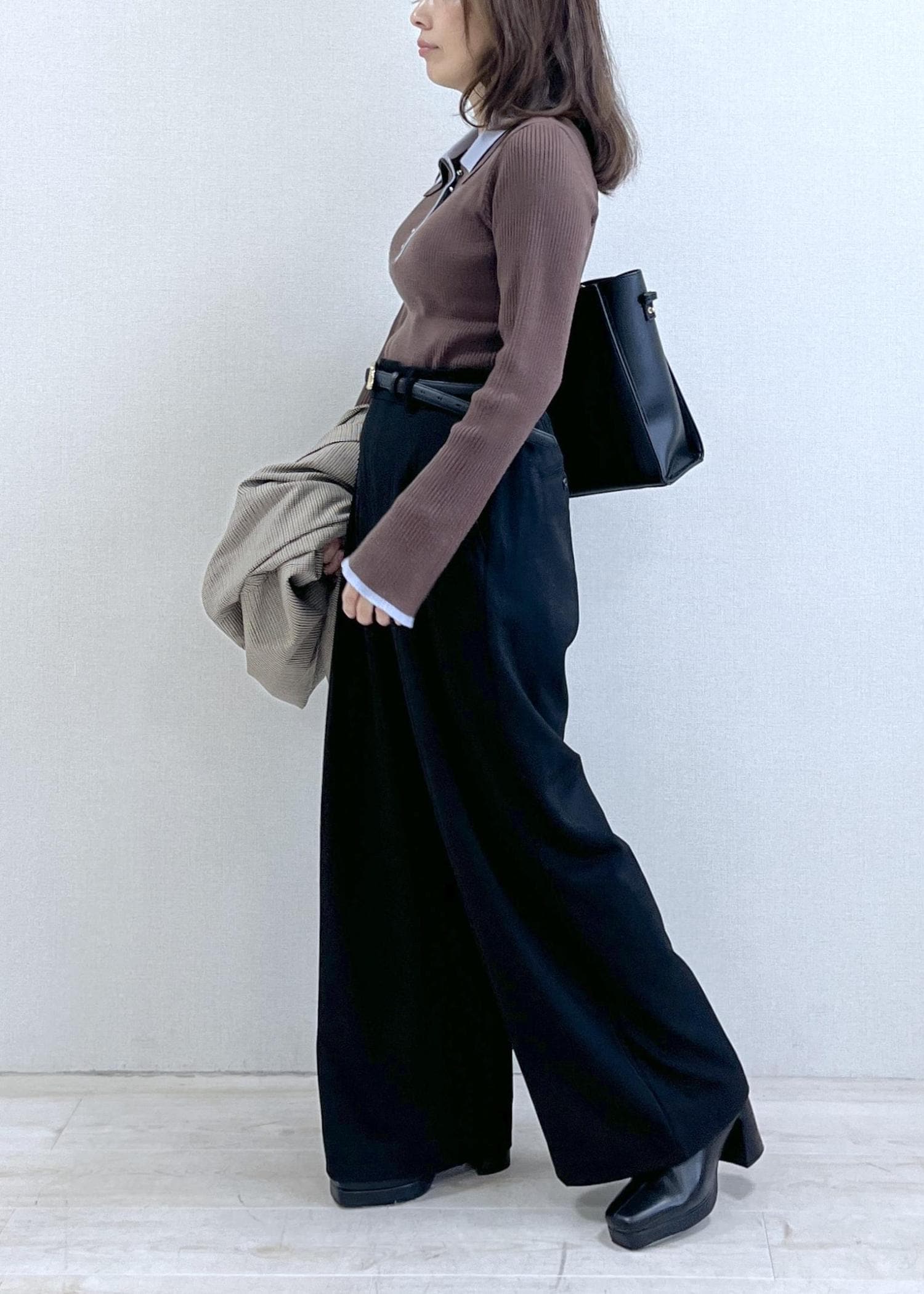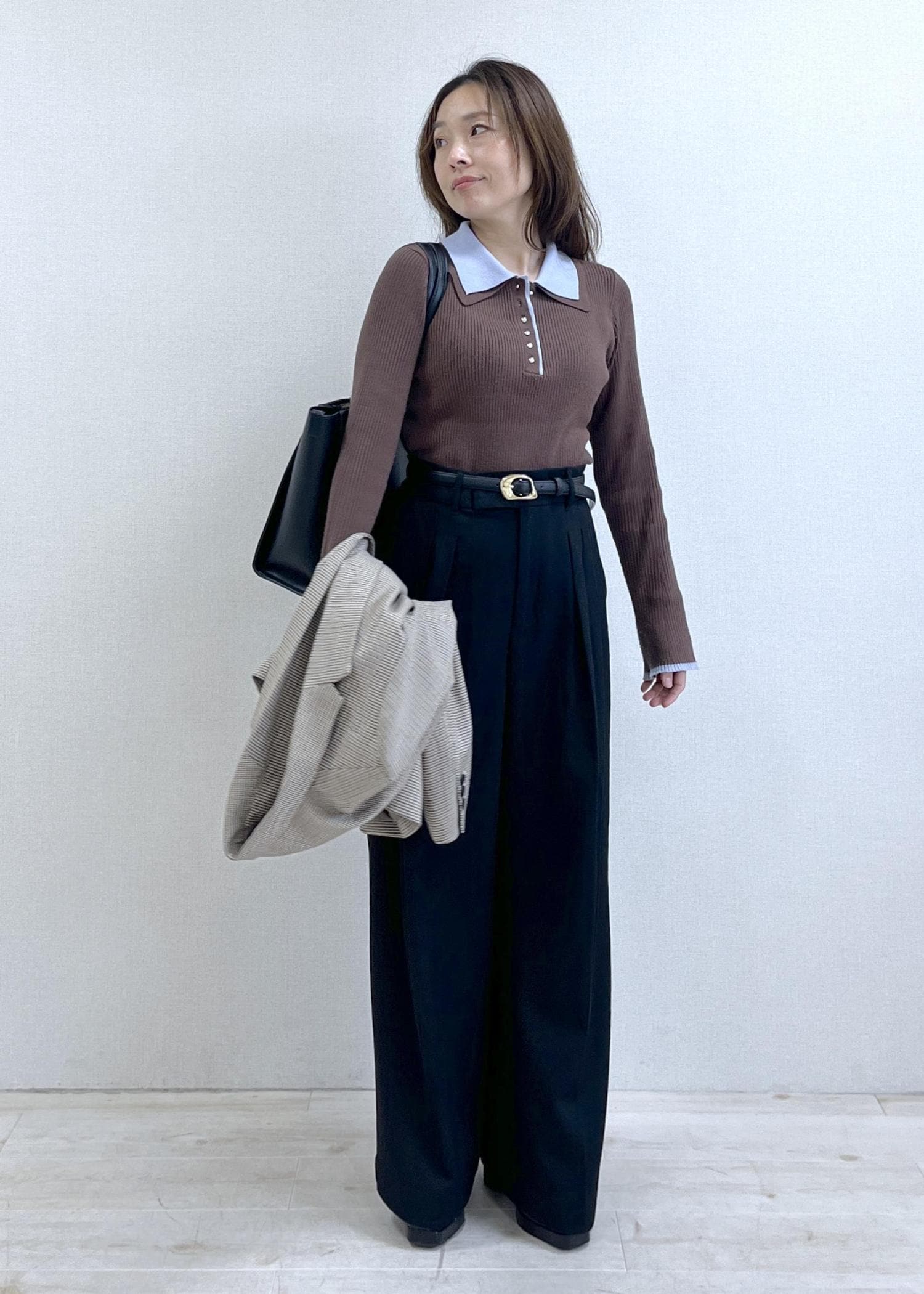 ハイウエストのワイドパンツは脚長効果が抜群で、スタイルアップが自然に叶います