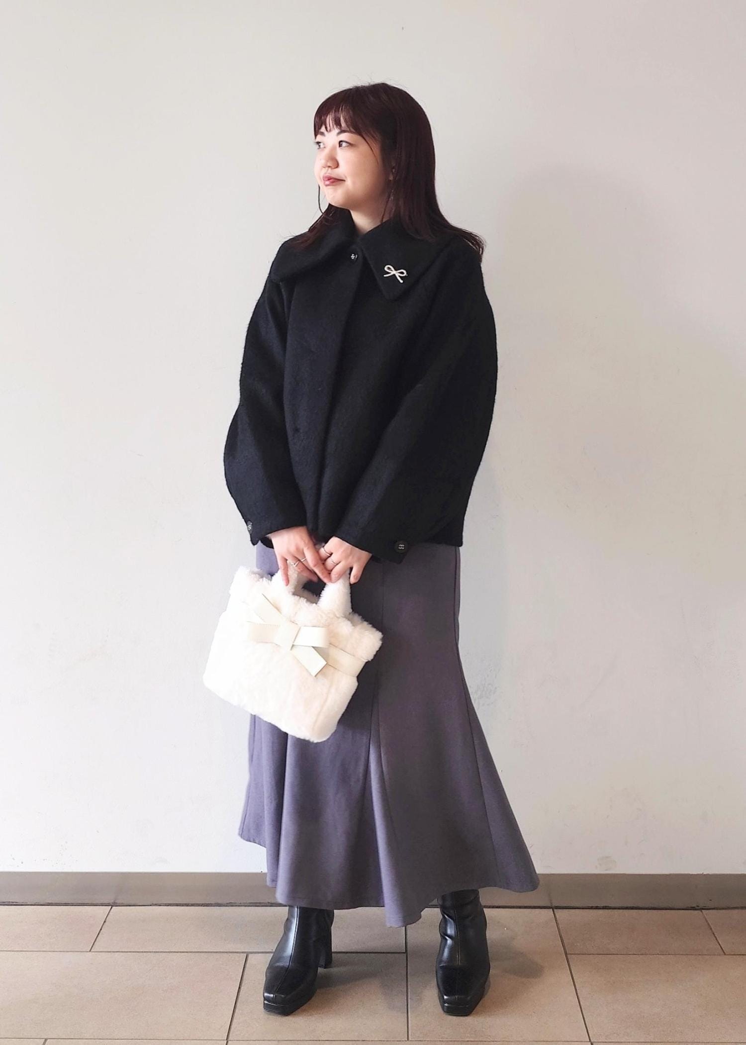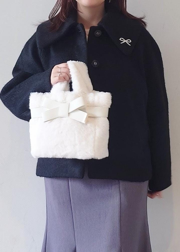 ファーバッグとリボンのブローチでフェミニンさUP。