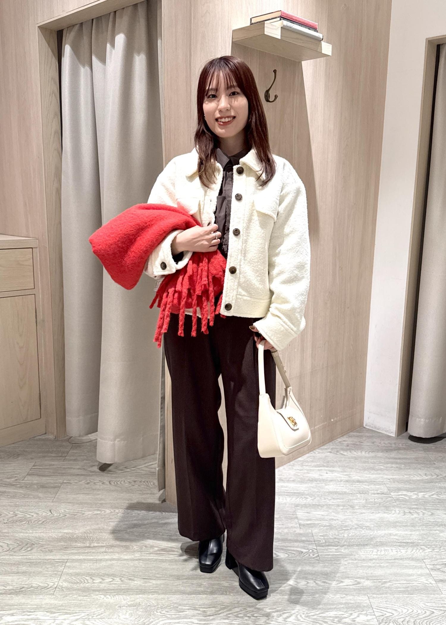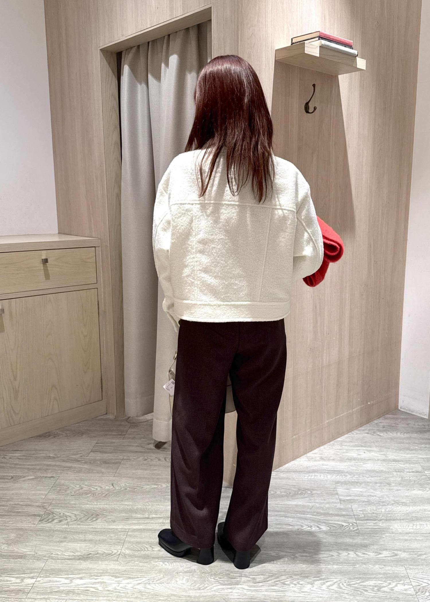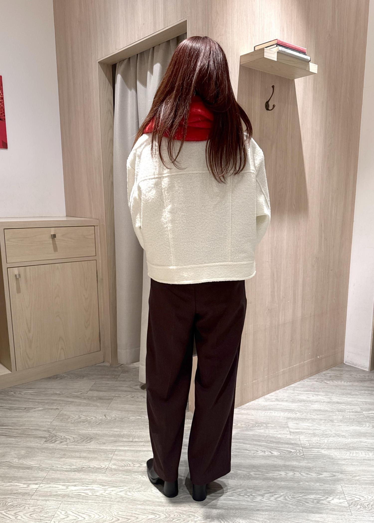 ヒップにかかる丈感でした。ポケットが4つ着いており、デザイン性の高いコートです✨横幅はゆったりしているため、厚めのトップスを中に来ても着膨れしにくいサイズ感です! -